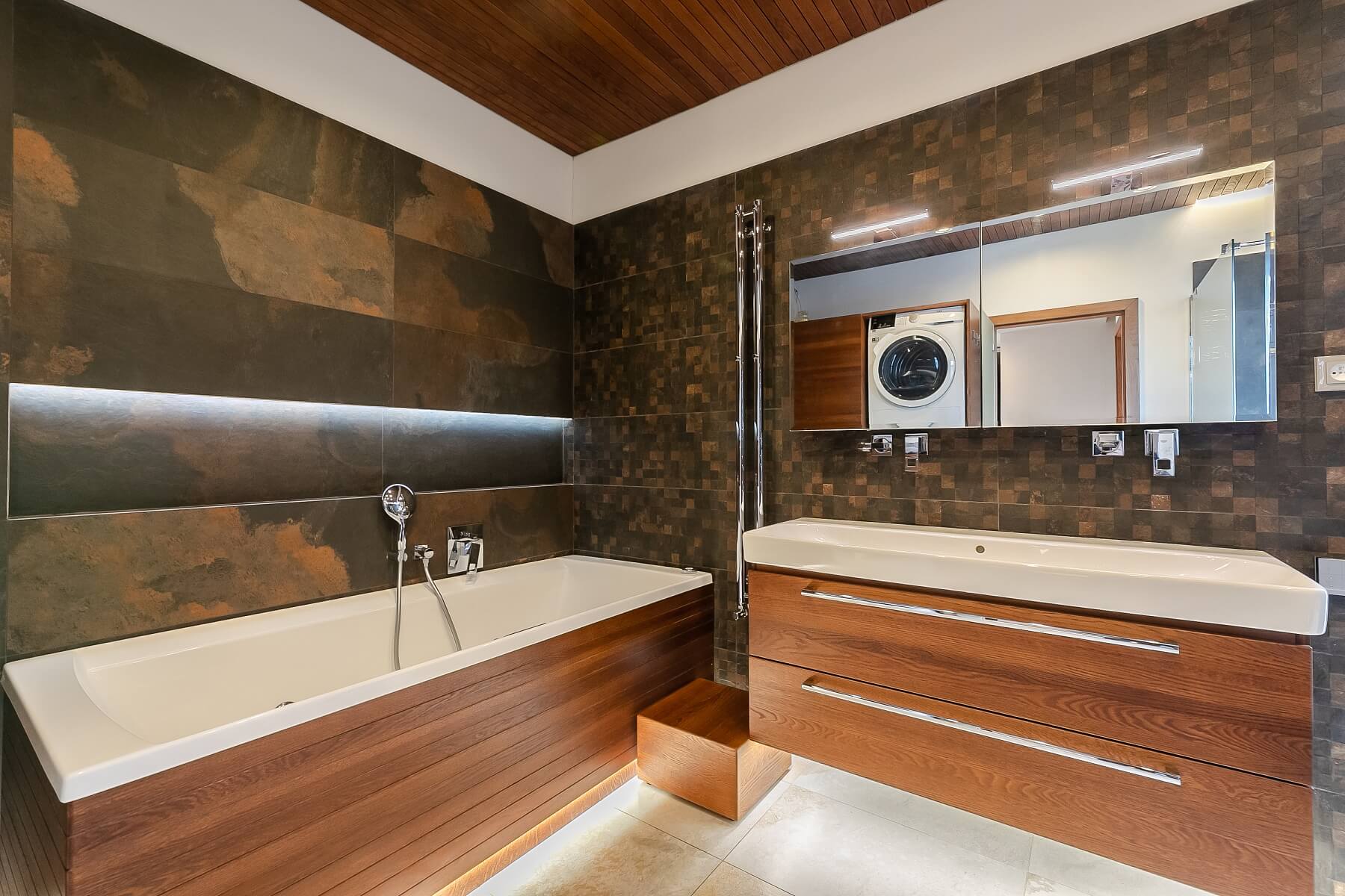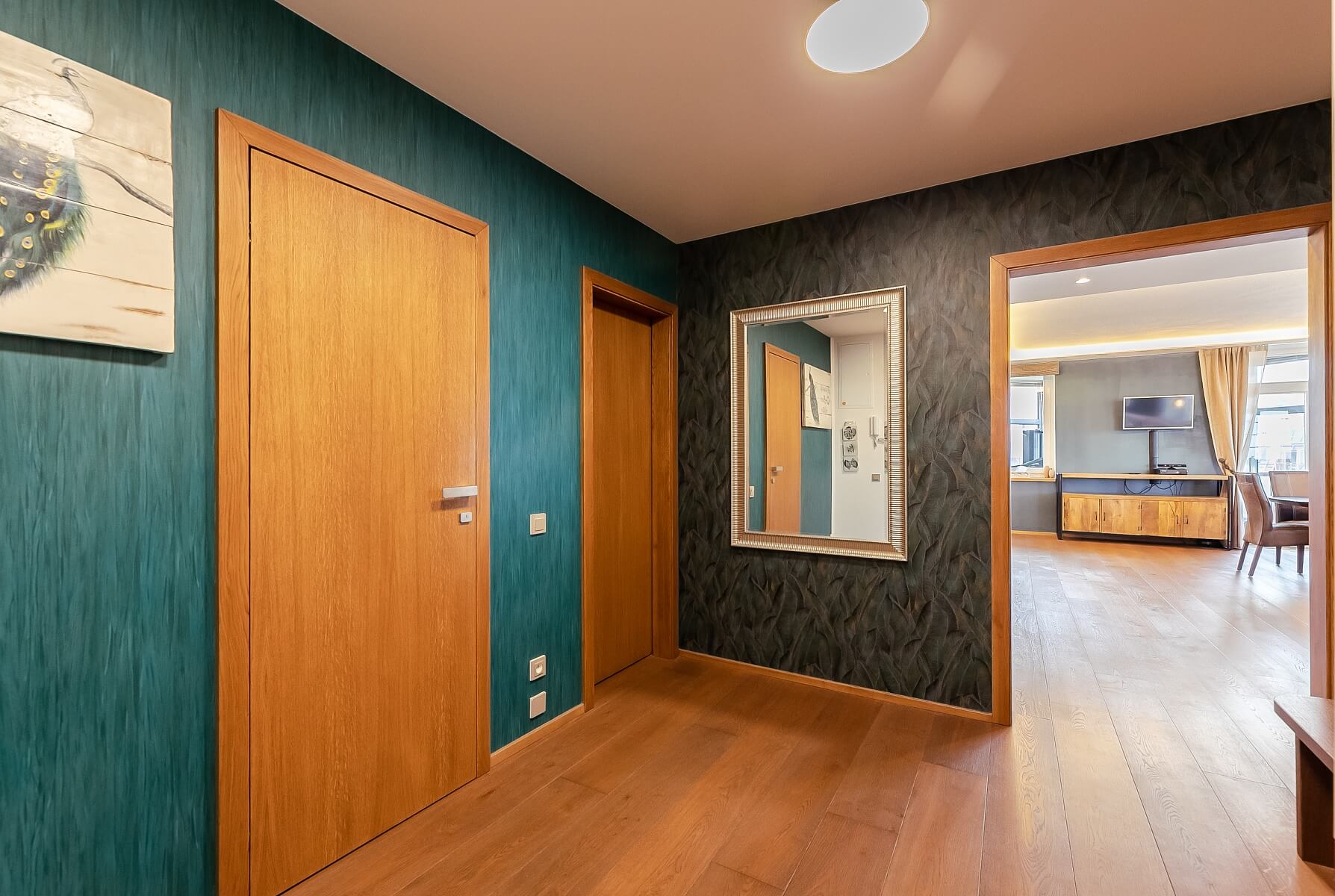 Interiér je po kompletní a nákladné rekonstrukci v r. 2015. Součástí vybavení jsou třívrstvé dřevěné podlahy Kährs a dřevěná eurookna, nové koupelny a kuchyně, designové radiátory, příprava na krb v obývacím pokoji, palubové dřevo na terasách. Vytápění je dálkové. K bytové jednotce přísluší tři garážové stání a 3 sklepy.