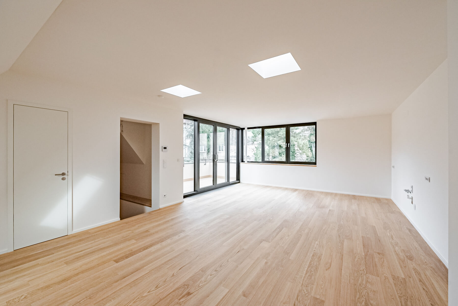 Dispoziční řešení novostavby nabídne ve vstupní úrovni (4. podlaží domu) hlavní ložnici s walk-in šatnou a en-suite koupelnou, další 2 ložnice, centrální koupelnu, technickou místnost s přípojkou na pračku a sušičku a prostornou předsíň se schodištěm do horního podlaží. To je koncipováno jak otevřený obytný prostor s kuchyní, jídelnou a západně orientovanou terasou s výhledem do zeleně.