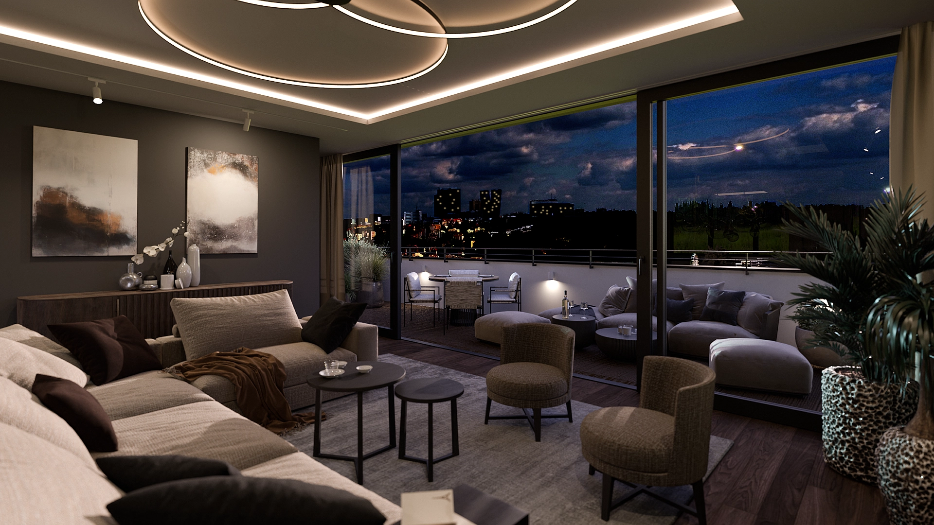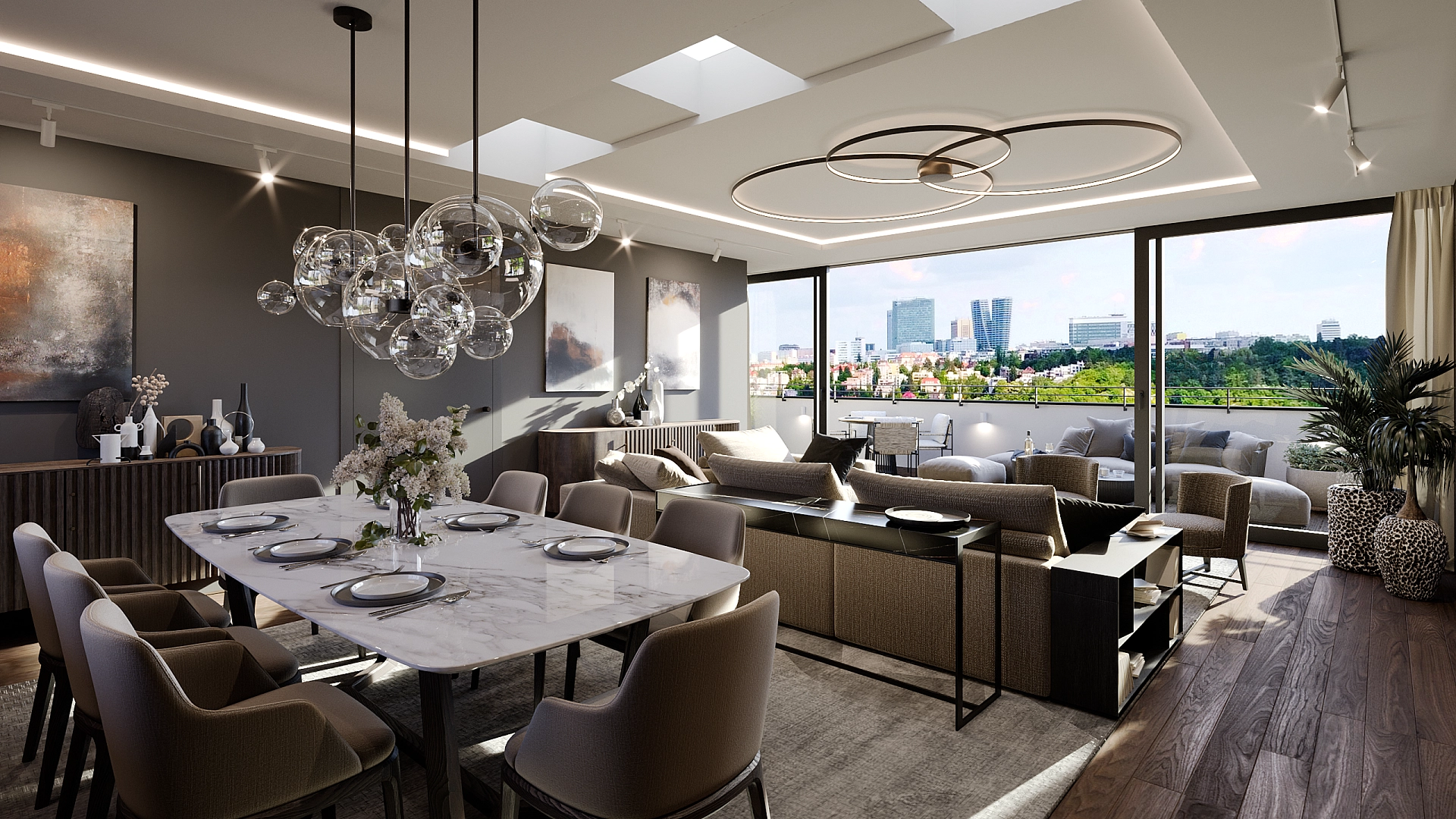 Dispoziční řešení nabídne ve vstupní úrovni (4. podlaží domu) hlavní ložnici s walk-in šatnou a en-suite koupelnou, další 2 ložnice, centrální koupelnu, technickou místnost s přípojkou na pračku a sušičku, halu a předsíň se schodištěm do vyššího podlaží. To je koncipováno jak otevřený obytný prostor s kuchyní, jídelnou, šatnou, hostinskou toaletou a prostornou, jižně orientovanou terasou s ideálním nerušeným výhledem na jižní horizont s výškovou budovou V-Tower.