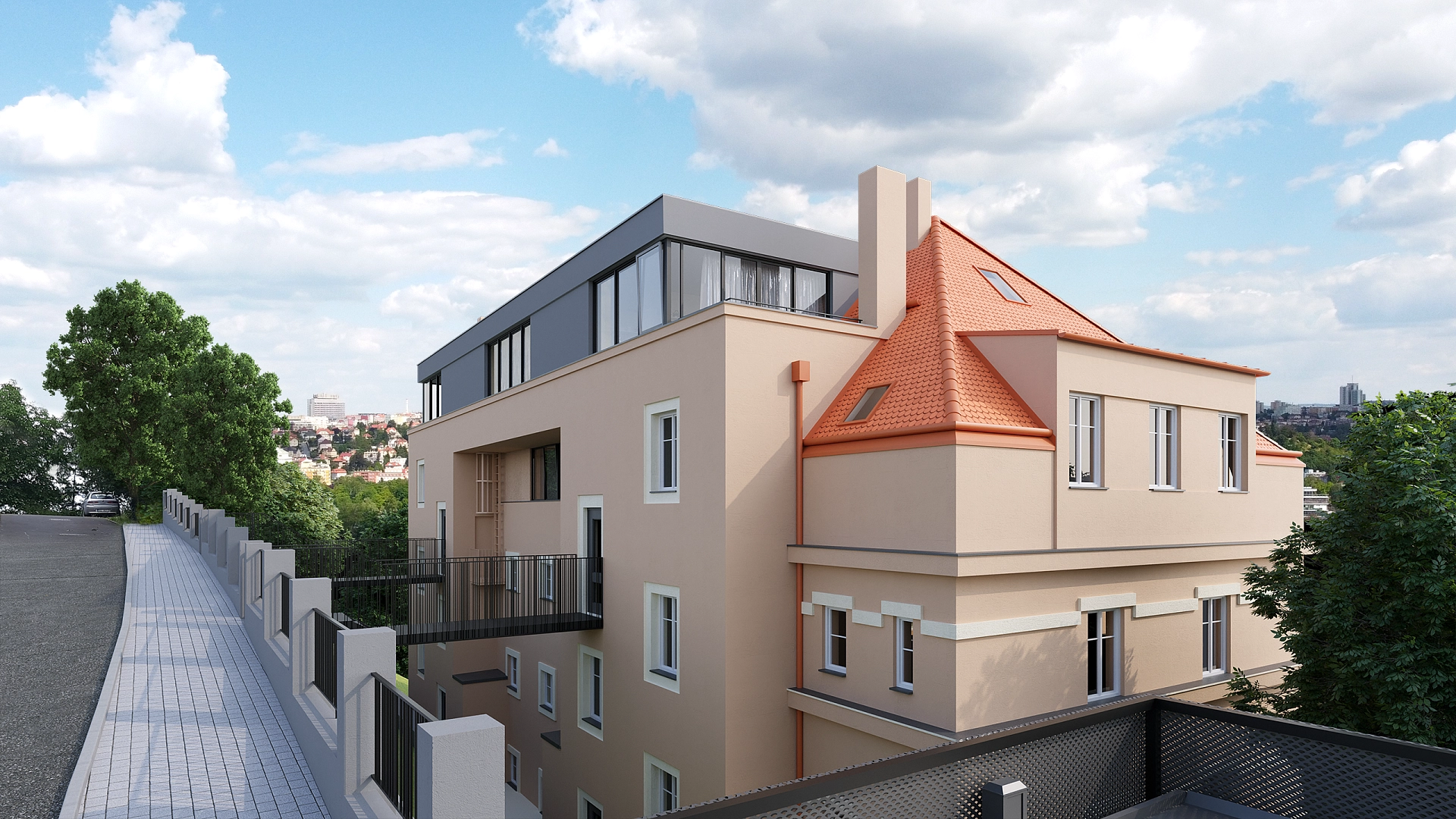 Velkoryse pojatý mezonetový byt s velkou jižní terasou a parkováním právě vzniká nástavbou bytového domu v příjemné zelené lokalitě pražského Smíchova přímo u Dívčích hradů s pasoucími se koňmi, u přírodní památky Ctirad a současně jen pár minut jízdy od pěší zóny na Andělu a právě vznikající nové čtvrti Smíchov City. Předpokládaný termín dokončení červen 2022.