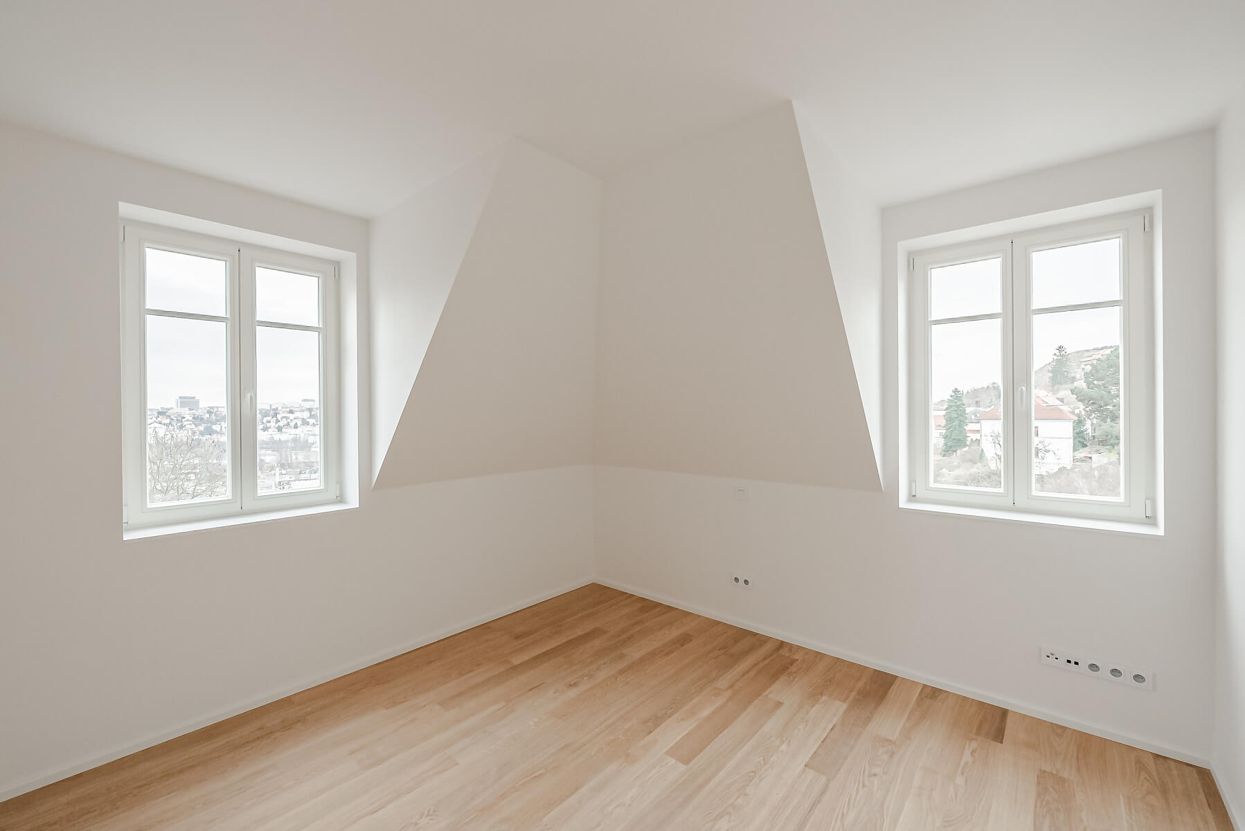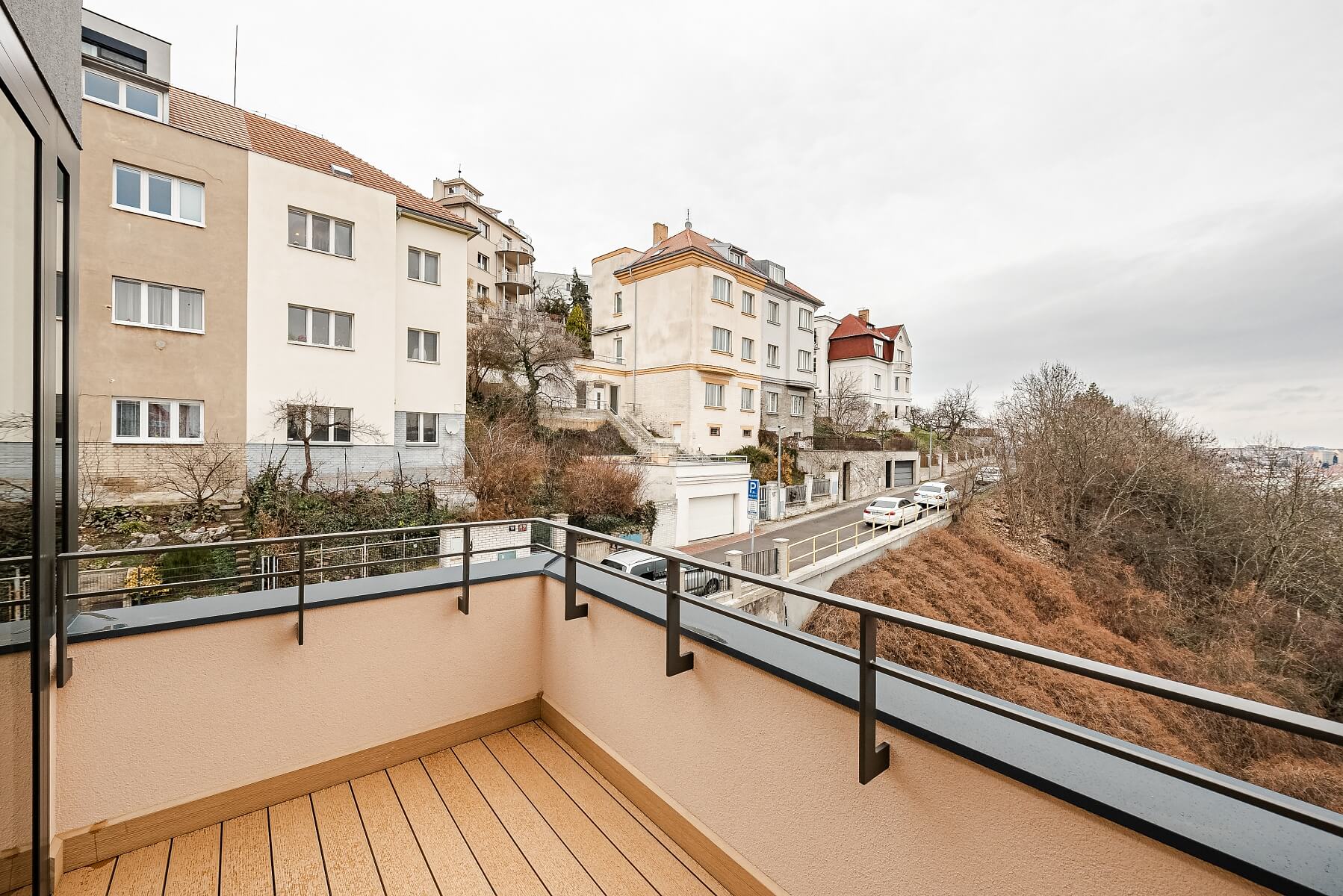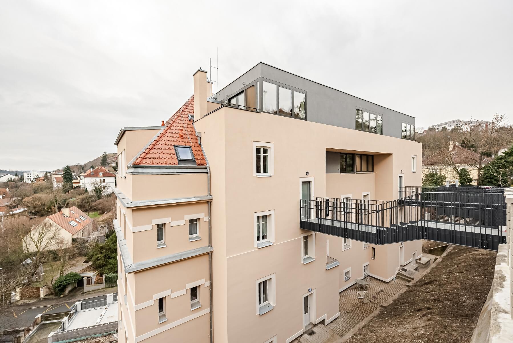 Prostorný mezonetový byt s východní terasou a parkováním vznikl nástavbou bytového domu v příjemné zelené lokalitě pražského Smíchova přímo u Dívčích hradů s pasoucími se koňmi, u přírodní památky Ctirad a současně jen pár minut jízdy od pěší zóny na Andělu a právě vznikající nové čtvrti Smíchov City.