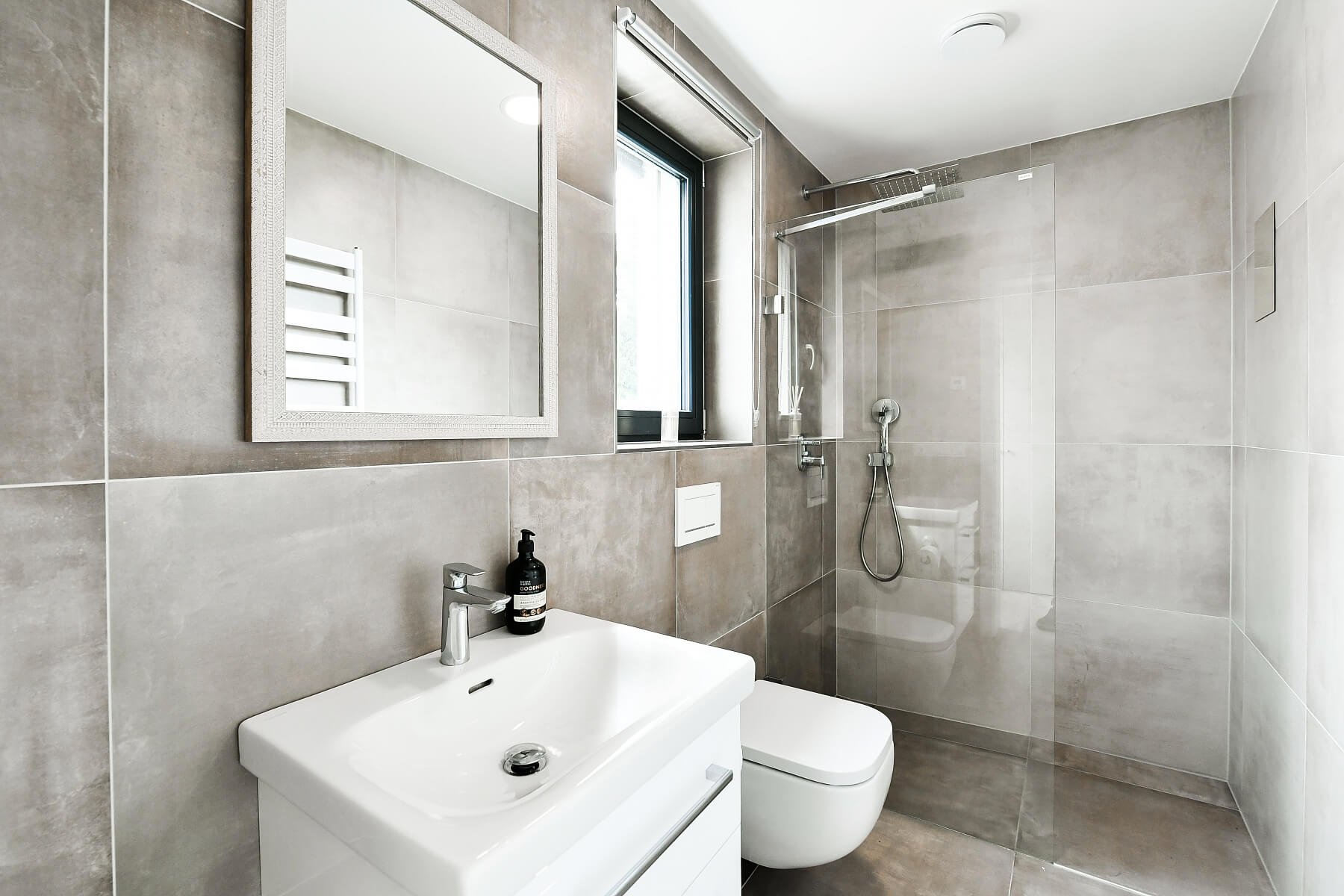 Přízemí tvoří obývací pokoj s kuchyní a vstupem do zahrady, koupelna (sprcha, WC), předsíň a technická místnost s místem pro pračku a sušičku. V 1. patře je centrální koupelna a 3 ložnice, z toho jedna s en-suite koupelnou. Ve 2. patře je hlavní ložnice s en-suite koupelnou a další pokoj (dětský pokoj/pracovna), tyto místnosti jsou oddělené protihlukovou stěnou a dveřmi.