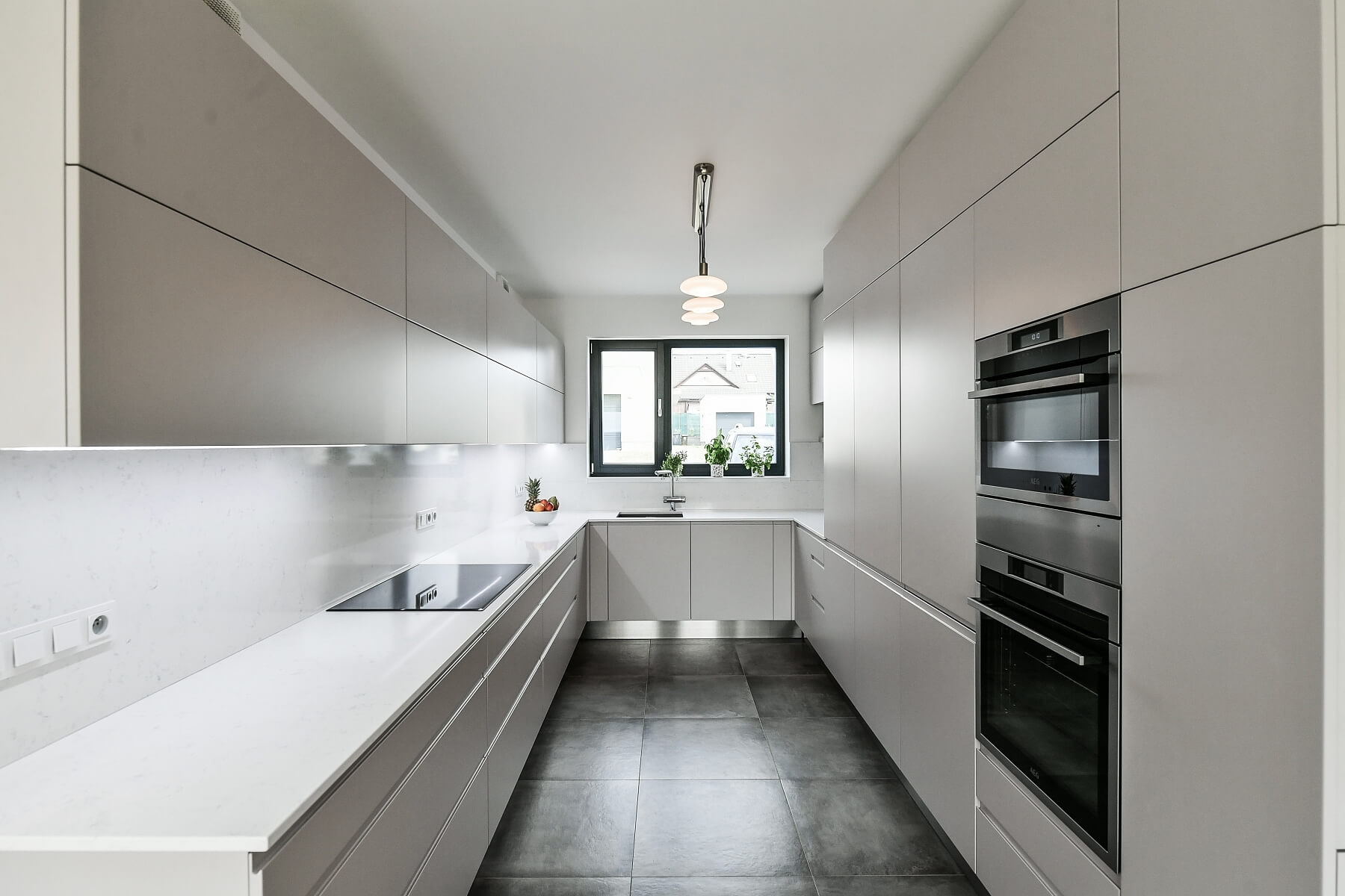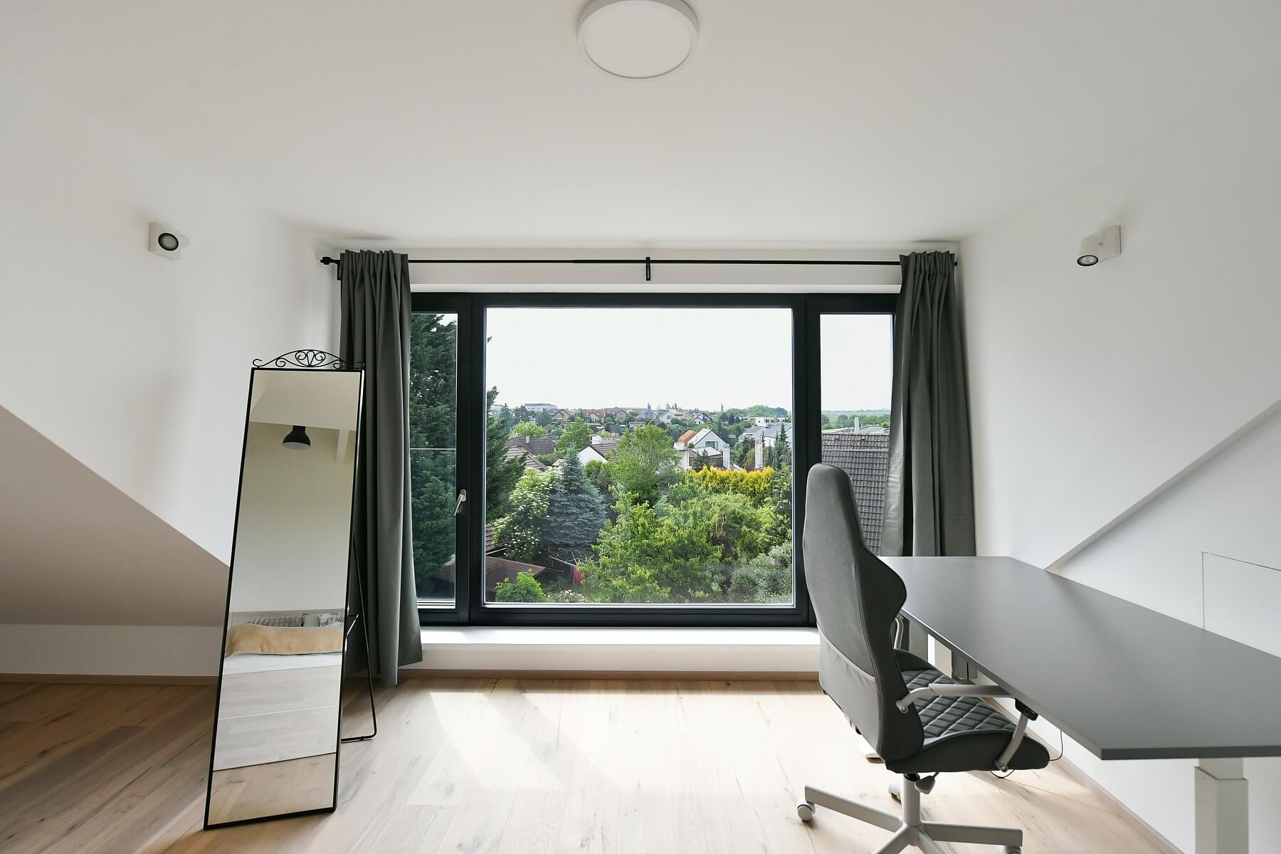Novostavba prostorného nízkoenergetického rodinného domu s krásným výhledem do širokého okolí. Dům (samostatná polovina dvojdomu) stojí na klidném místě obce Horoměřice na předměstí Prahy, v dobrém dosahu letiště i mezinárodních škol.