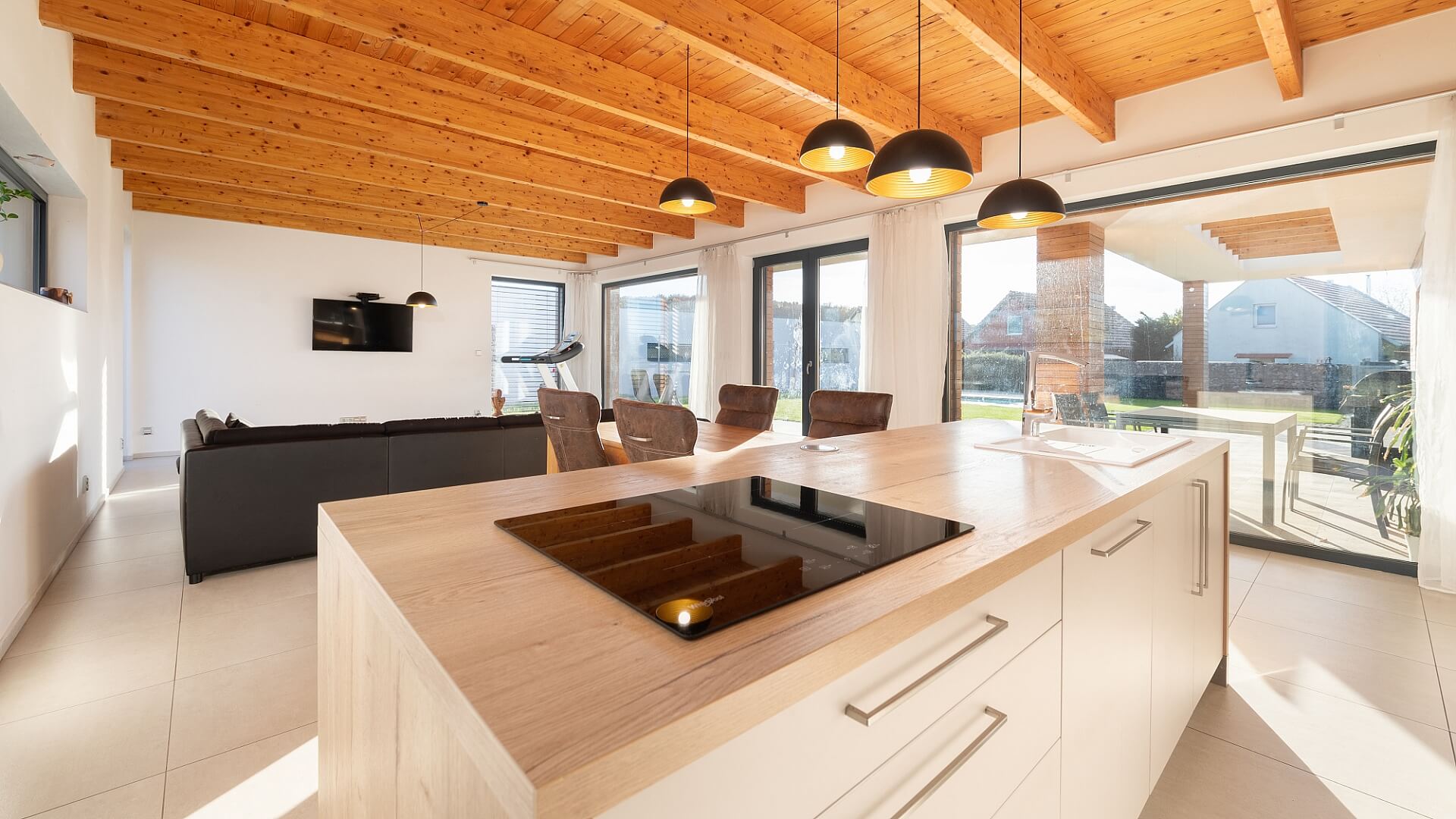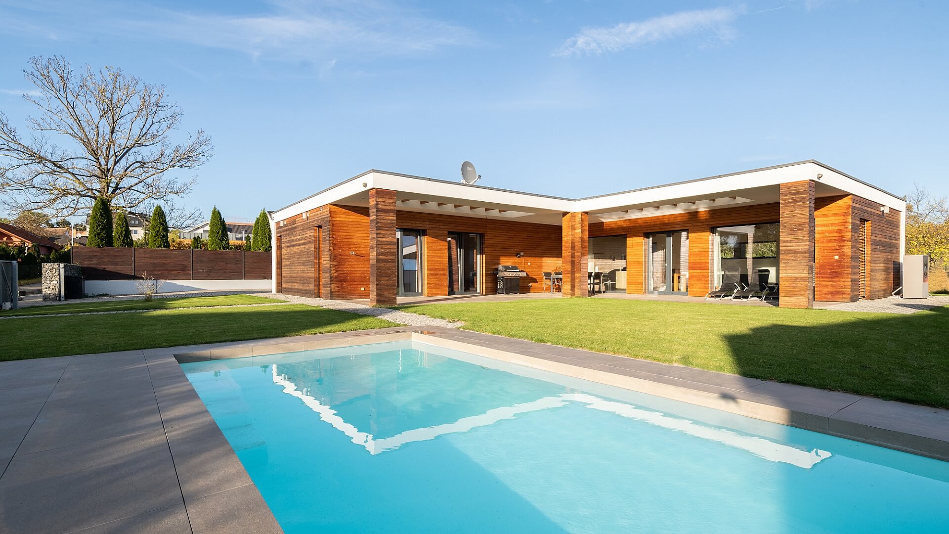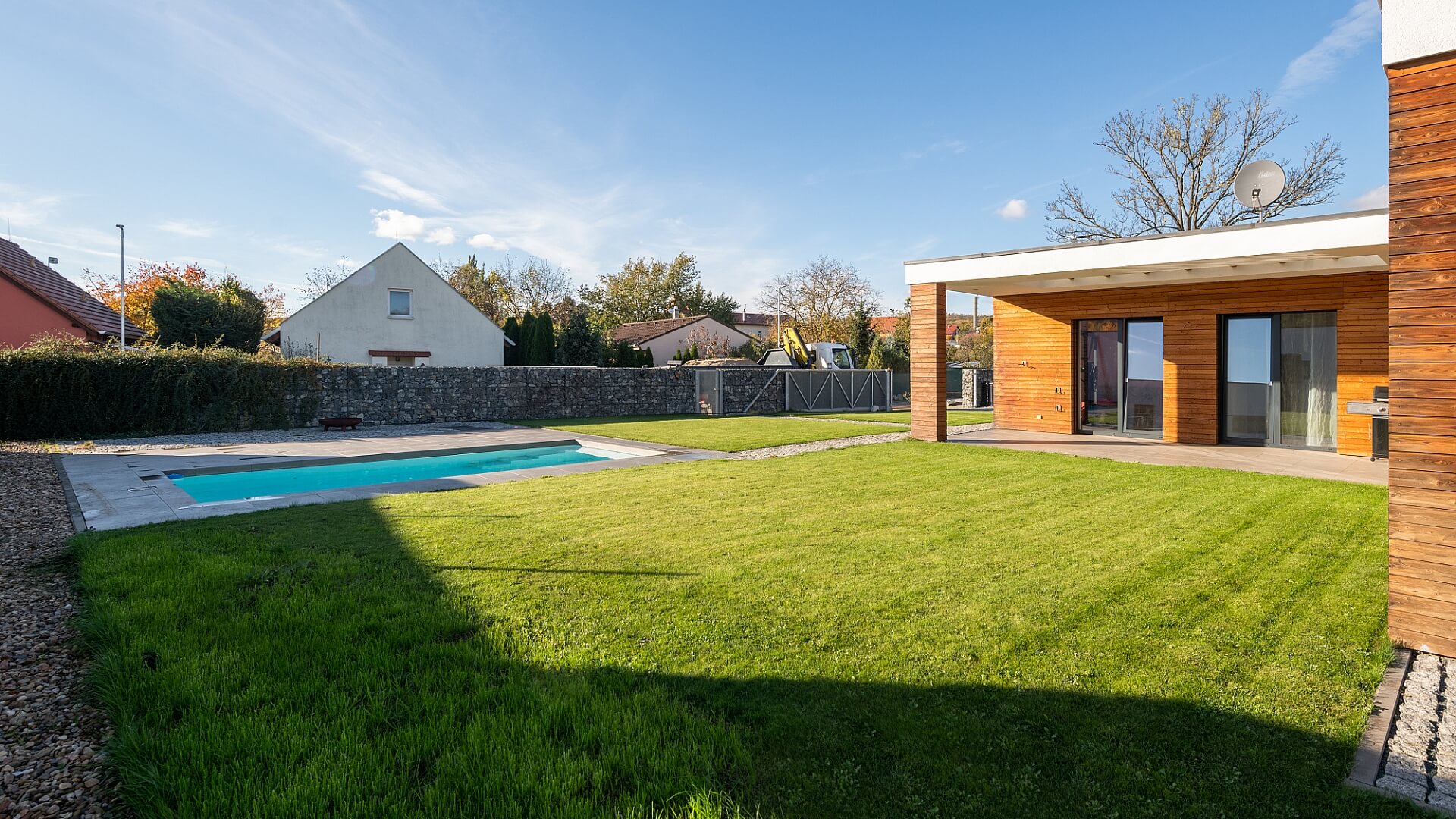 Zděný dům byl dokončen r. 2018. Standardem jsou hliníková okna s trojskly a exteriérovými žaluziemi, velkoformátová dlažba, dřevěný trámový strop, kovové vstupní dveře, dřevěné interiérové dveře, podlahové vytápění a chlazení v celém domě (včetně garáže) tepelným čerpadlem vzduch-voda. Kuchyně je kompletně vybavena vestavnými spotřebiči Whirlpool a americkou lednicí LG. Bazén je vyhřívaný tepelným čerpadlem, trávník na jihozápadně orientované zahradě udržuje automatický závlahový systém s retenční nádrží na dešťovou vodu. Odpady jsou nyní řešeny jímkou, dům bude napojen na kanalizaci v r. 2024. Bezpečí zaručuje videovrátný a kamerový systém okolo domu. Kromě dvojgaráže lze parkovat i na zpevněné ploše na pozemku.