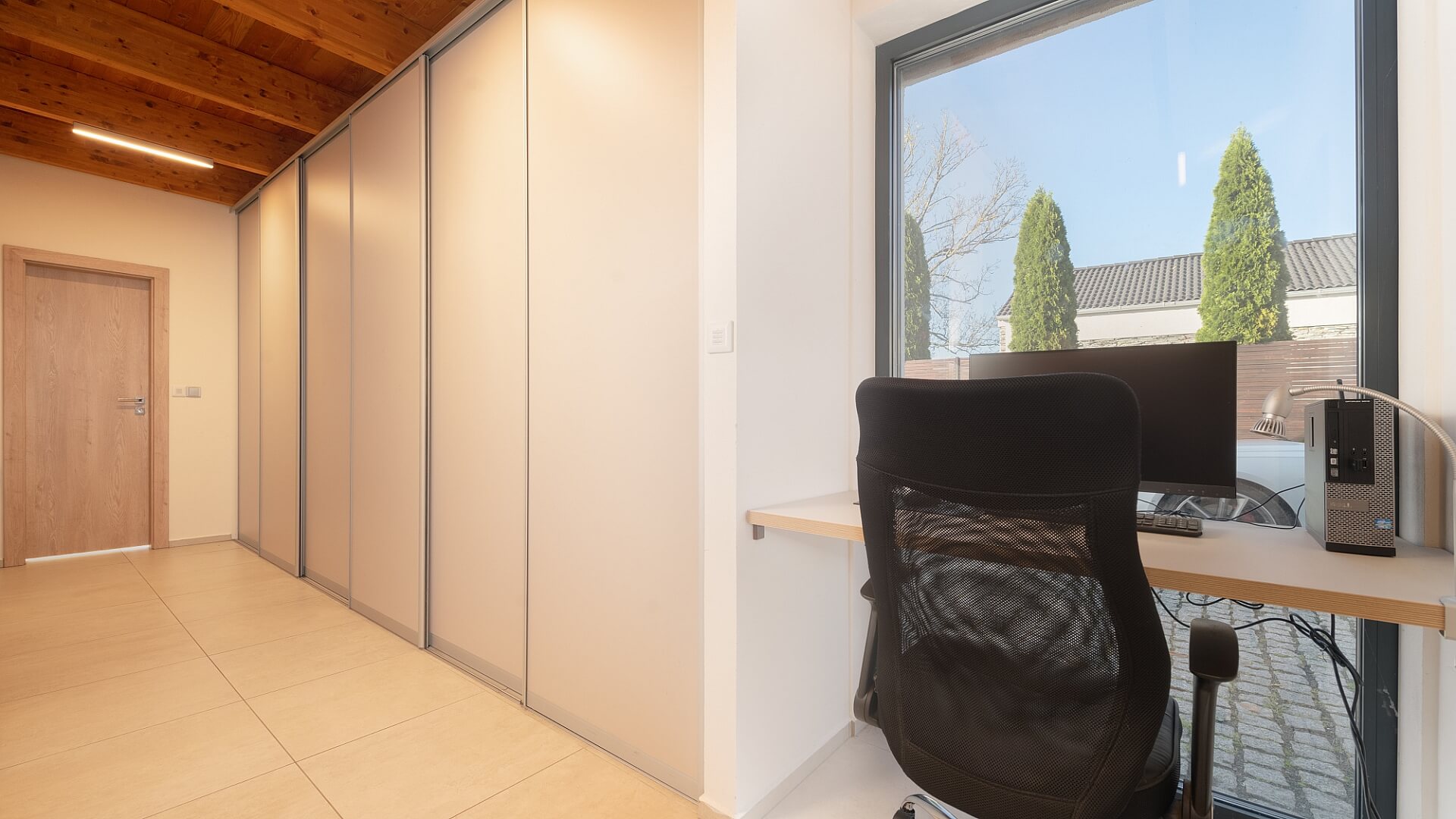 Účelnou dispozici rozloženou pouze v jedné úrovni tvoří světlý obývací pokoj s kuchyní a jídelnou, 3 ložnice, 2 koupelny, samostatná toaleta, technická místnost, zádveří a chodba s přímým vstupem do dvojgaráže. Všechny pokoje jsou francouzskými okny propojeny s terasou či zahradou. Součástí nabídky je projekt přestavby stávajícího rodinného domu na vícegenerační bydlení, včetně rozšíření stávající obytné plochy o další podlaží. K projektu je již vydáno platné stavební povolení.