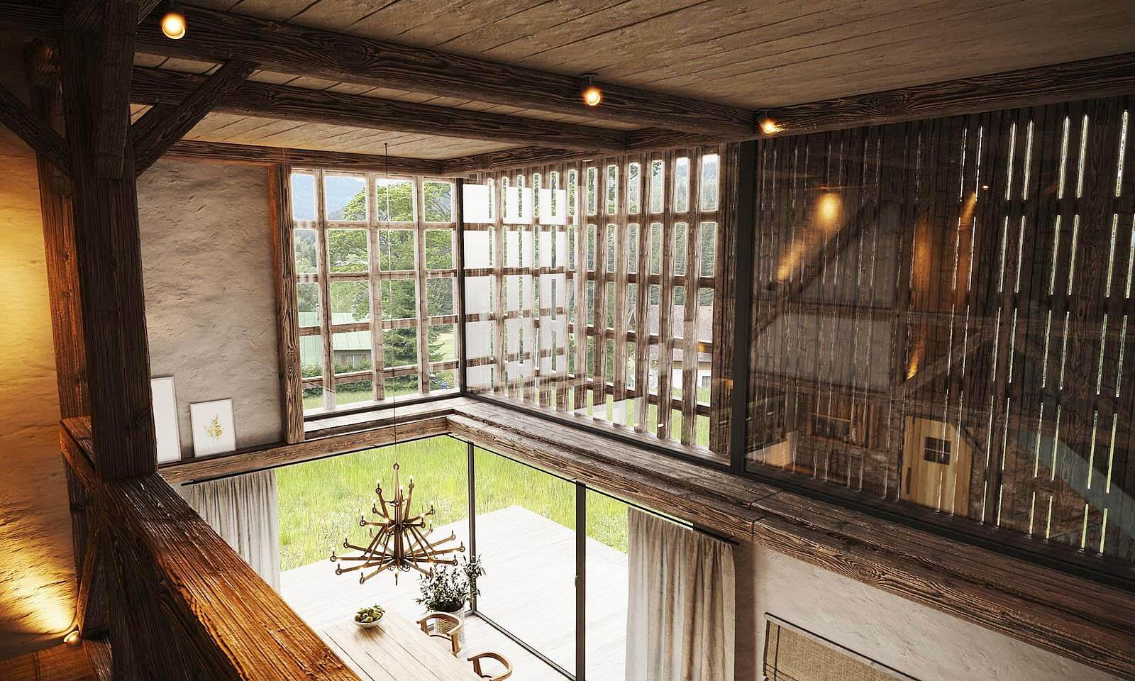 V úrovni zahrady bude obývací pokoj s jídelnou a s přípravou pro kuchyni a krb, dále chodba, toaleta a sauna. Z obývacího pokoje půjde vstoupit na jihovýchodně orientovanou terasu. V 1. nadzemním podlaží bude pokoj pro hosty, koupelna a prostorná předsíň se vstupem zvenku i z garáže. Soukromou zónu v podkroví bude tvořit rodičovská ložnice s velkou en-suite koupelnou, další 2 ložnice, koupelna a šatna.