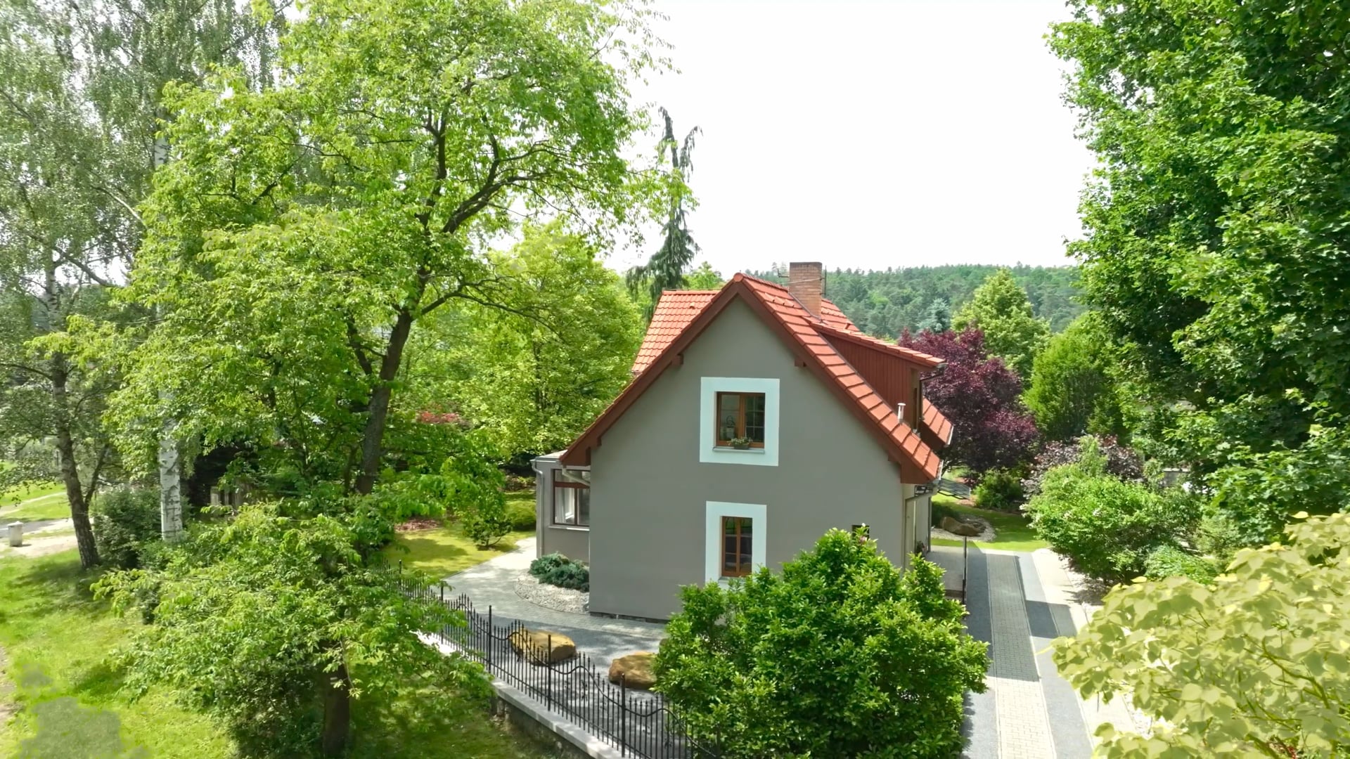 V přízemí se rozkládá velký prostor, který je členěný na obývací část s krbem, kuchyňský kout a jídelnu. Dále je zde koupelna (se sprchovým koutem), samostatná toaleta, prosvětlená zimní zahrada a chodba se schodištěm do patra. Zde je umístěna velká ložnice se šatnou, koupelna (sprchový kout, WC, podlahové vytápění), komora, druhá ložnice a menší pokoj využívaný jako pracovna. Dům je podsklepený, z oken v přízemí a patře se otevírají uklidňující výhledy do zahrady a blízkého lesa.