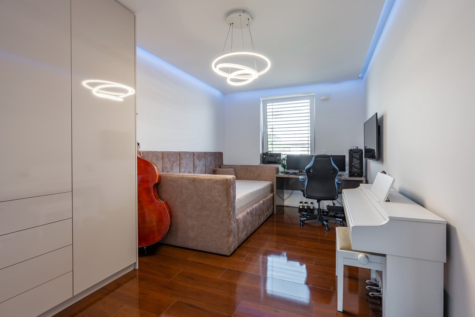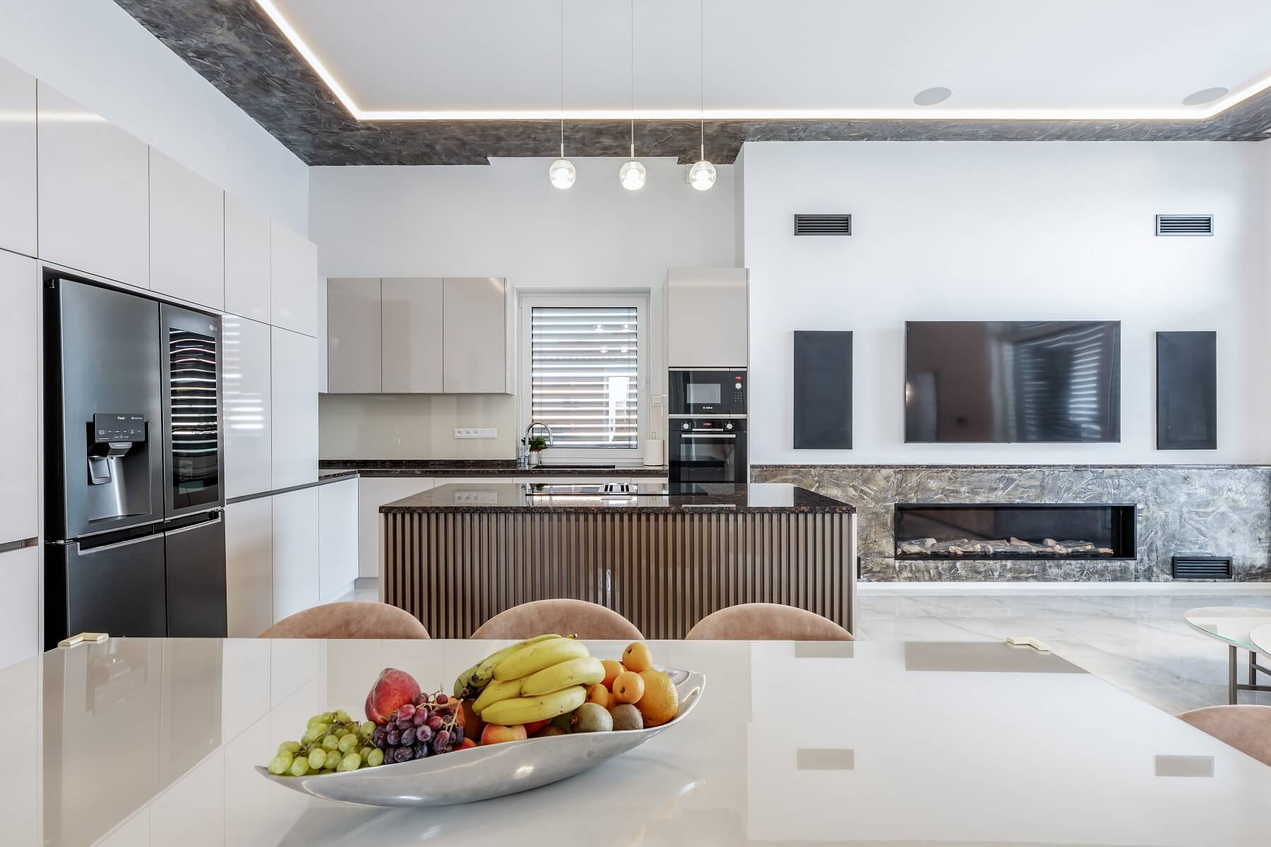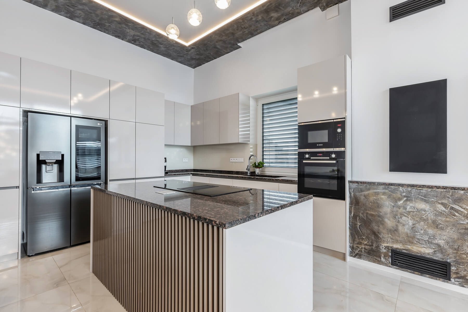 Přízemí tvoří vstupní hala s úložným prostorem, koupelna (s toaletou a sprchovým koutem), dvojgaráž a vstup do denní části, jejíž dominantou je prostorný a prosvětlený obývací pokoj propojený s kuchyní a zastřešenou terasou. Pocit volného prostoru a dostatek světla zajišťují nadstandardně vysoké stropy (3,65 m). Kuchyně značky NESIA je plně vybavena spotřebiči Bosch. Hlavní ložnice má velkou šatnu a en-suite koupelnu s vanou a vstupem na zahradu. Nechybí prádelna a další 3 pokoje.