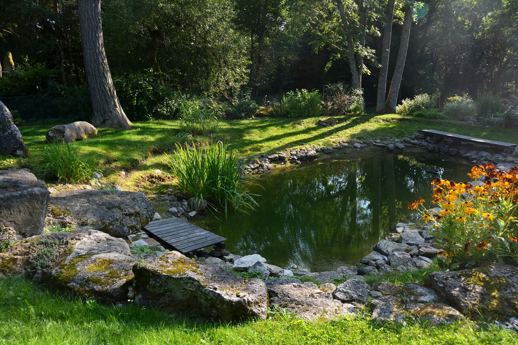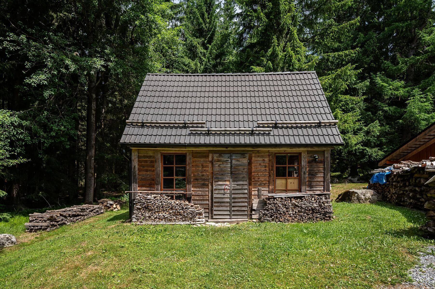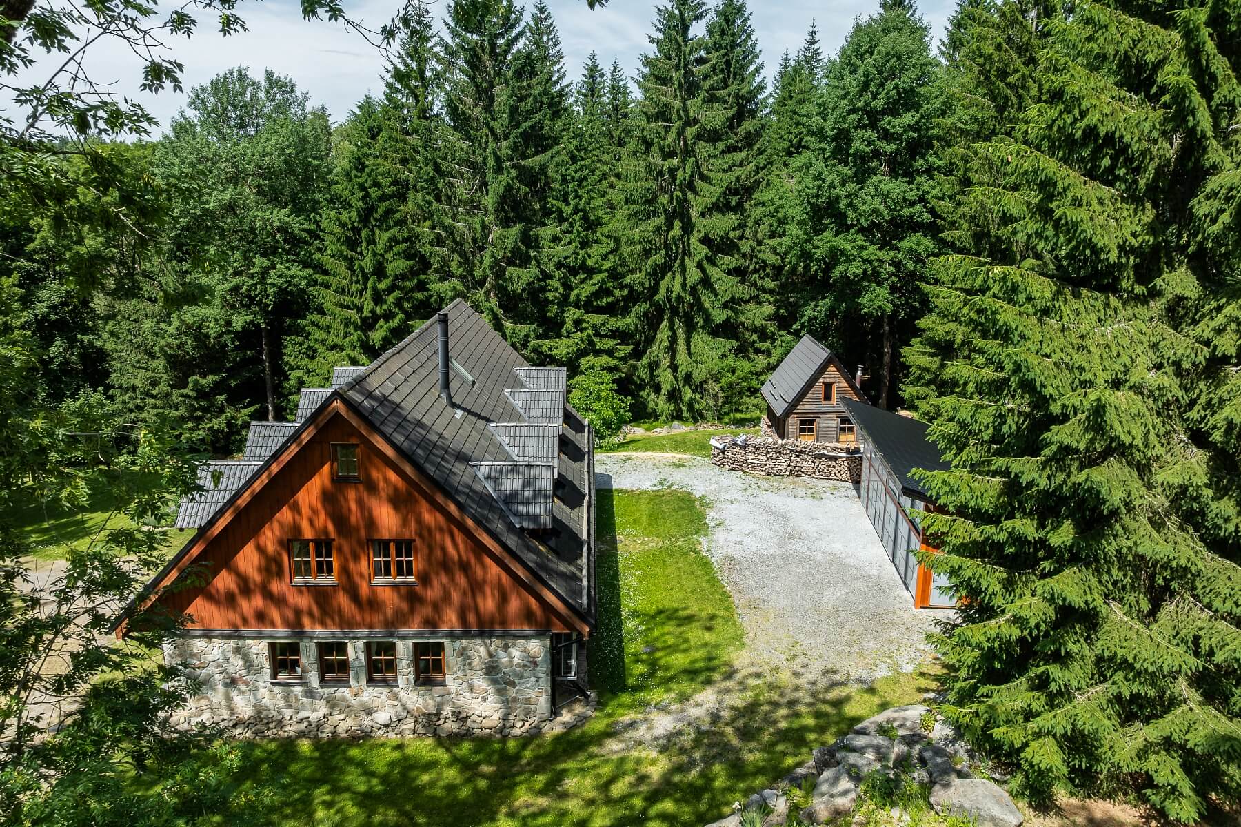Na parcele o rozloze 3 261 m2 dále stojí dvoupodlažní zateplený domek s elektřinou a krbovými kamny Jotul a uzamykatelná garáž pro 3 auta se skladem a úložnými prostory ve sníženém patře. Další parkovací stání pro 3-4 auta na pozemku, případně u příjezdové cesty, která je celoročně udržovaná obcí. V okrasné zahradě s rozmanitou florou a dekorativními kamennými prvky je vytvořené celoročně čištěné koupací jezírko s pramenitou vodou.