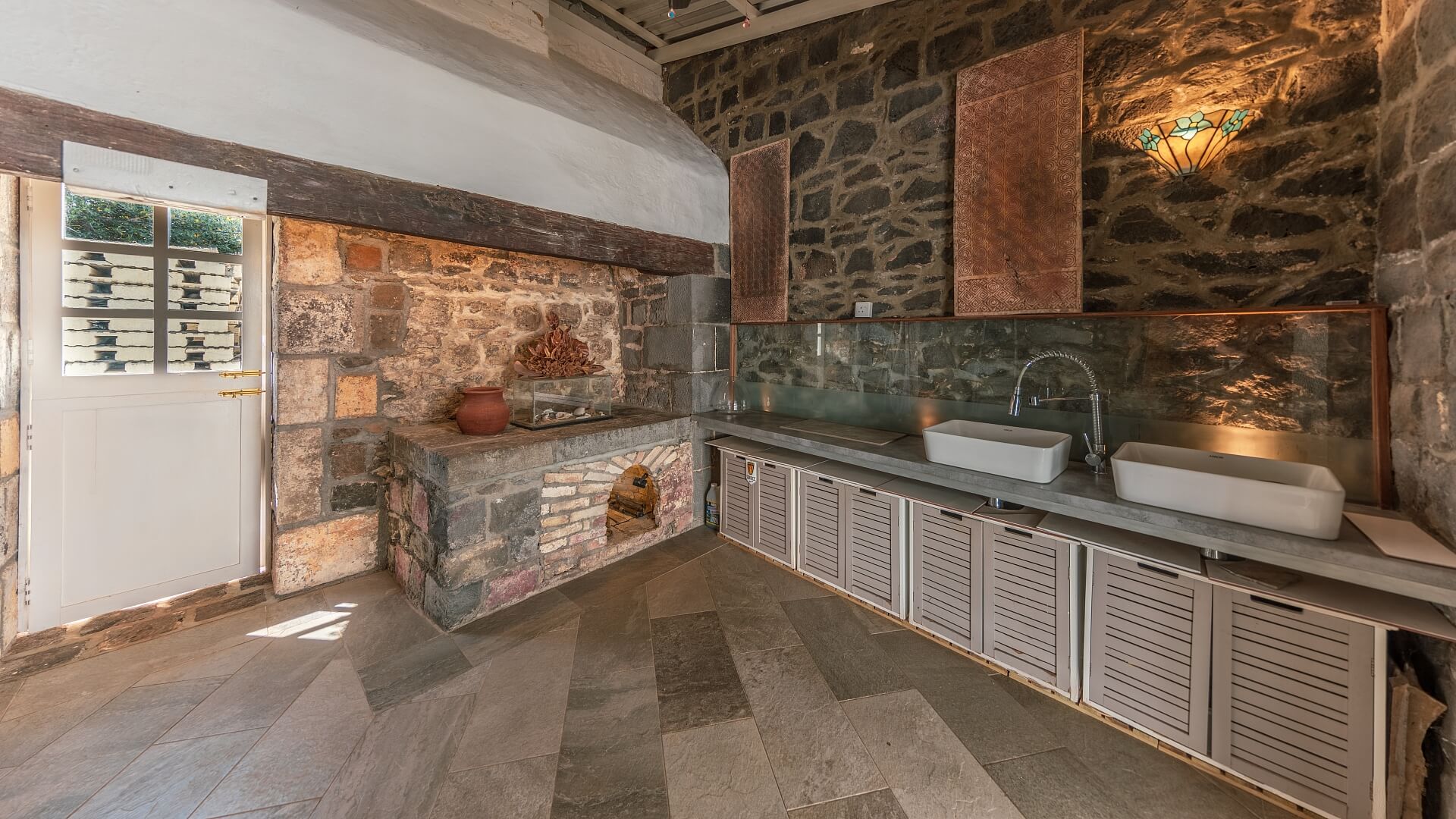K domu přiléhá přístavba se 2 klimatizovanými kancelářemi, kompletně vybavená kuchyně s tradiční pecí na chléb a hygienické zázemí. Vnější prostory jsou vyhrazeny parkovací ploše vydlážděné původními kamennými deskami a pečlivě udržované zahradě.