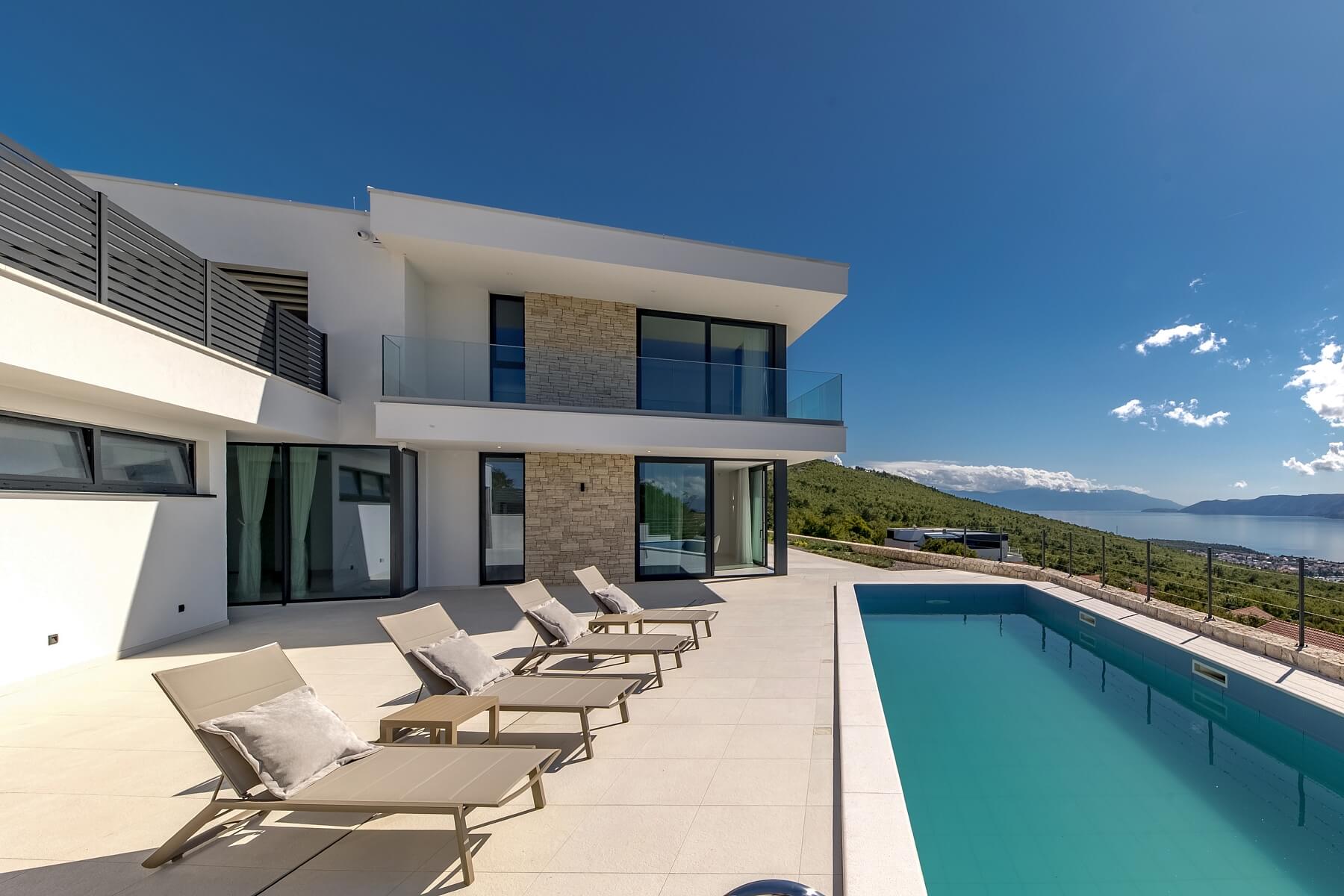 Rozlehlé prosklené plochy stírají hranici mezi interiérem a středomořskou krajinou. Téměř z každé místnosti se otevírá nezapomenutelný výhled na Jadran. Bazén o rozloze 48 m² je obklopen prostornou slunnou terasou s venkovní sprchou a lounge zónou, zahrada osázená středomořskými rostlinami je plná barev a vůní. Celý pozemek je uzavřen a zabezpečen elektrickou bránou, bezproblémové parkování poskytuje garáž s přímým vstupem do vily a další venkovní parkovací místa.