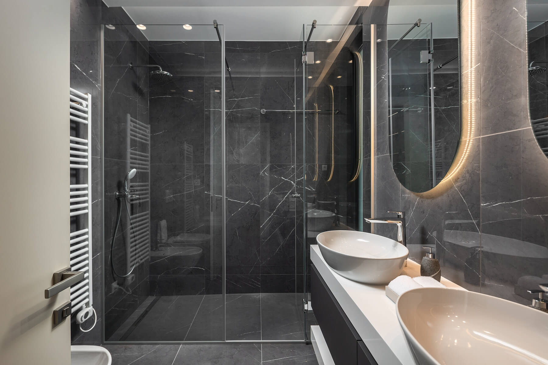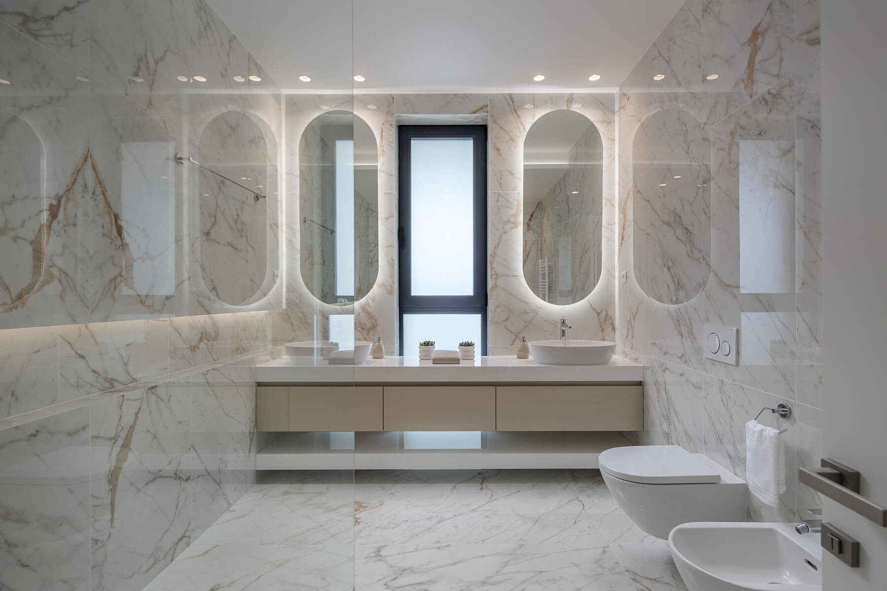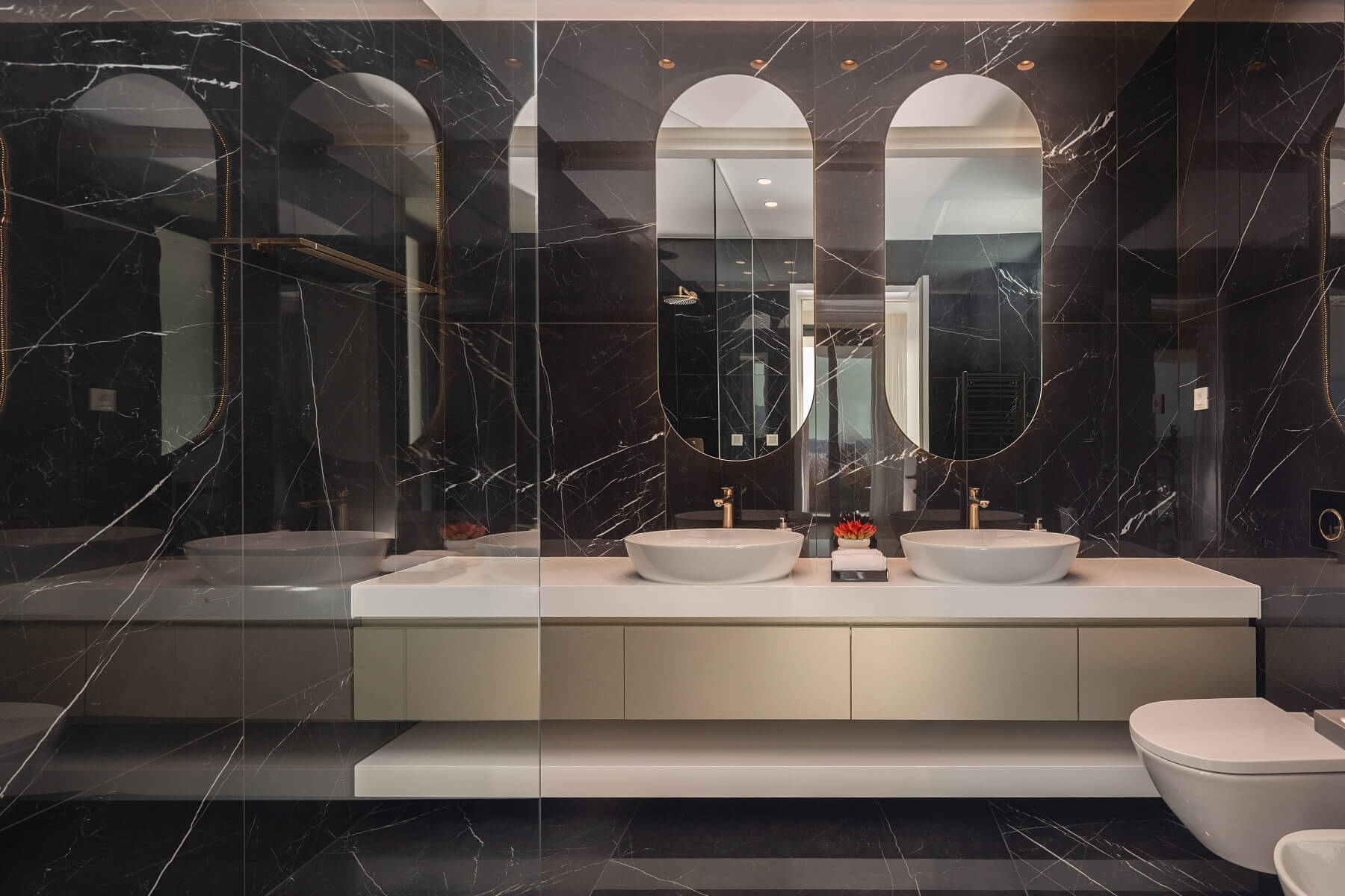 Přízemí je koncipováno jako impozantní otevřený prostor o rozloze 115 m², který zahrnuje obývací pokoj, jídelnu a moderní kuchyni, jež je diskrétně oddělena posuvnými skleněnými dveřmi. Obývací pokoj je navržen v sofistikované neutrální paletě, doplněn o současná umělecká díla a o hřejivou atmosféru danou krbem na dřevo. Luxusní charakter podtrhují elegantní kruhová závěsná svítidla a panoramatické prosklené stěny. Jídelně dominuje dlouhý stůl značky Cattelan pro 10 osob s designovým lustrem, kuchyně na míru s obklady Versace v dekoru mramoru Calacatta je vybavena prémiovými spotřebiči Miele a centrálním ostrůvkem s barovým sezením. V přízemí se dále nachází první prostorná ložnice s en-suite koupelnou, šatnou a přímým vstupem k bazénu. Nechybí ani wellness a fitness zóna. Elegantní vnitřní schodiště vede do horního podlaží, kde se nacházejí 3 impozantní ložnice, každá o rozloze přes 30 m², všechny s vlastní koupelnou, šatnou na míru a soukromým balkónem. Součástí vily je také oddělený apartmán ideální pro hosty nebo personál, s přímým vstupem k bazénu a na terasu.