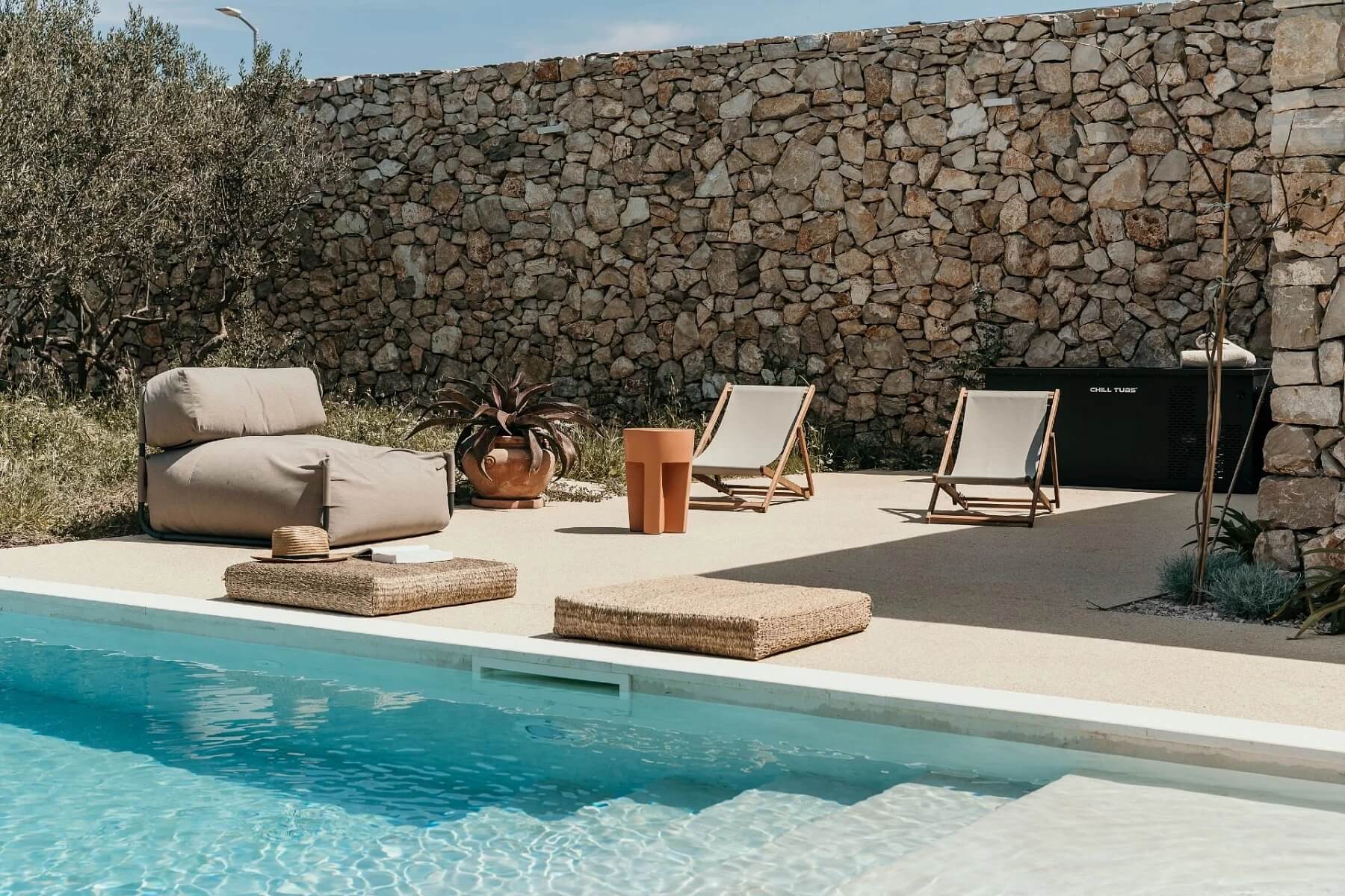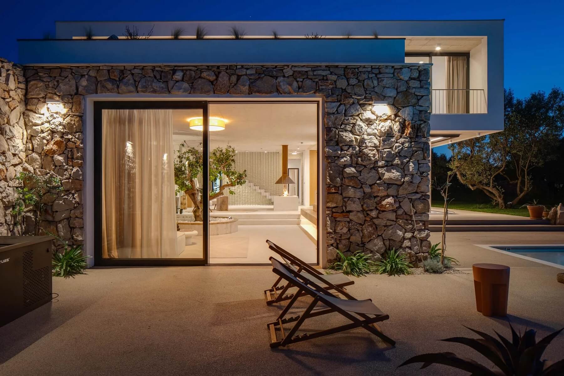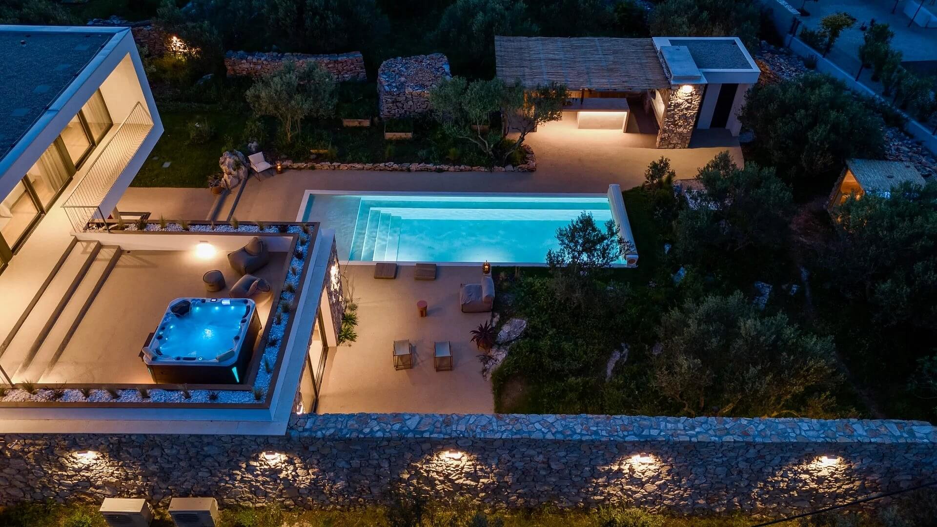 Vila je vybavena podle nejvyšších standardů: podlahovým vytápěním, klimatizací, kamerovým bezpečnostním systémem, solárním systémem o výkonu 16 kW, nabíječkou pro elektromobily, dvojgaráží a dalšími 4 venkovními parkovacími místy. Venkovní část ztělesňuje esenci středomořského životního stylu, k němuž patří vyhřívaný infinity bazén s elektricky ovládaným krytím, slunná terasa, ohniště pro večerní posezení, krytá letní kuchyně, vybavená grilem na dřevo, lednicí, výrobníkem ledu a myčkou, a dokonce i wellness zóna se saunou a sprchou. Pečlivě udržovaná zahrada je osázena olivovníky, bylinkami a zeleninovou zahrádkou.