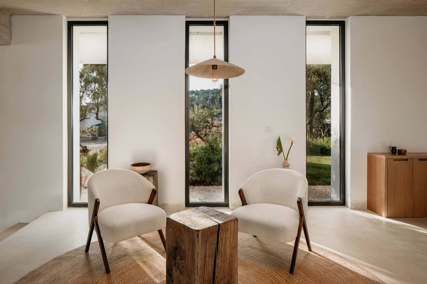 Interiér o rozloze 240 m² je rozprostřen do dvou podlaží a navržen tak, aby maximalizoval přísun přirozeného světla a zajistil plynulé propojení vnitřních a venkovních prostor. Dominantou přízemí je otevřený obývací prostor o rozloze neuvěřitelných 122 m², který zahrnuje salonek, jídelnu a moderní kuchyni vybavenou prémiovými spotřebiči Miele. Celý prostor má přímý vstup do zahrady a k bazénu. Podlaží dále doplňuje toaleta, sklad a prádelna. Horní patro nabízí 3 prostorné ložnice, z nichž každá má vlastní en-suite koupelnu a soukromou krytou lodžii. Ty jsou propojeny s velkou terasou s vířivkou a nerušeným výhledem na moře. Součástí dispozice je také pracovna.