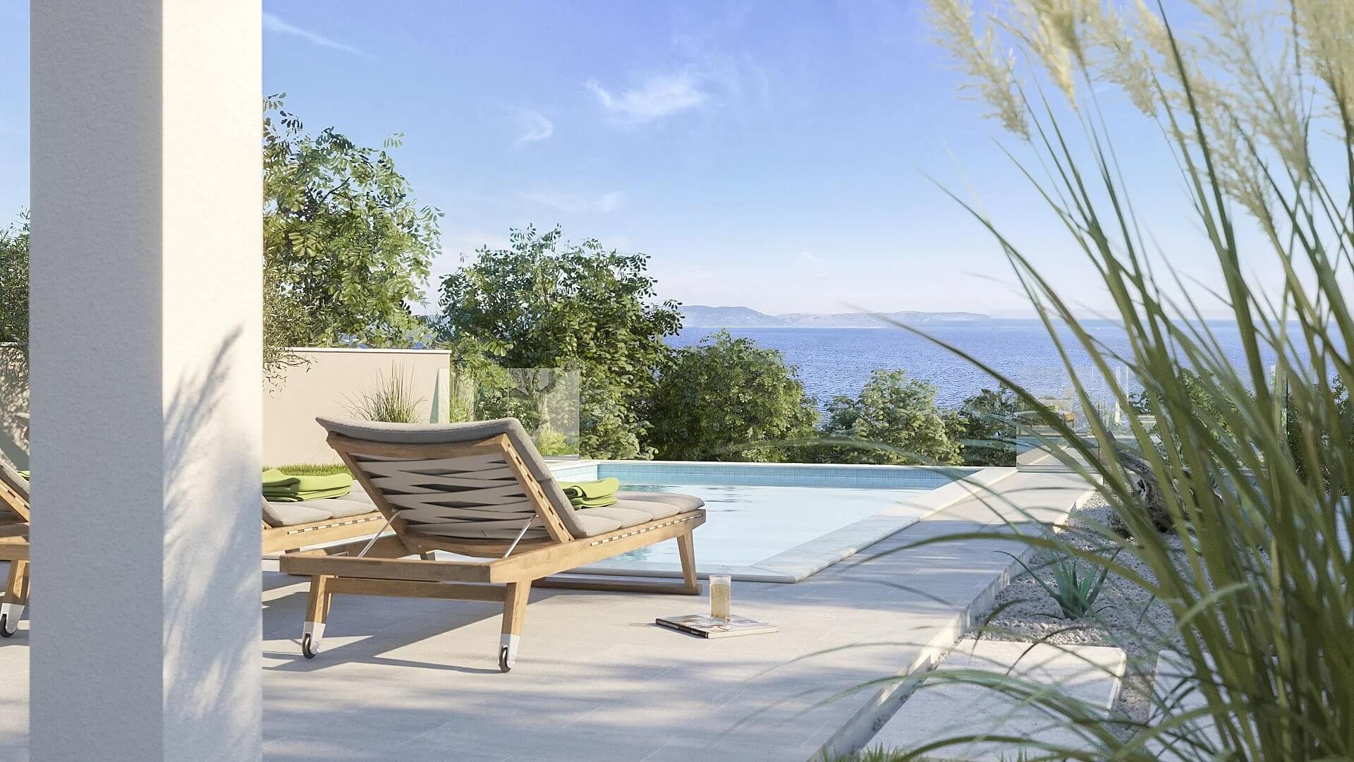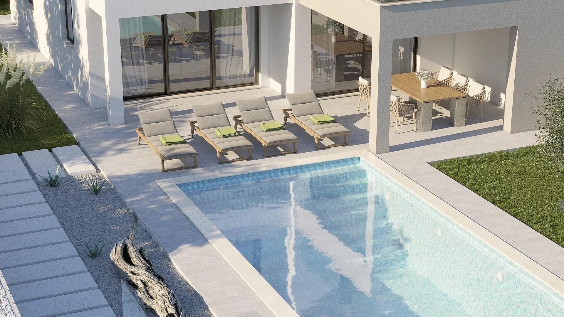 Moderní dvoupodlažní vila s bazénem a výhledy na moře i ostrov Cres situováná na východním pobřeží Istrijského poloostrova.