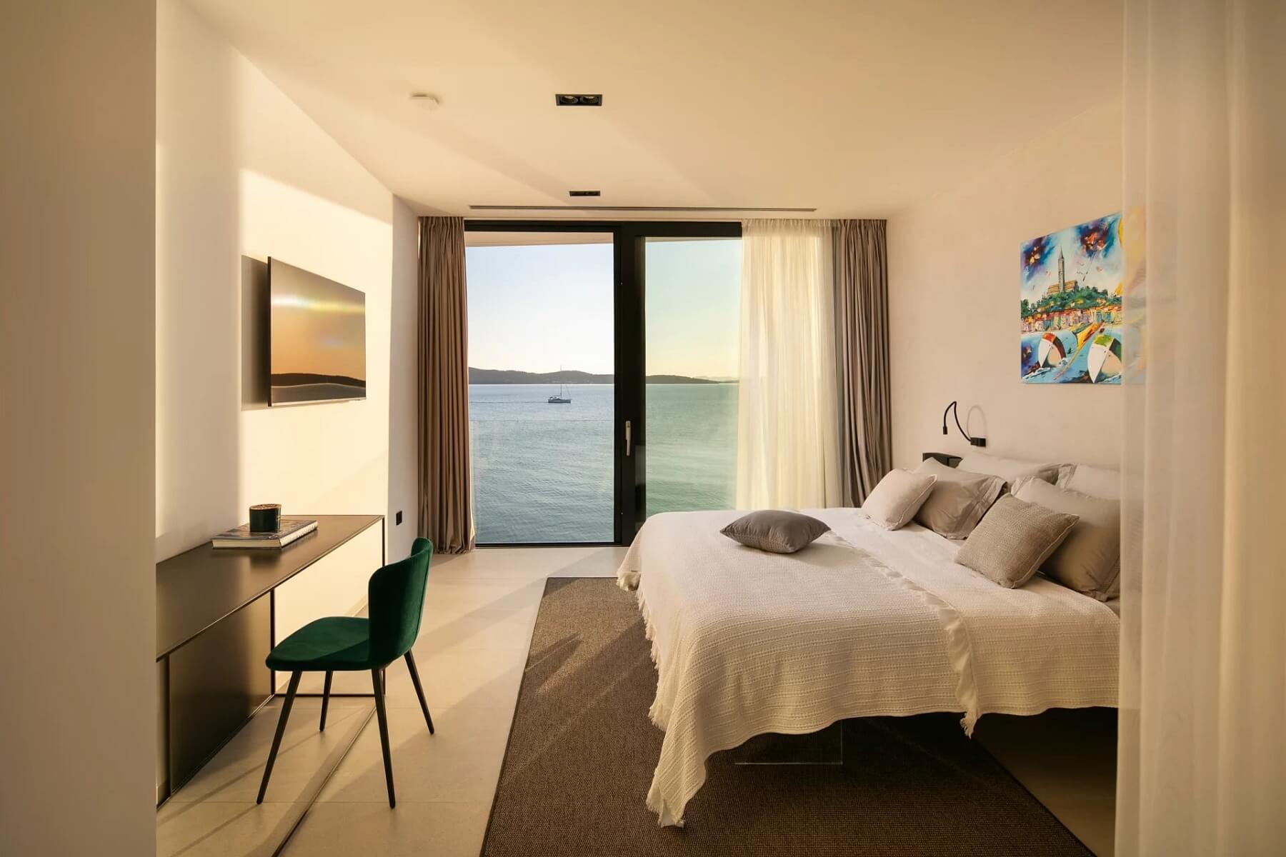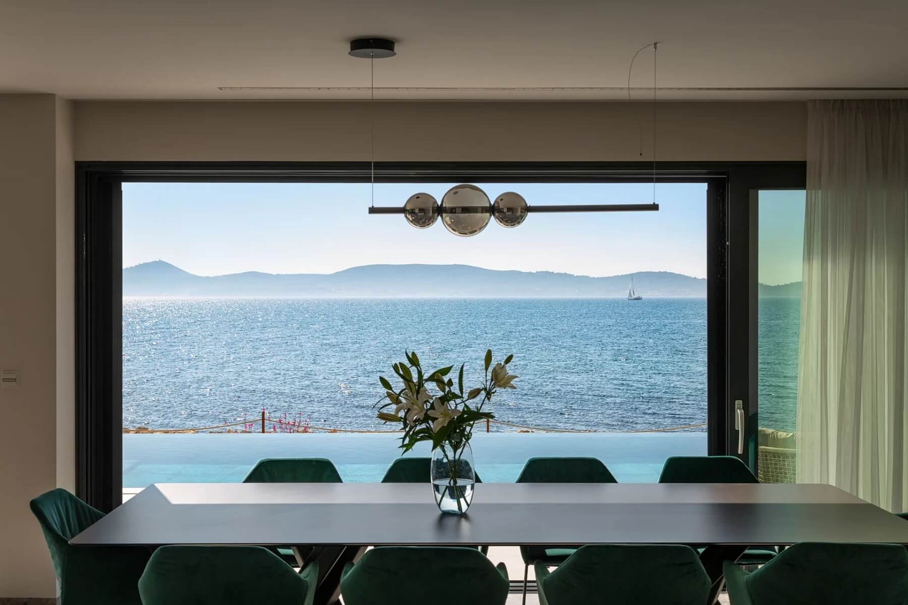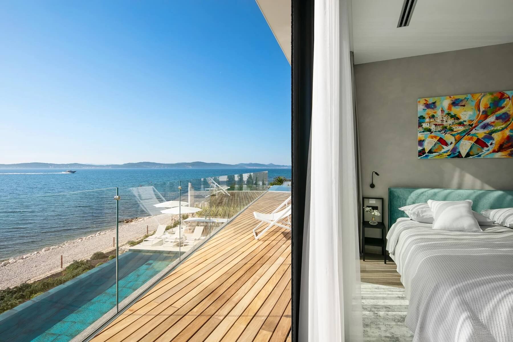 Nově postavená čtyřpodlažní vila představující mistrovské dílo moderního designu je situována na atraktivním místě přímo u pláže v blízkosti Zadaru.
