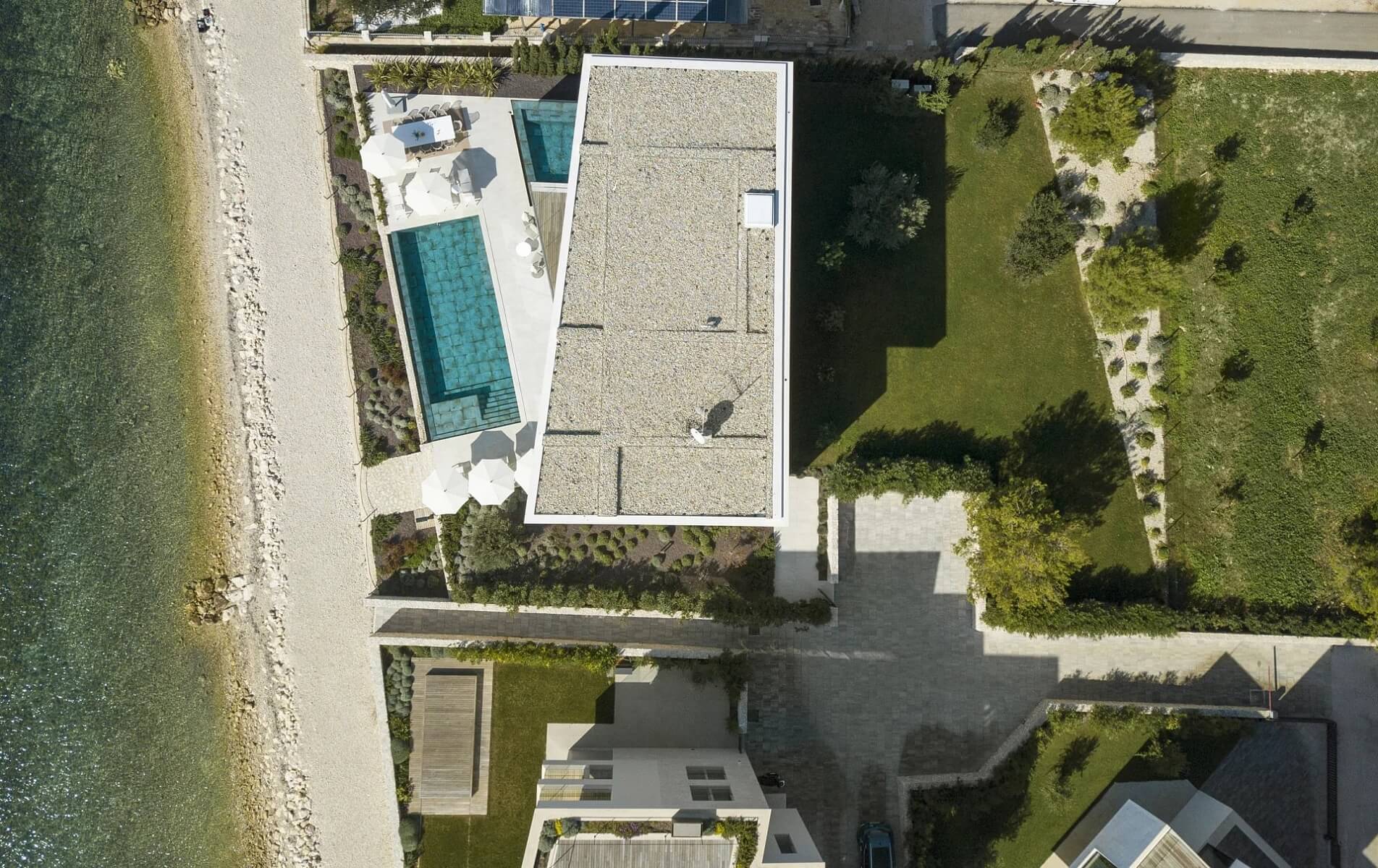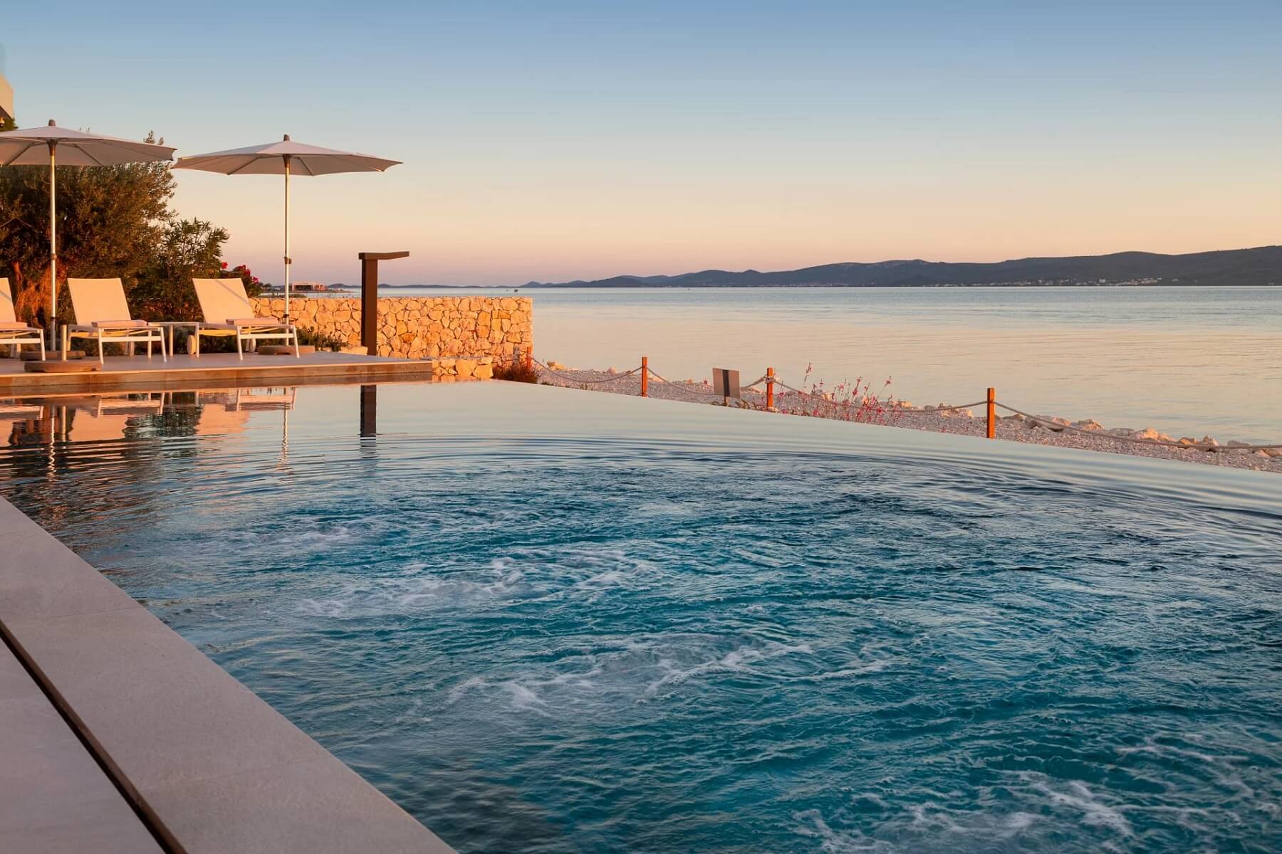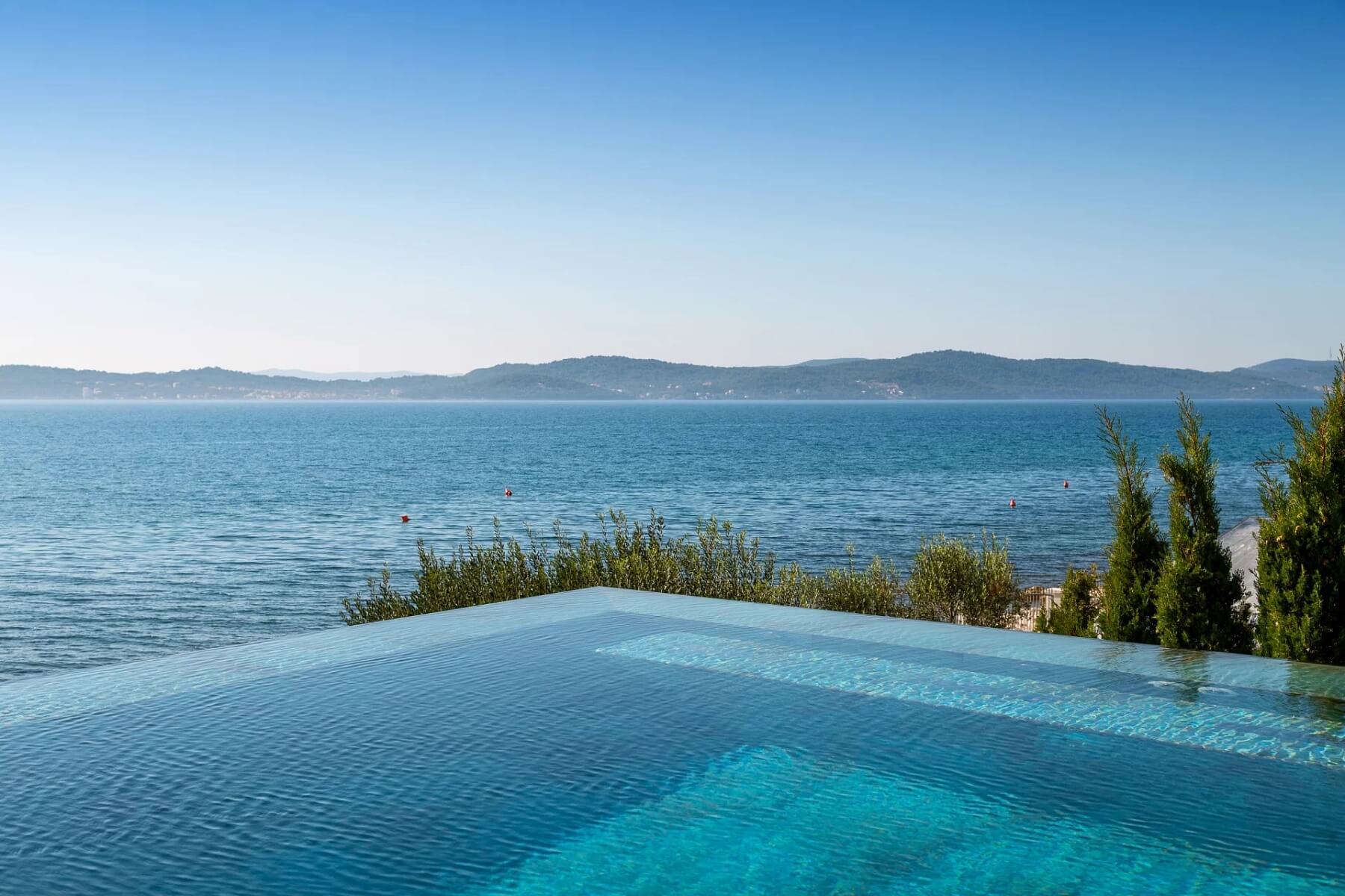 Nově postavená čtyřpodlažní vila představující mistrovské dílo moderního designu je situována na atraktivním místě přímo u pláže v blízkosti Zadaru.
