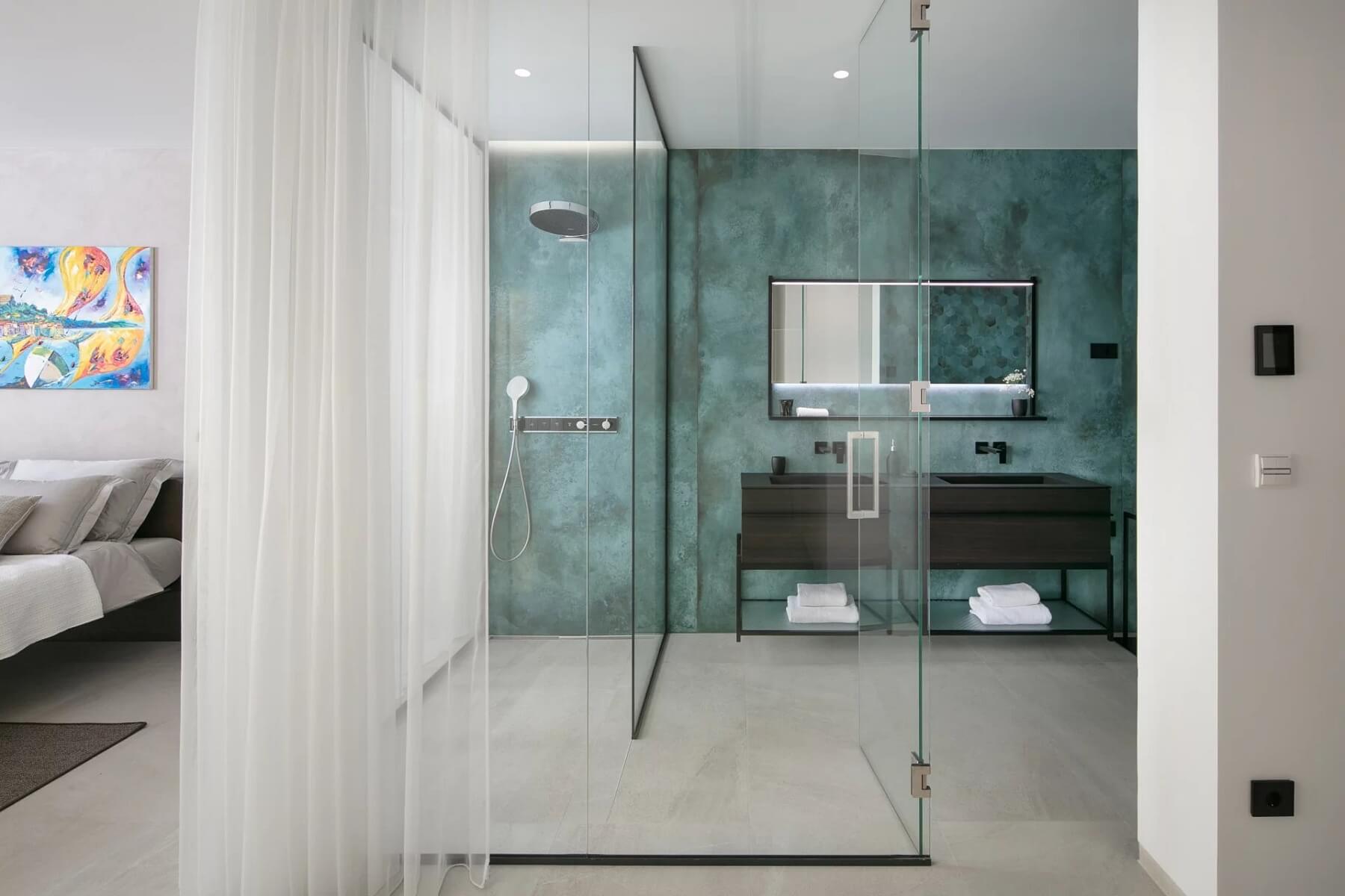 Velké prosklené stěny otevírají obytnou část do krásně upraveného exteriéru obehnaného středomořskou zahradou, jehož součástí je jídelní kout a sluneční terasa s venkovní sprchou a vyhřívaným infinity bazénem. K dispozici jsou 2 venkovní parkovací místa.