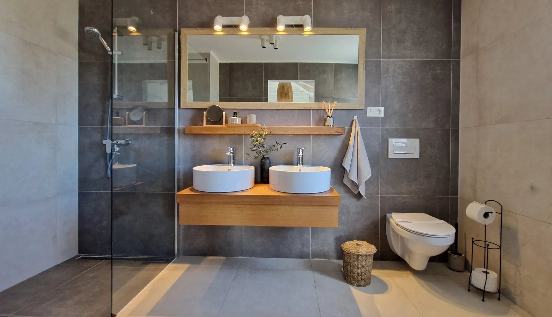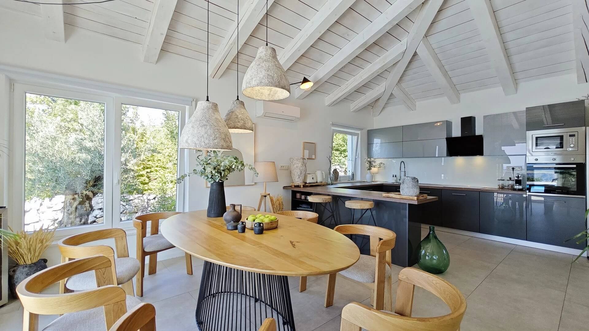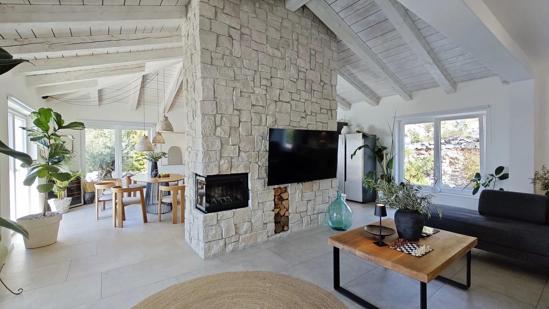 Dům byl postavený z kvalitních materiálů a vybavený systémy, které splňují moderní standardy. Design interiéru kombinuje rustikální prvky jako je přírodní kámen a dřevo a dosahuje rovnováhy mezi komfortem a vizuální čistotou.