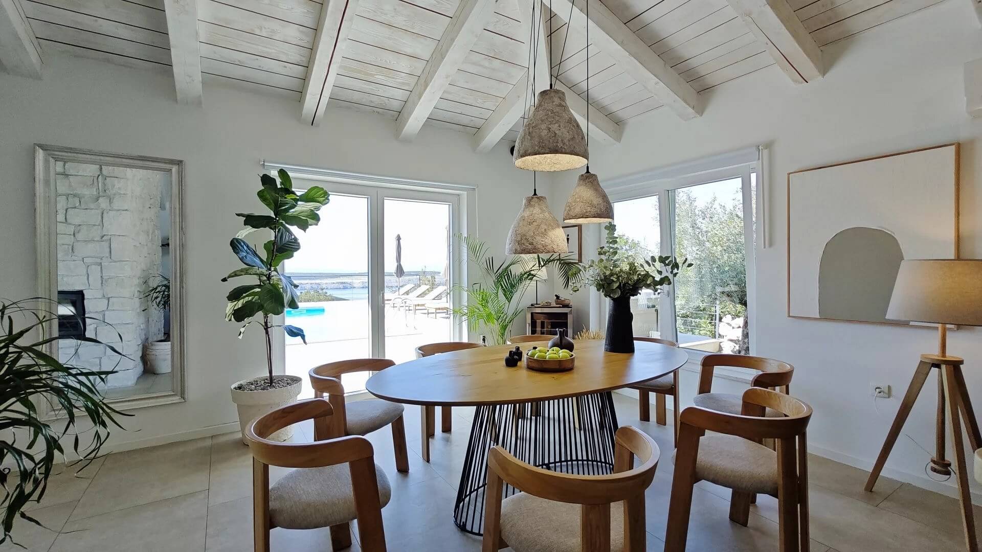 Vnitřní prostory se rozkládají ve dvou úrovních. V přízemí je umístěný obývací pokoj s krbem a výhledem na moře, jídelní kout, kompletně vybavená kuchyně, ložnice s vlastní koupelnou, sdílená koupelna a úložná místnost. V horním patře se nacházejí dvě ložnice, každá s vlastní koupelnou. Okolí vily tvoří středomořská zahrada s původními rostlinami, sluneční terasou, krytou terasou umožňující stolování pod širým nebem, vířivkou a bazénem.