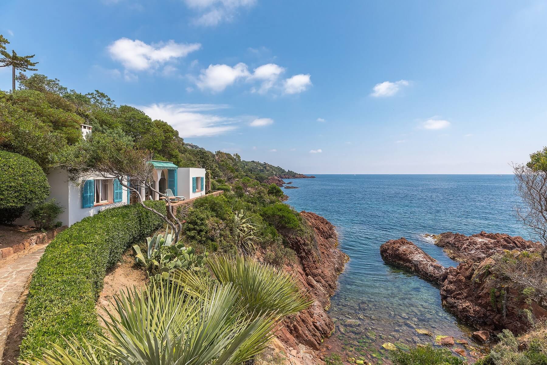Jihozápadně orientovaný jednopodlažní dům s půvabnými barevnými okenicemi a střechou zakrytou korunami stromů, pyšnící se terasovitým cca 1600 m2 pozemkem a několika přístupy k moři, evokuje idylický život na francouzském pobřeží. Procházkou trvající 3 minuty se dostanete k přístavu a restauracím s denní nabídkou čerstvých mořských plodů, 25 minut trvá cesta do Croisette a 50 minut na mezinárodní letiště v Nice.