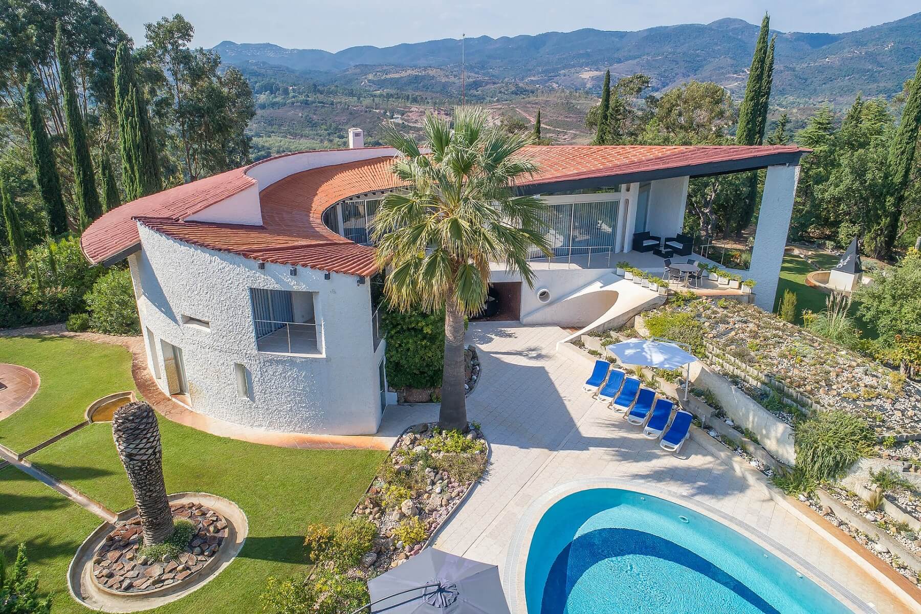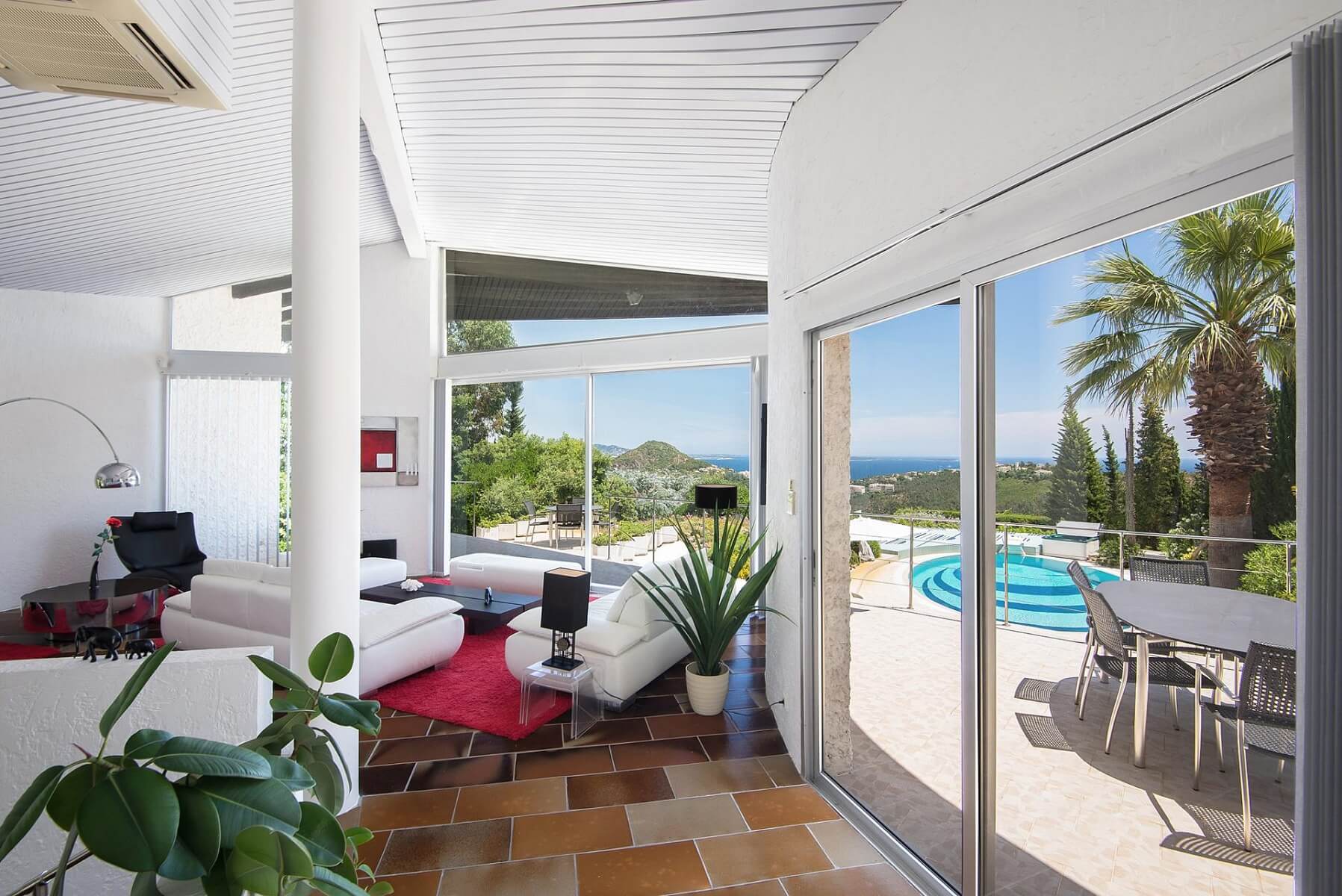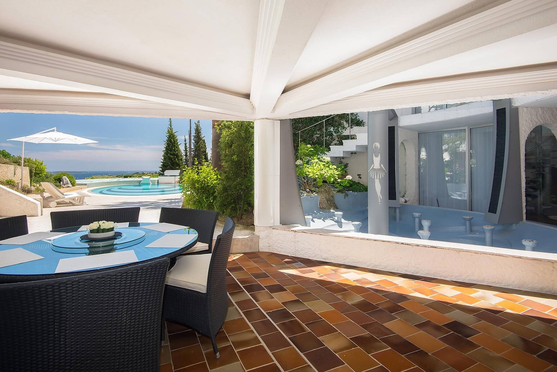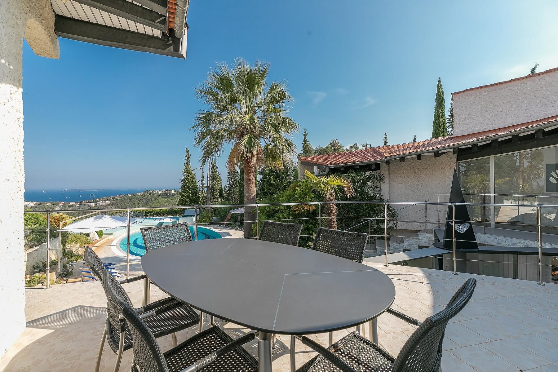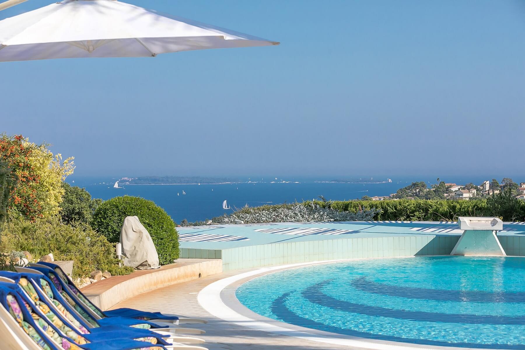 Atypicky řešená nemovitost situovaná na prestižním místě s panoramatickým výhledem na francouzskou riviéru od zálivu v Cannes až k pohoří Esterel, ležící na pozemku 12.000 m2, v srdci rozlehlého parku, 5 minut od moře a obchodů, 15 minut do Cannes.