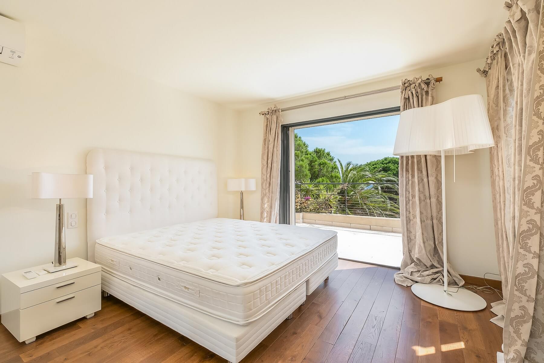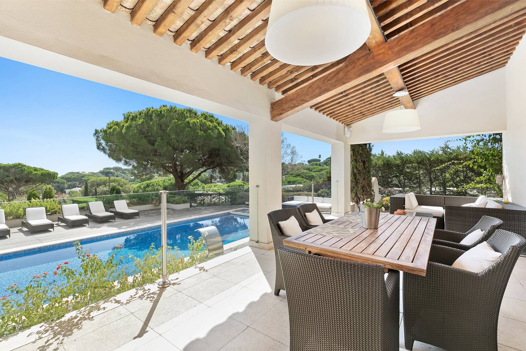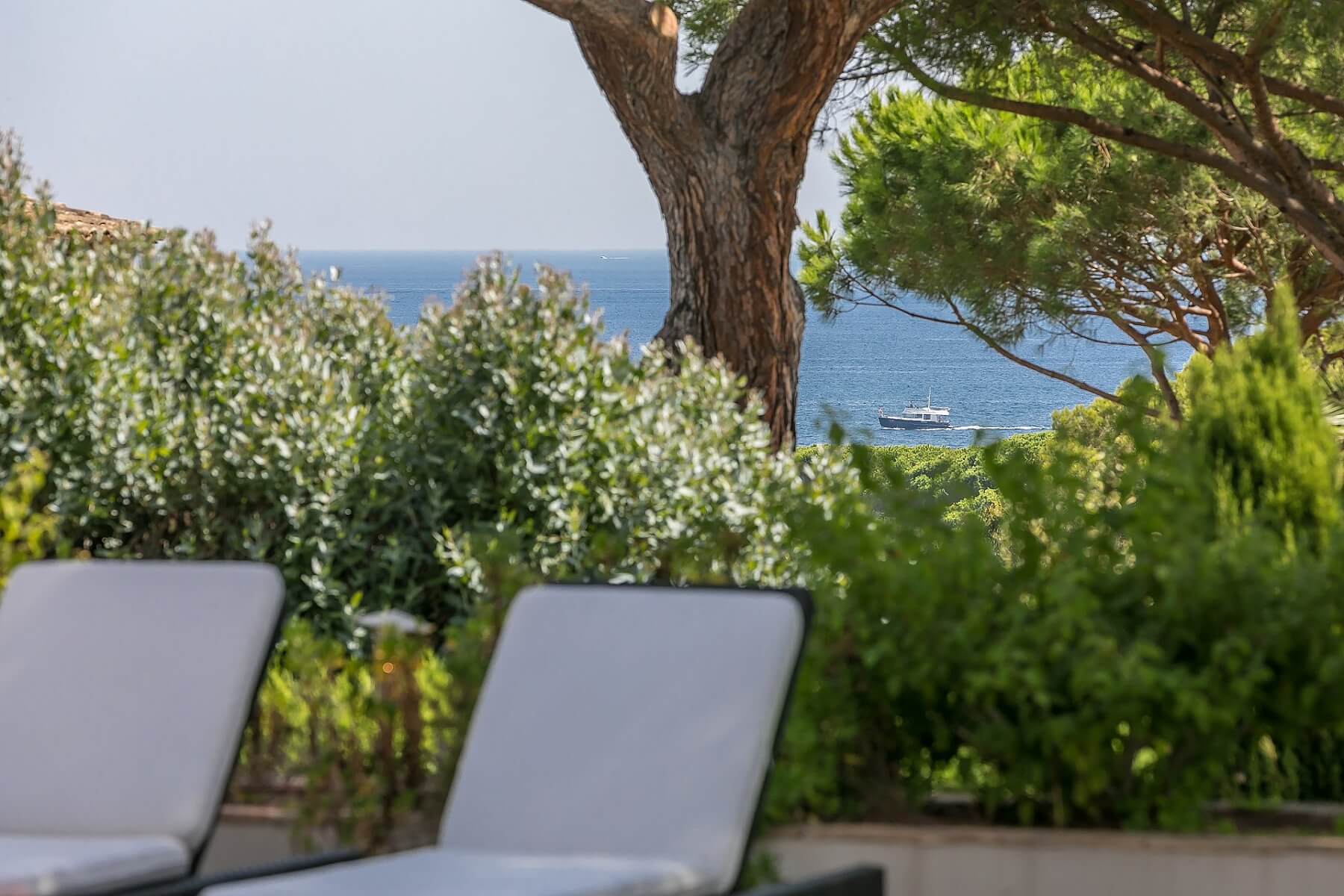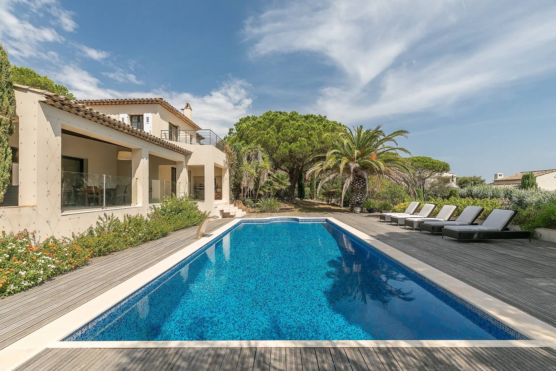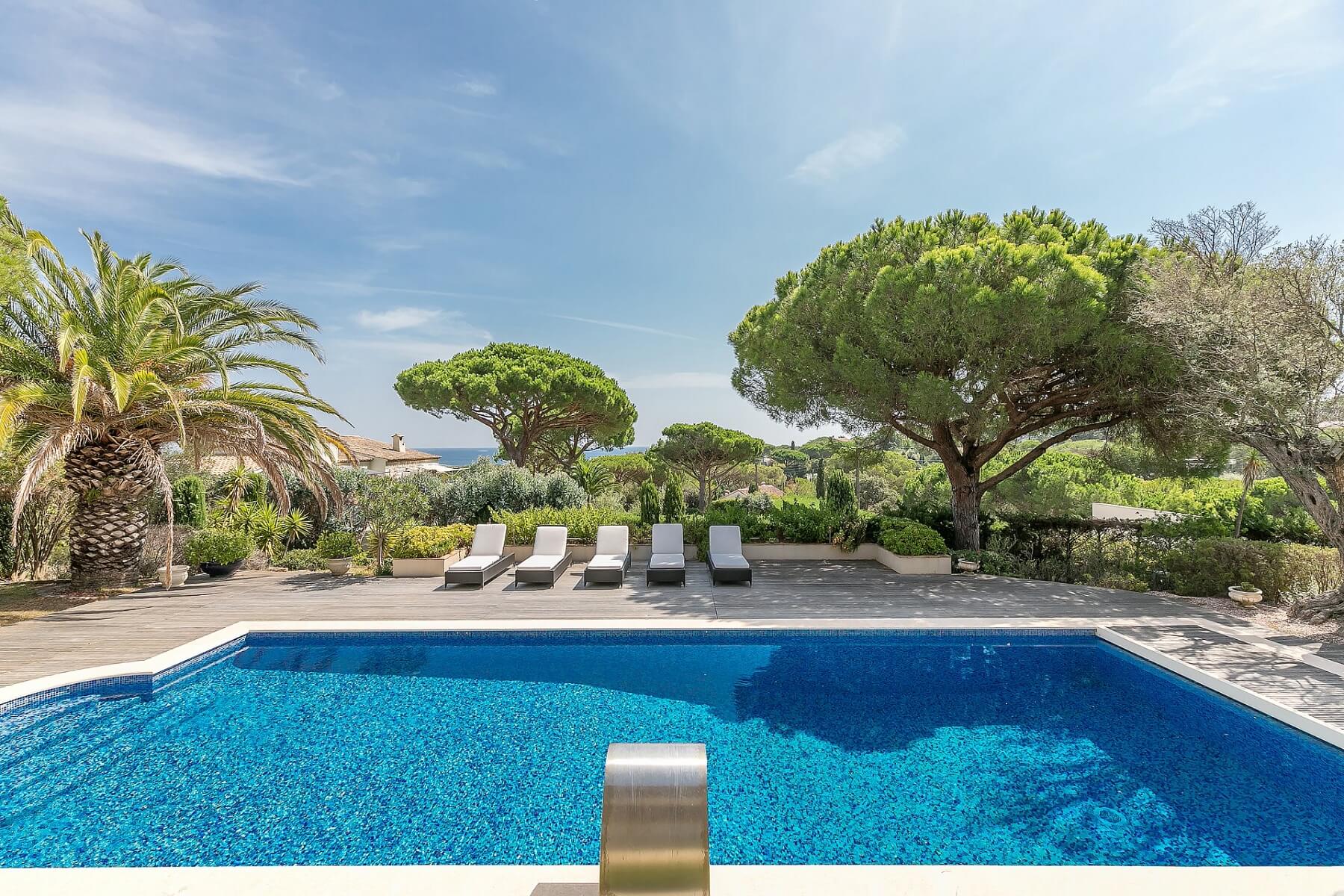 Letní vila ukrytá na pozemku cca 2047 m2 s výhledem na moře, se zahradou s vzrostlými dřevinami a vyhřívaným bazénem, ideálně umístěná v blízkosti pláží Pampelonne nabízí 4 ložnice s koupelnami, fitness místnost s výhledem na záliv a samostatný byt pro Vaše hosty.