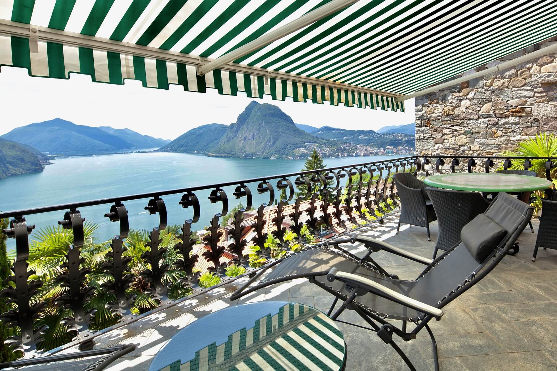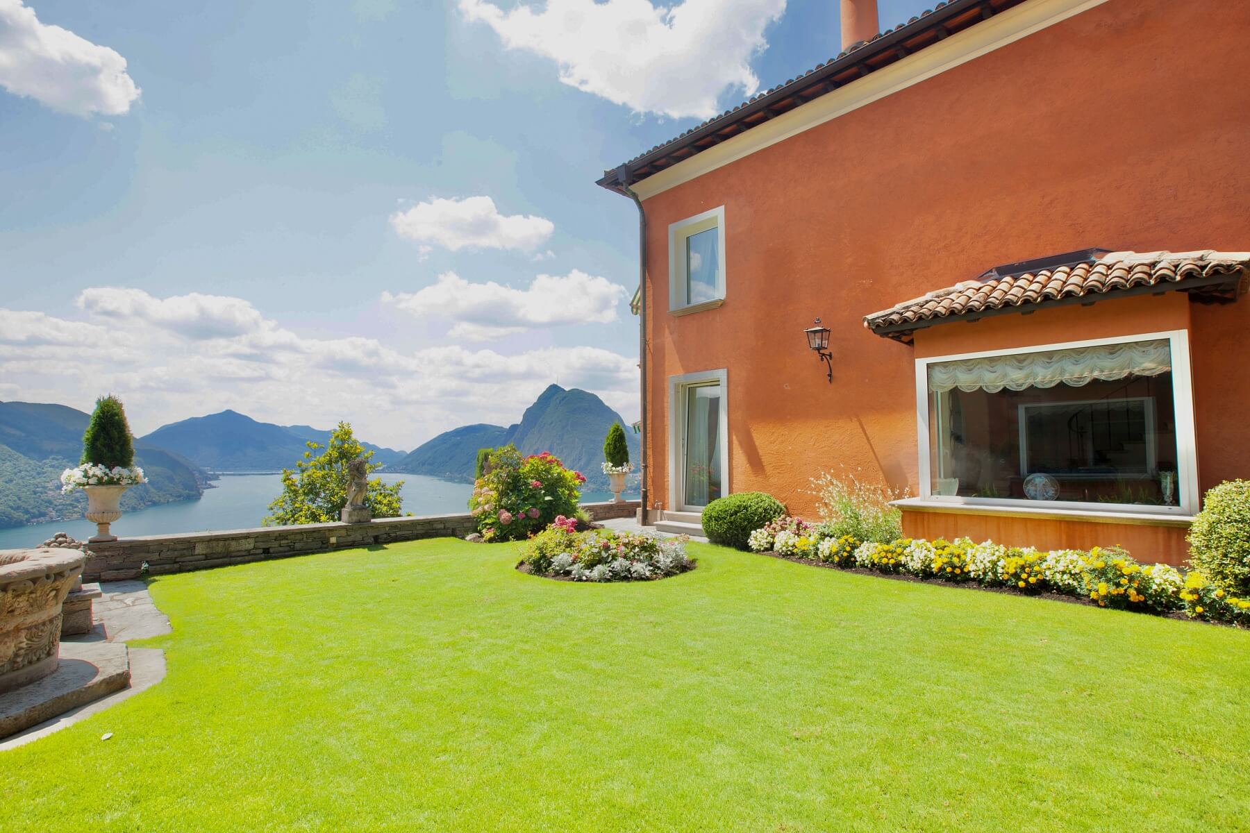 Kouzelná vila středomořského typu stojí přímo nad jezerem Lugano a nabízí tak naprosto otevřené impozantní výhledy na vodní hladinu a Alpy.