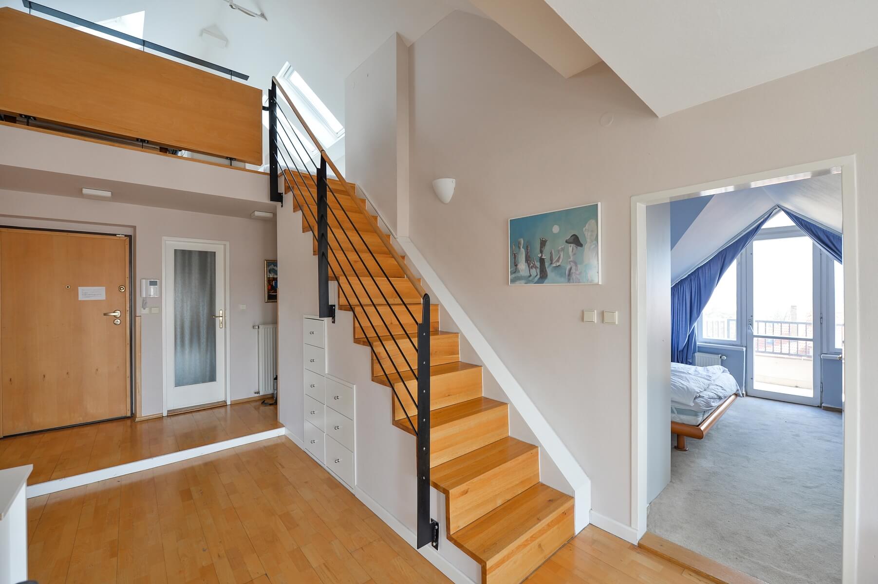 Nabízená nemovitost je jižně orientovanou polovinou dvojdomu. V přízemí se nachází bytová jednotka o výměře 96 m2 a dispozici 3+1, kterou tvoří obývací pokoj s arkýřem, 2 neprůchozí ložnice, kuchyně, koupelna, samostatná toaleta a velká vstupní hala. Obdobnou dispozici i výměru má byt v patře. Podkroví o velikosti asi 80 m2 má dispoziční řešení 3+kk: obývací pokoj s kuchyňským koutem a jídelnou, mezonetová ložnice s terasou s krásným výhledem na Prahu, 2. ložnice, galerie, koupelna a samostatná toaleta. Suterén je momentálně uzpůsoben pro kancelářské účely, je zde vstupní hala (recepce), 3 kanceláře, kuchyňka a koupelna s WC a předsíňkou. Kanceláře mají přímý vstup do zahrady.