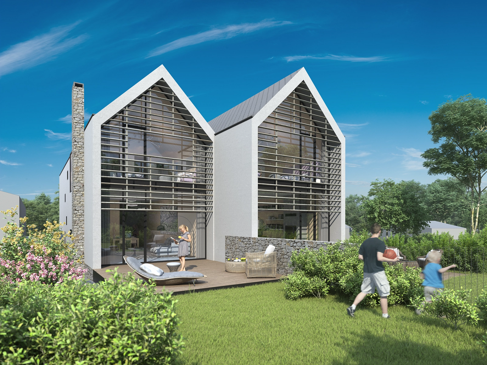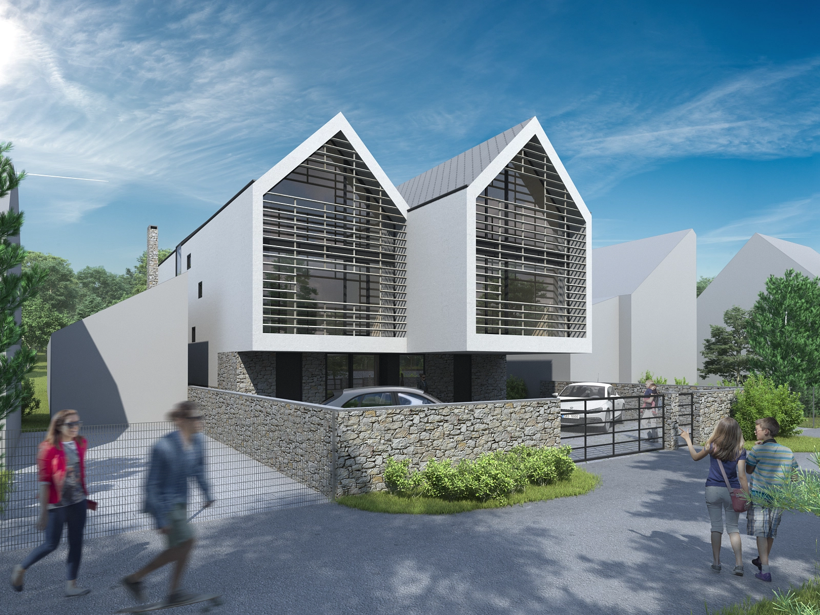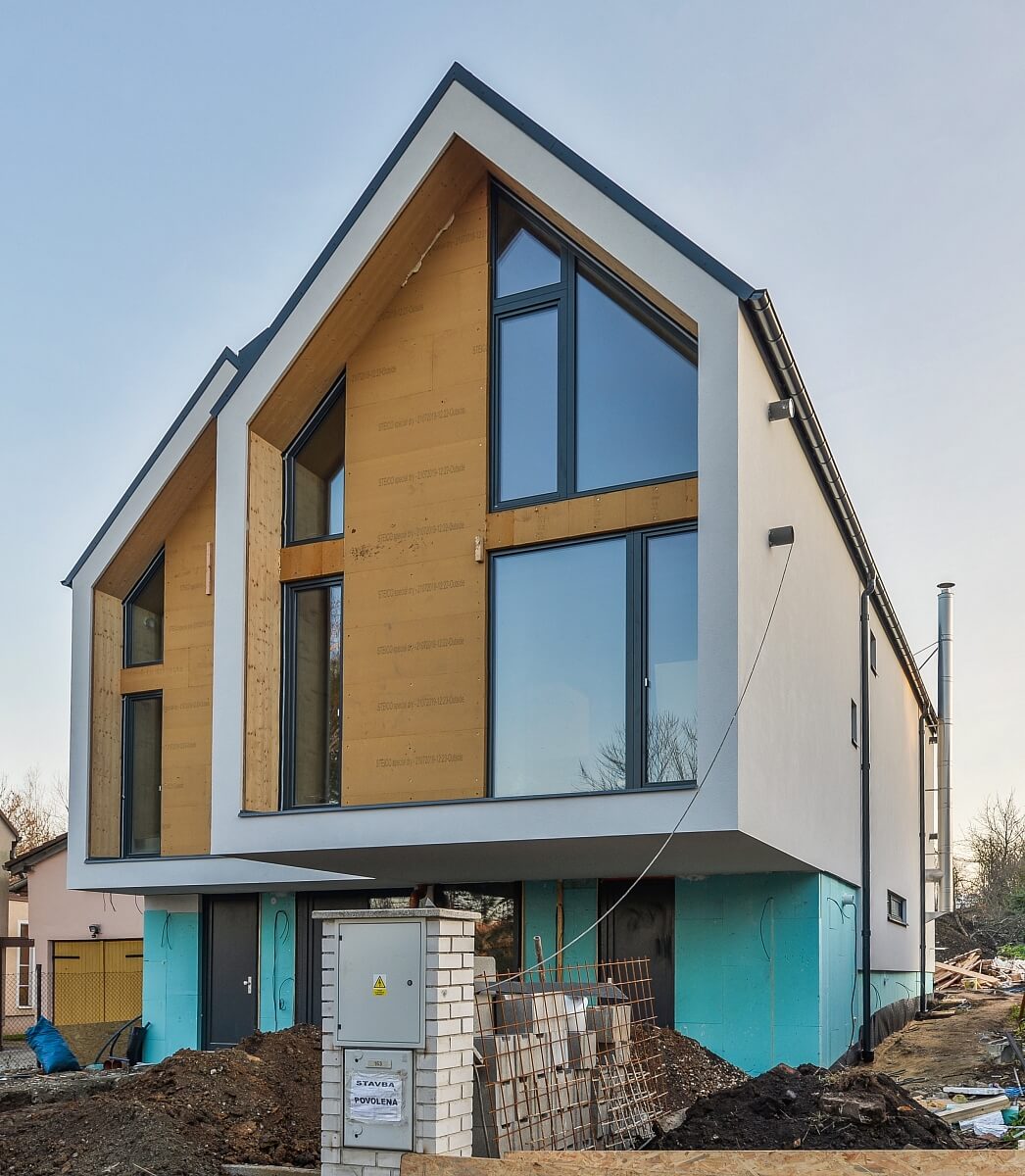 Novostavba vzdušné rodinné vily právě vzniká v obci na jihozápadním okraji Prahy, nedaleko stanice metra Luka. Polovina dvojdomu nabízí díky ustoupenému půdorysu dostatek soukromí v interiéru i na terase.