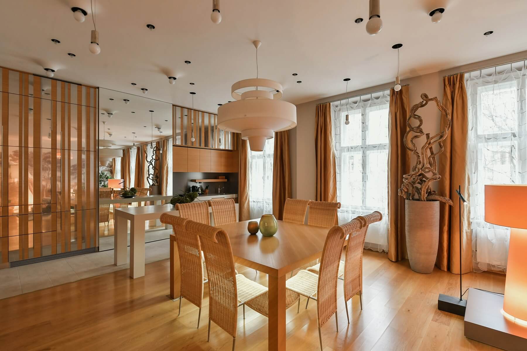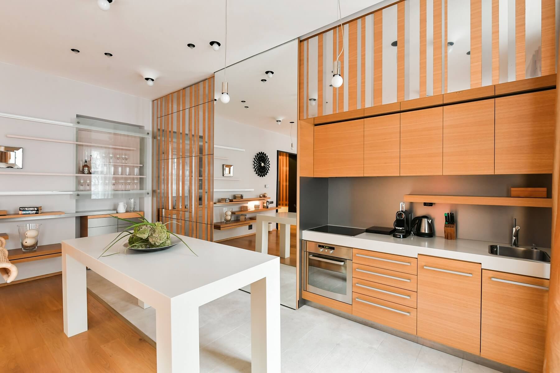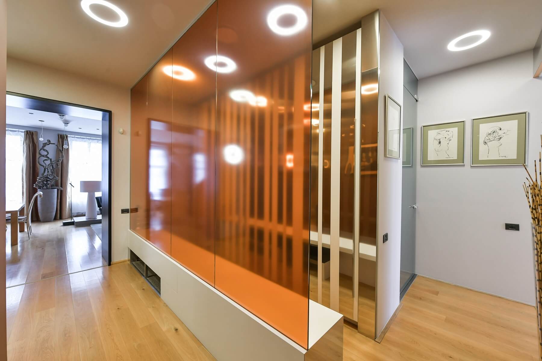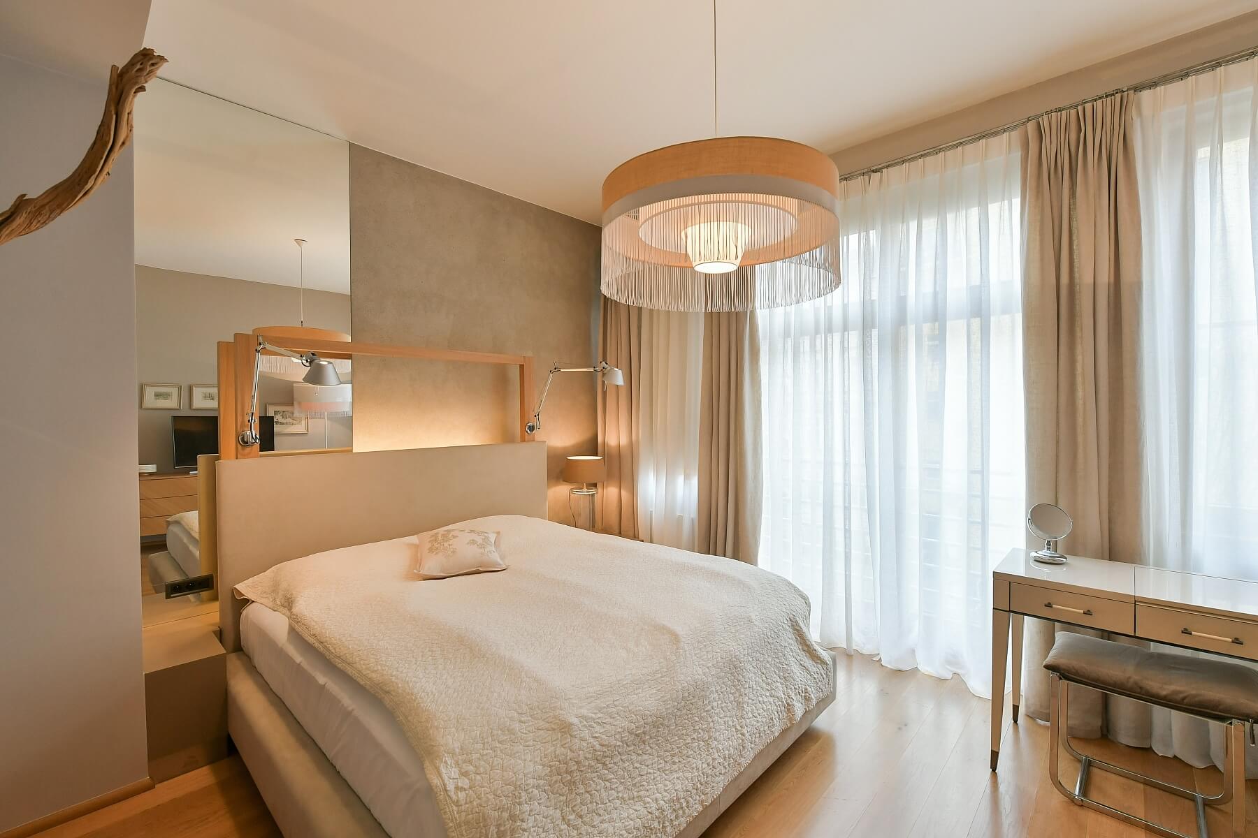 Interiér bytu tvoří velký obývací pokoj s plně vybavenou kuchyní a jídelním prostorem, 2 ložnice orientované do vnitrobloku, dále koupelna s vanou, sprchovým koutem a toaletou, vybavená šatna, toaleta pro hosty s úložnými prostory a vstupní chodba s šatnou a technickým zázemím.