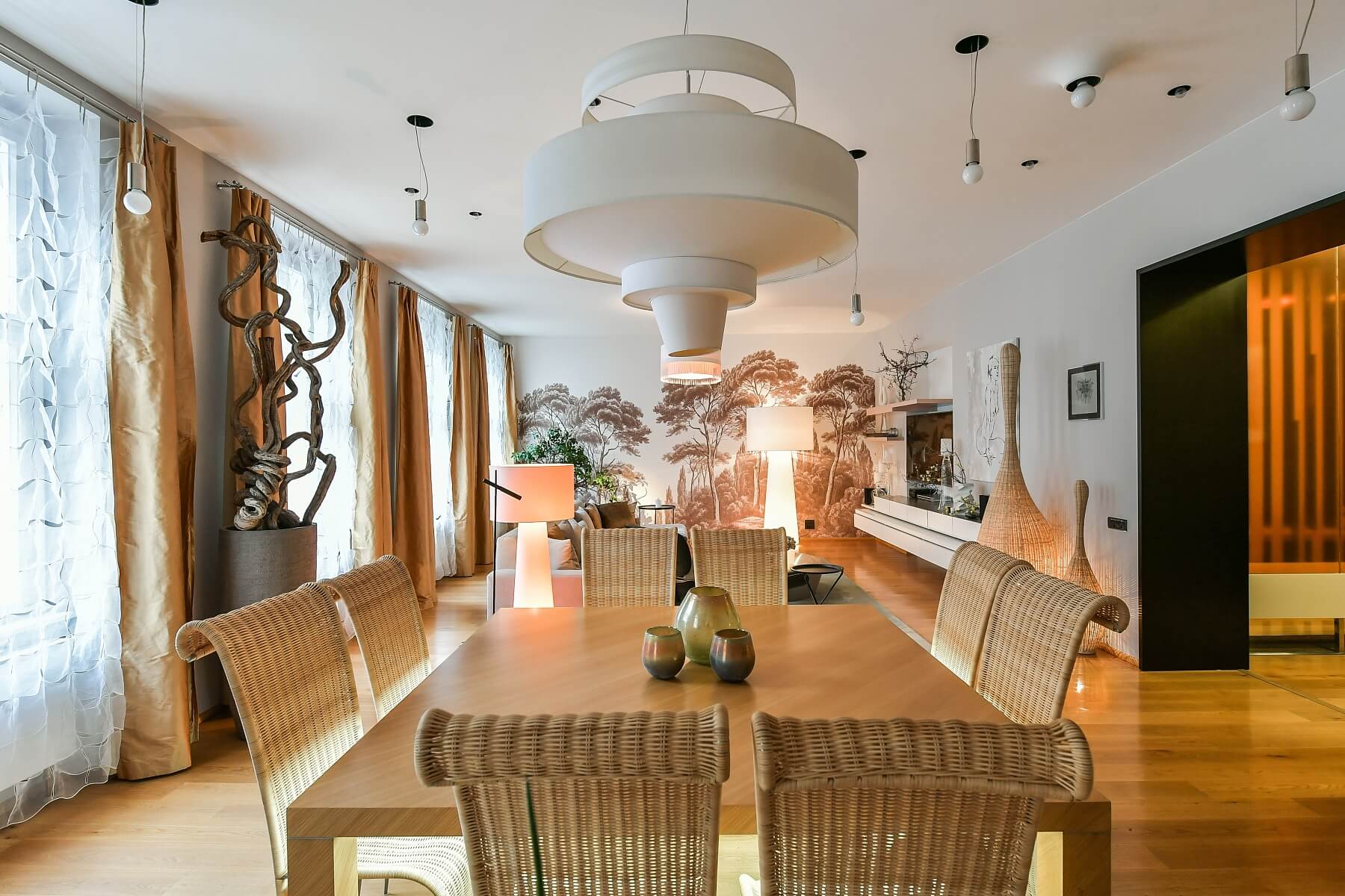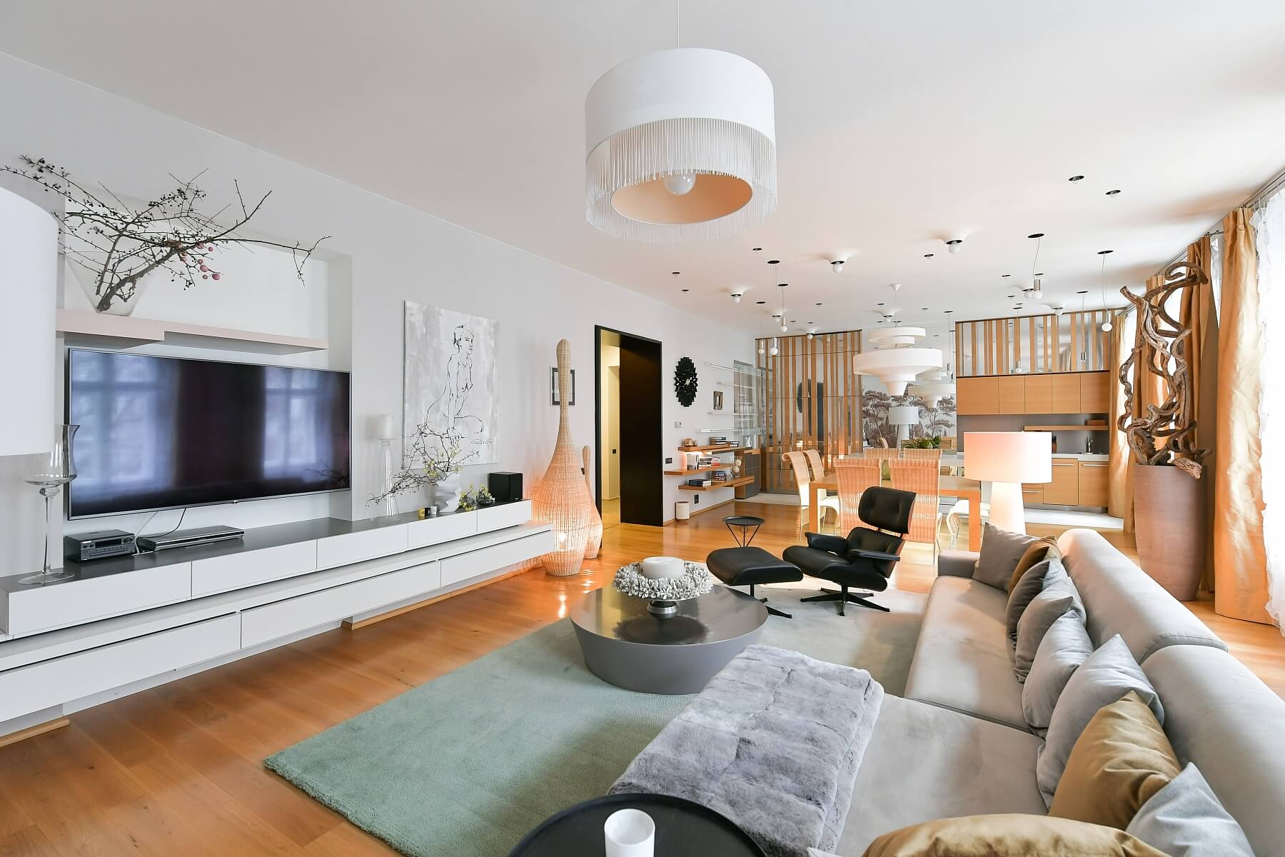 Designové vybavení, parkety, dlažba, plynový kotel, pračka se sušičkou, kamenná kuchyňská pracovní deska, myčka, mikrovlnná trouba, TV, sklep o 12 m2.