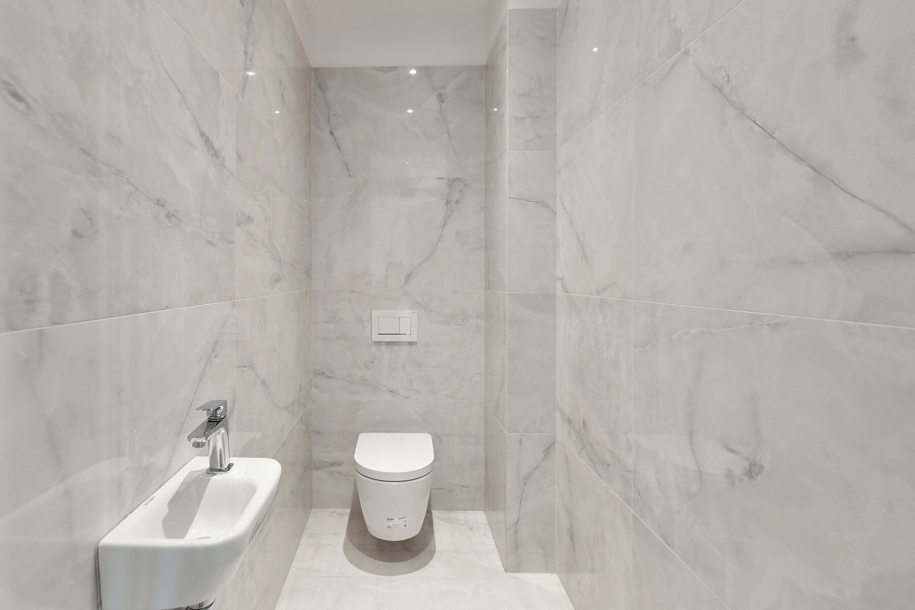 Interiér bytu tvoří prostorný obývací pokoj s plně vybavenou kuchyní a jídelním prostorem, hlavní ložnice s en-suite koupelnou (sprchový kout, bidet, toaleta) a balkonem do klidného vnitrobloku, ložnice s en-suite koupelnou (sprchový kout, toaleta), technická místnost, toaleta pro hosty a otevřený vstupní prostor s vestavěnými úložnými prostory.