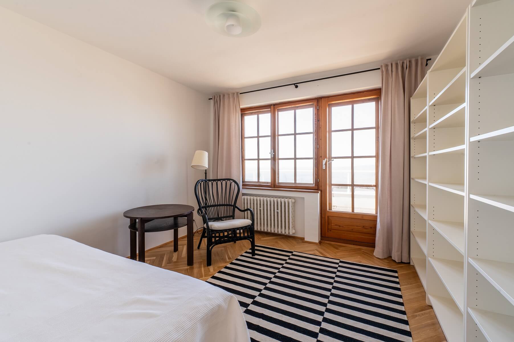 Byt prošel kompletní rekonstrukcí: jsou zde dřevěné parkety, klimatizace, velké hliníkové okno na terasu, dřevěná okna. Byt se pronajímá kompletně a vkusně zařízený.