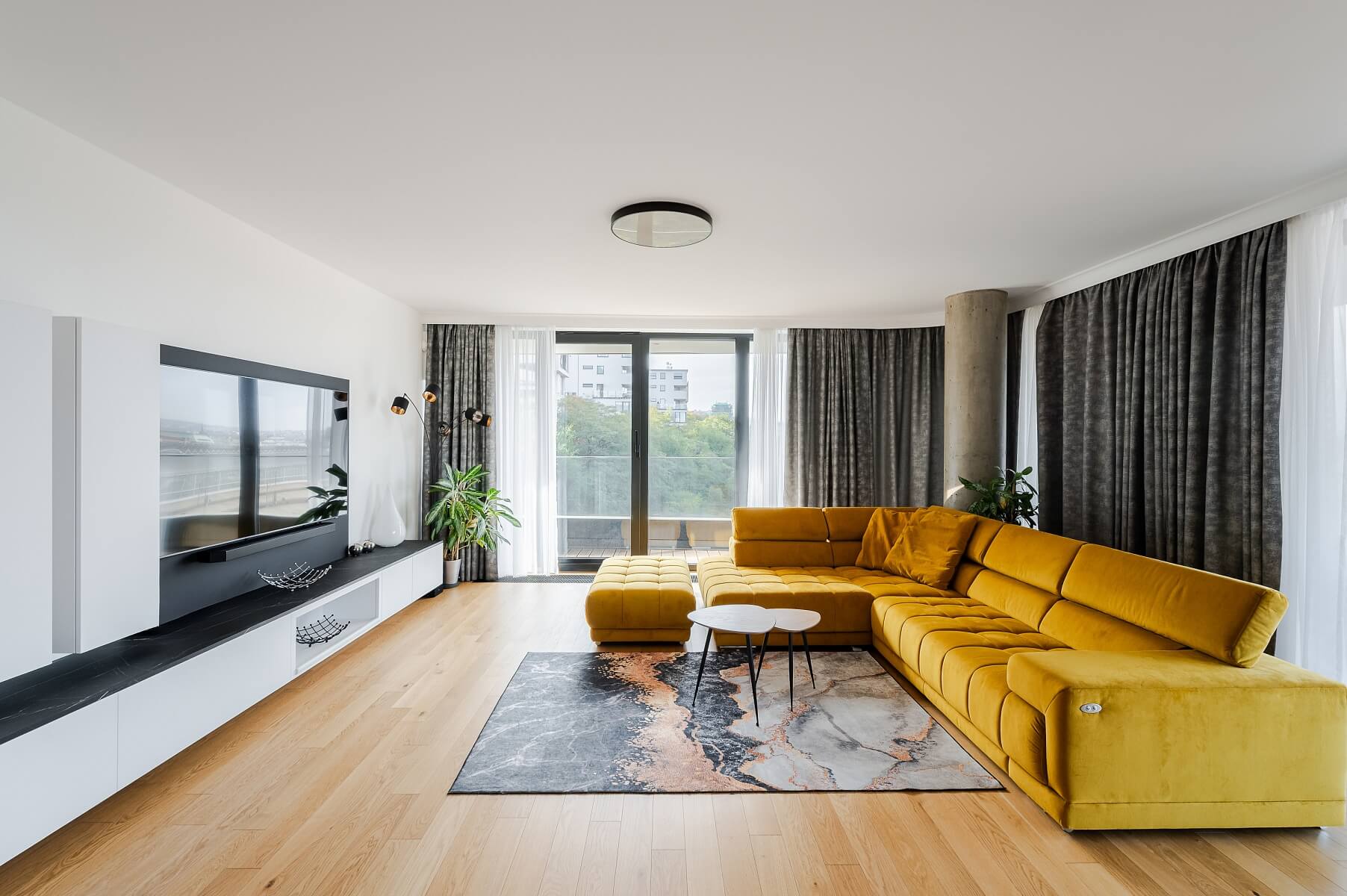 Interiér bytu tvoří obývací pokoj s plně vybavenou kuchyní, terasou podél celého obvodu a pěknými výhledy na město, Pražský hrad a Petřín, hlavní ložnice s vestavěnými skříněmi, pracovna / ložnice pro hosty s vestavěnou skříní, 2 koupelny (masážní vana, bidet, toaleta / sprchový kout, toaleta) a vstupní chodba s vestavěnými skříněmi.