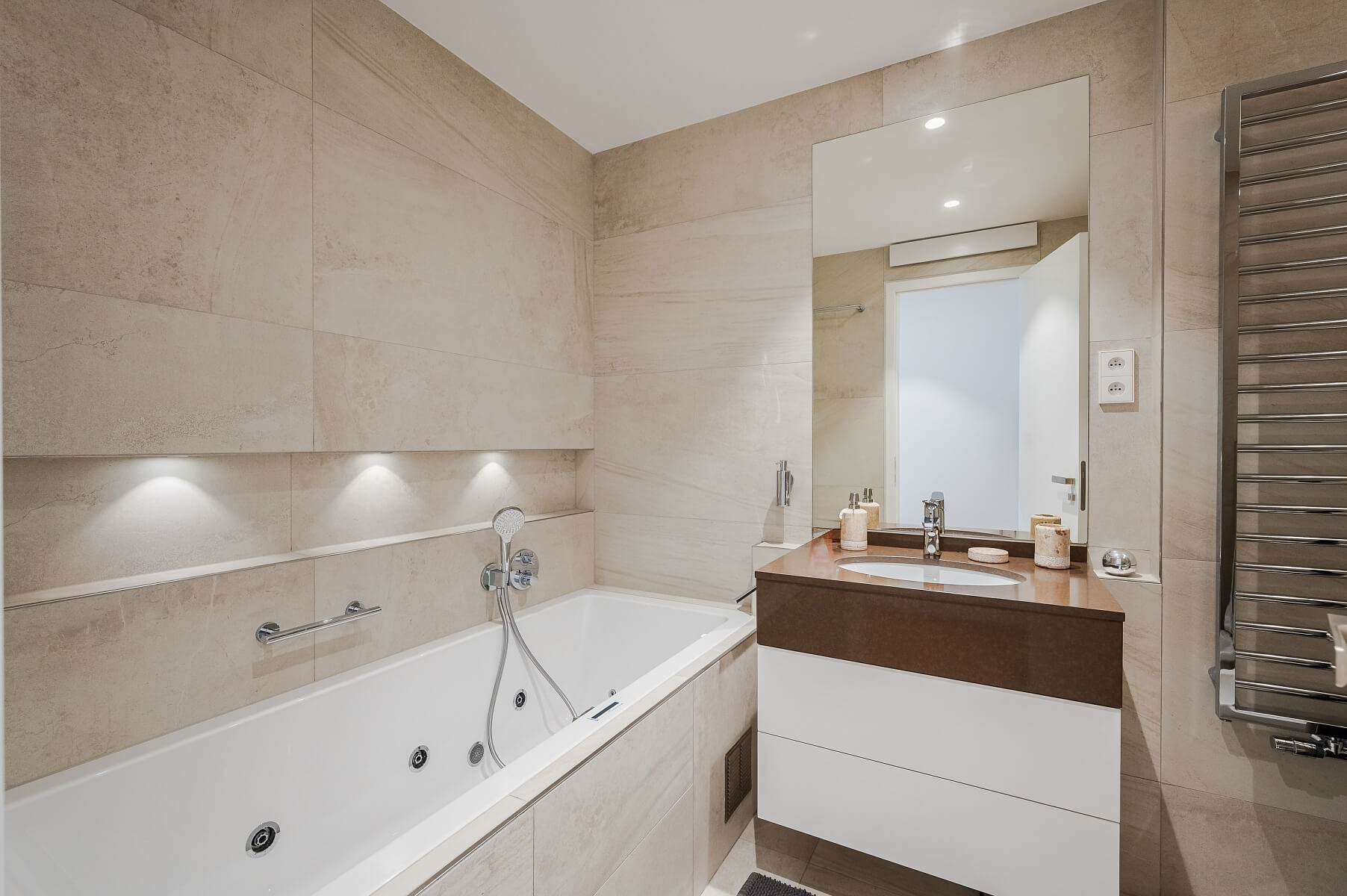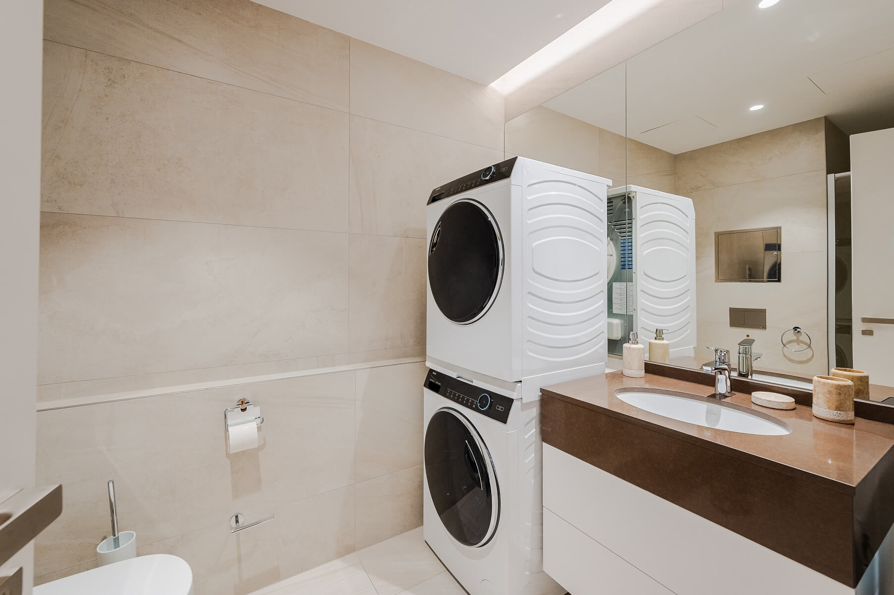 Klimatizace, systém inteligentního ovládání domácnosti zn. Loxone, masivní dřevěné podlahy, dlažba, bezpečnostní vstupní dveře, centrální topení, podlahové vytápění v koupelnách, pračka, sušička, myčka, indukční varná deska, mikrovlnná trouba, 2 TV, sklep, výtah, kočárkárna. V ceně je zahrnuto garážové stání.