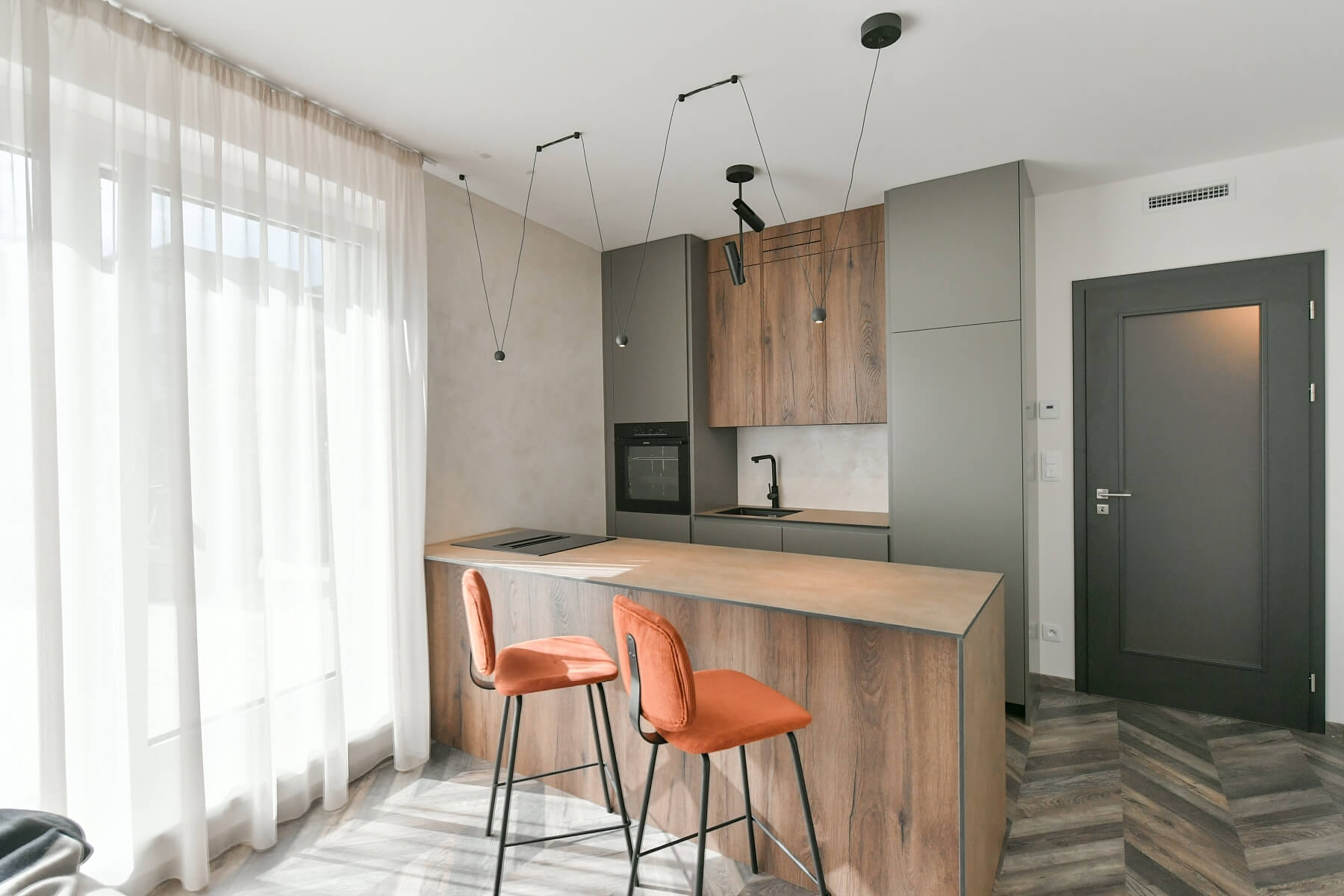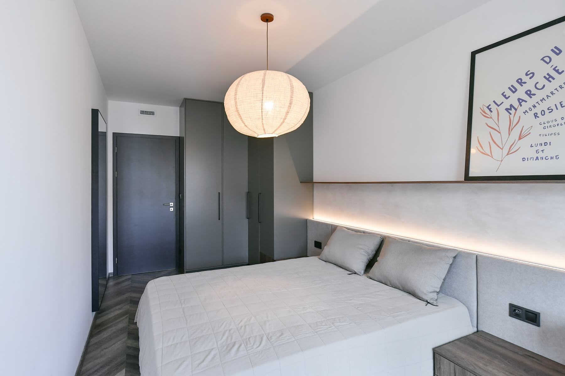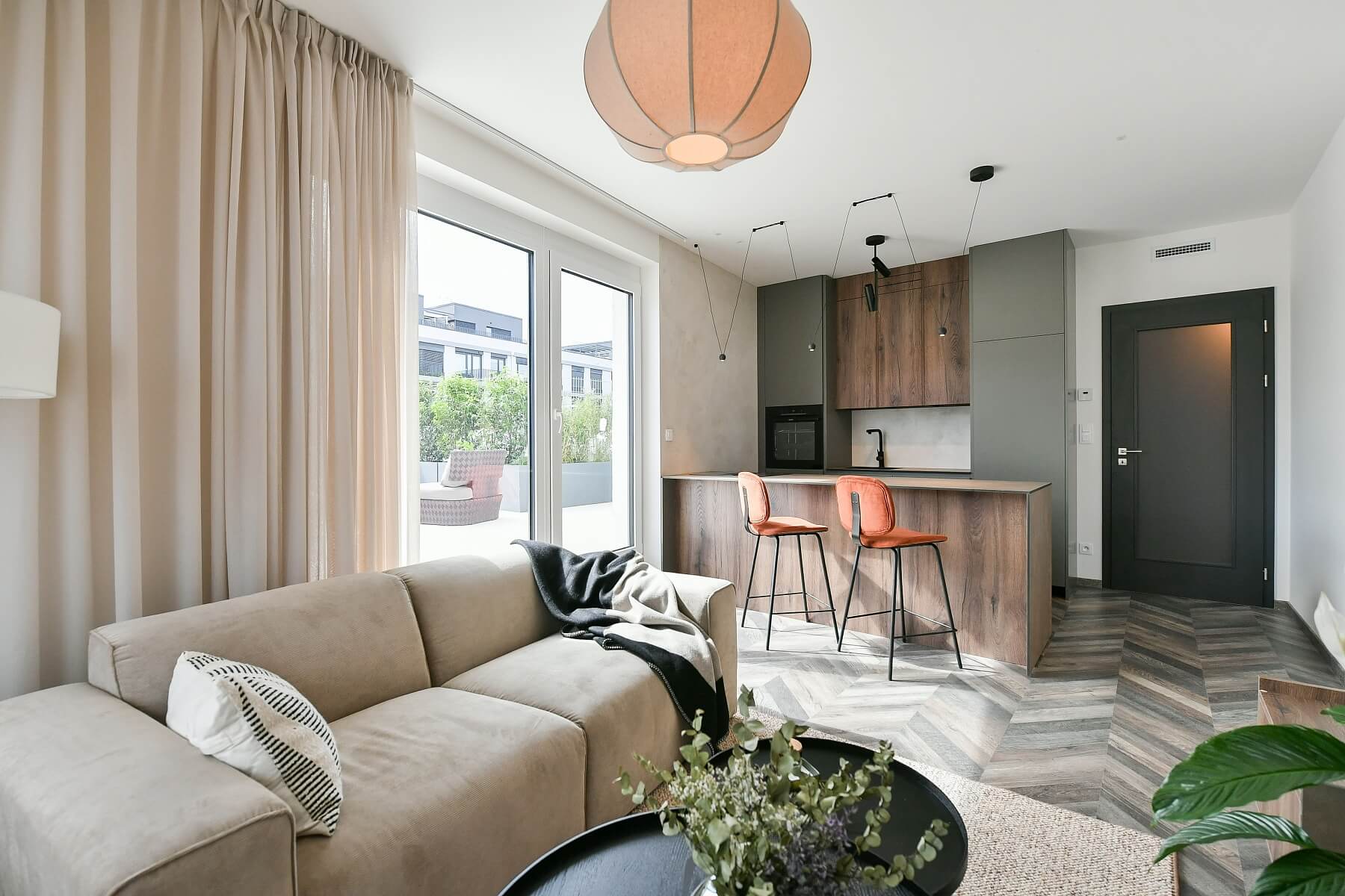 Byt tvoří obývací pokoj s plně vybavenou kuchyní a přístupem na balkon i terasu se zelení a posezením, ložnice s vestavěnými skříněmi a nábytkem a přístupem na balkon, koupelna (vana, toaleta, vestavěný nábytek), technická místnost a vstupní chodba s vestavěnou skříní.
