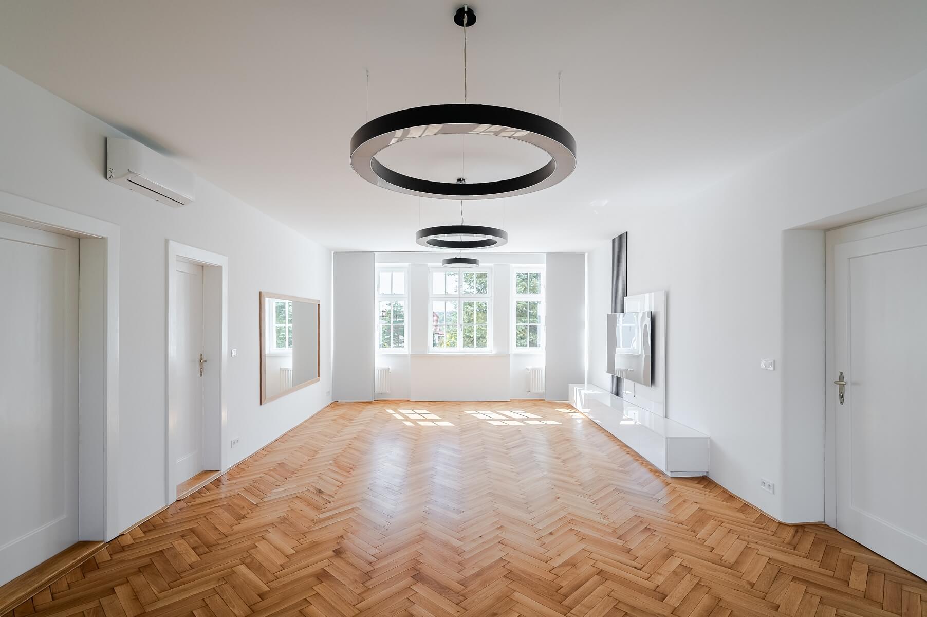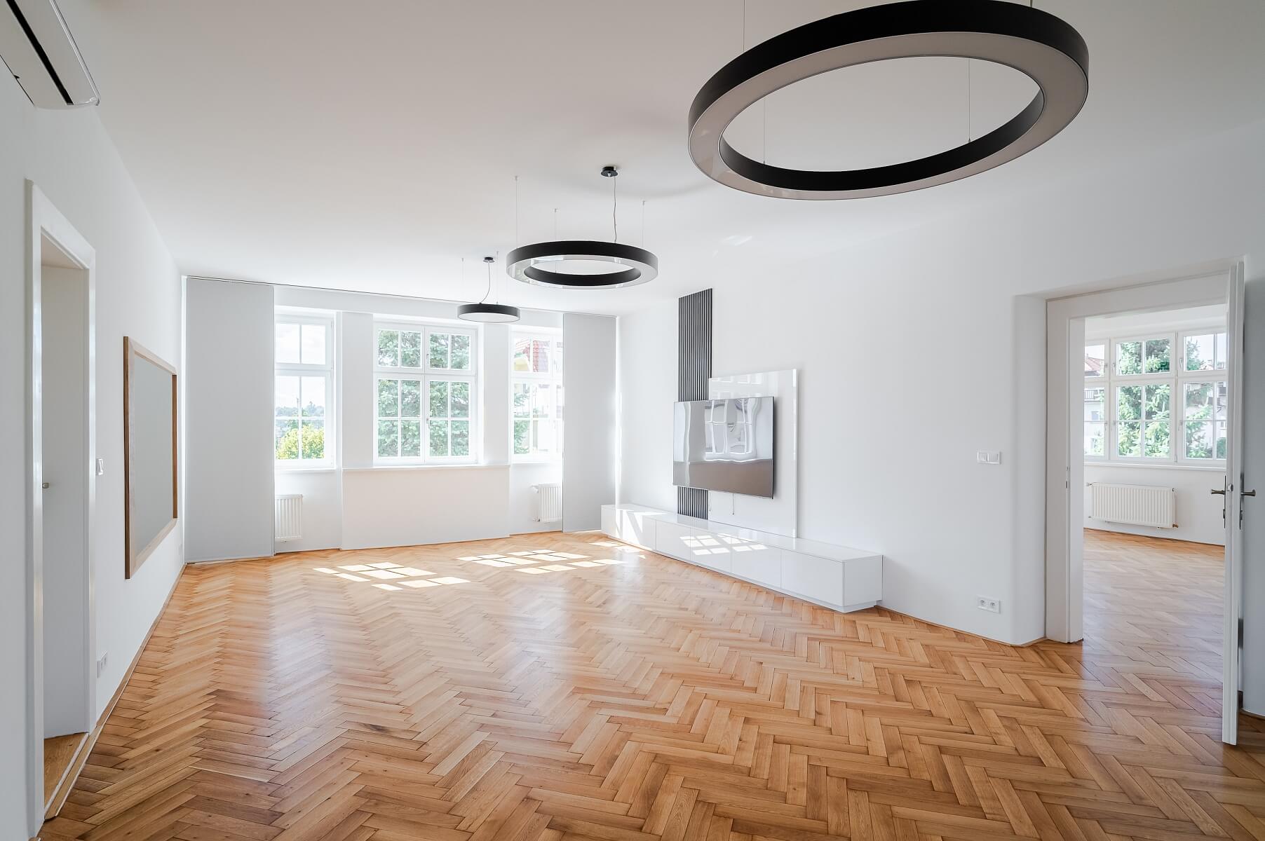 Nabízíme k pronájmu prostorný nezařízený byt s lodžií, parkováním a možností užívání zahrady, situovaný v 1. patře renovované činžovní vily v prestižní rezidenční čtvrti Hanspaulka. Dům stojí v klidné ulici v blízkosti lesoparku Horní Šárka, v lokalitě s rychlým spojením do centra a k plné občanské vybavenosti, do mezinárodních škol a na letiště. Nejbližší stanice metra jsou nedaleká Bořislavka a Dejvická.