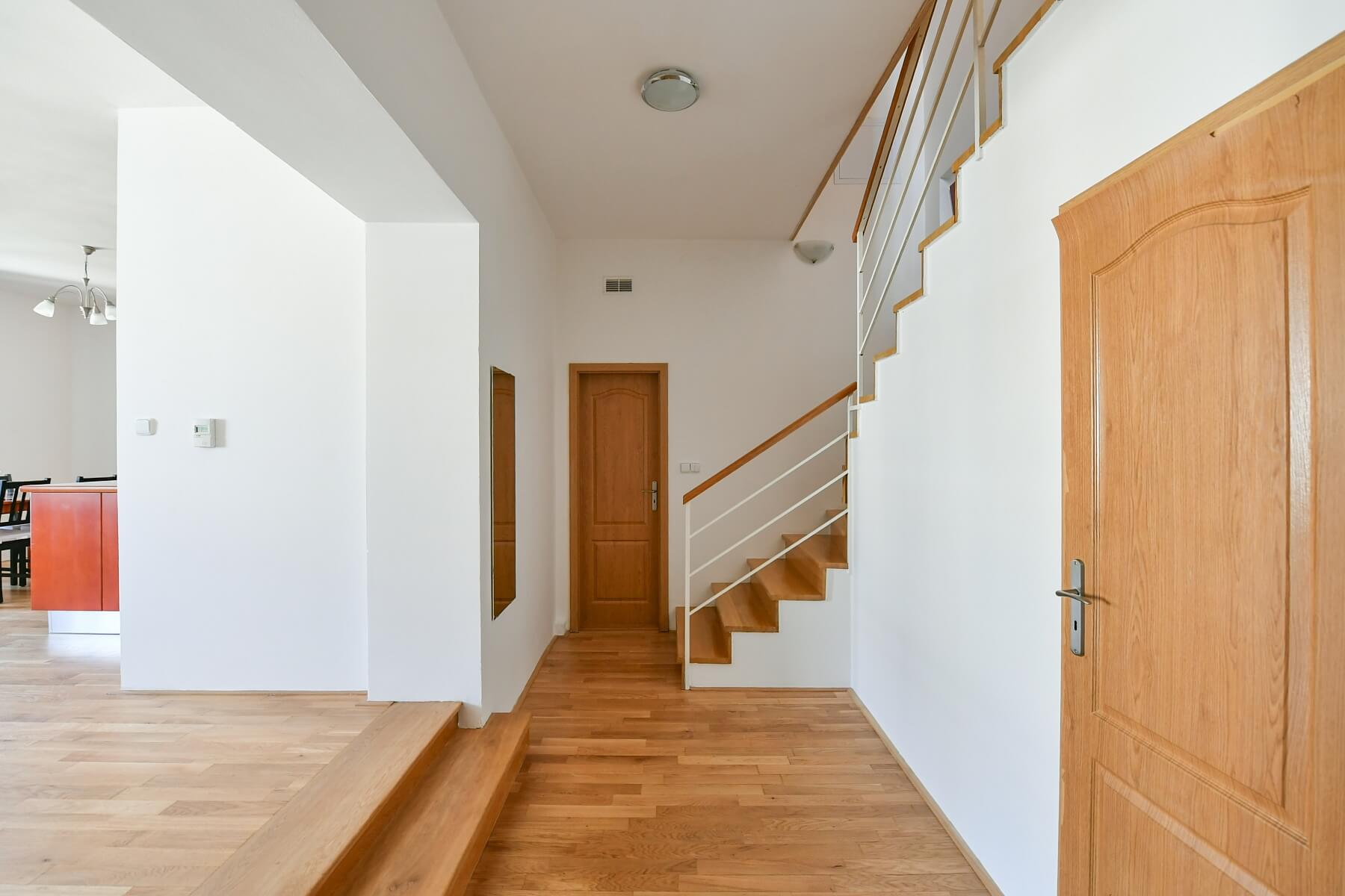 Dřevěné podlahy, dlažba, bezpečnosntí vstupní dveře, úložné prostory, plynový kotel, pračka, myčka, indukční varná deska, mikrovlnná trouba, kávovar.