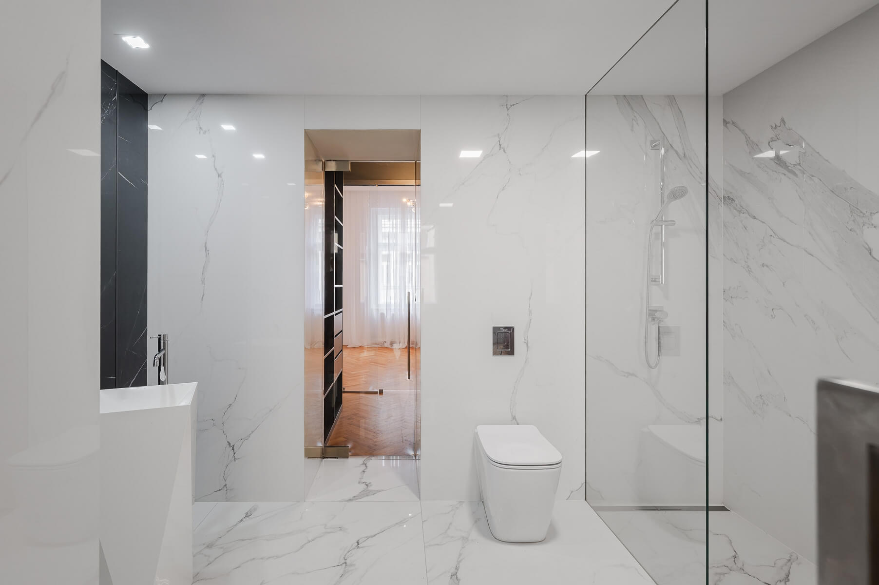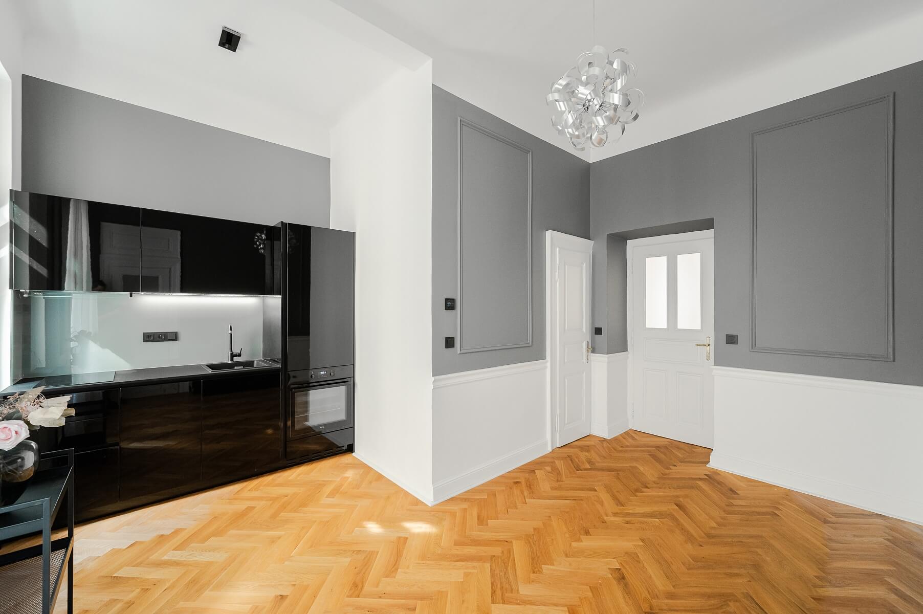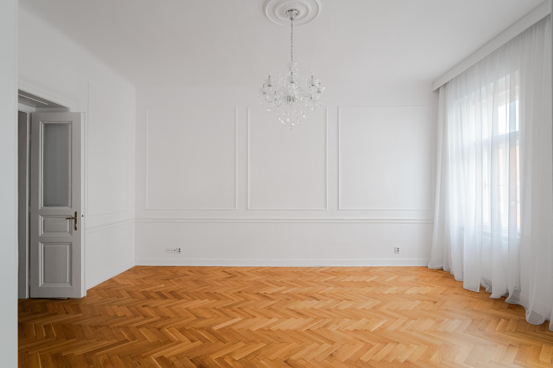 Masivní dřevěné podlahy, velkoformátová dlažba, vysoké štukované stropy, bezpečnostní vstupní dveře, plynový kotel, pračka, myčka, indukční varná deska.