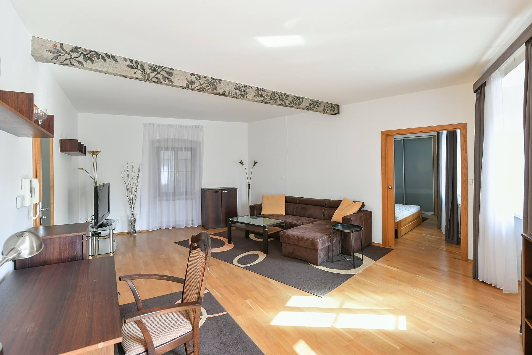 Plovoucí podlahy, plynové topení, rozkládací pohovka, elektrické zvedání postelí, pračka se sušičkou, myčka, mikrovlnná trouba, videotelefon, TV.