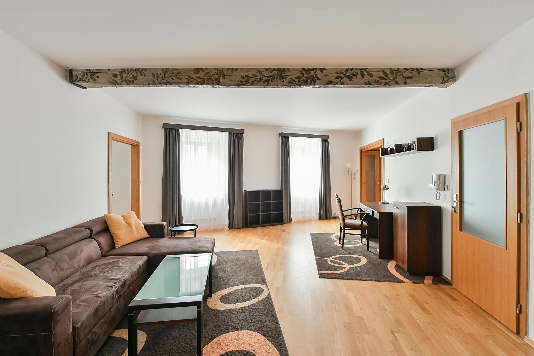 Renovovaný byt na pronájem pouhých 50 metrů od Karlova mostu! Kompletně zařízený byt v 1. patře rekonstruované historické budovy s výtahem na Malé Straně, pár minut chůze od zastávky tramvají a stanice metra Malostranská.