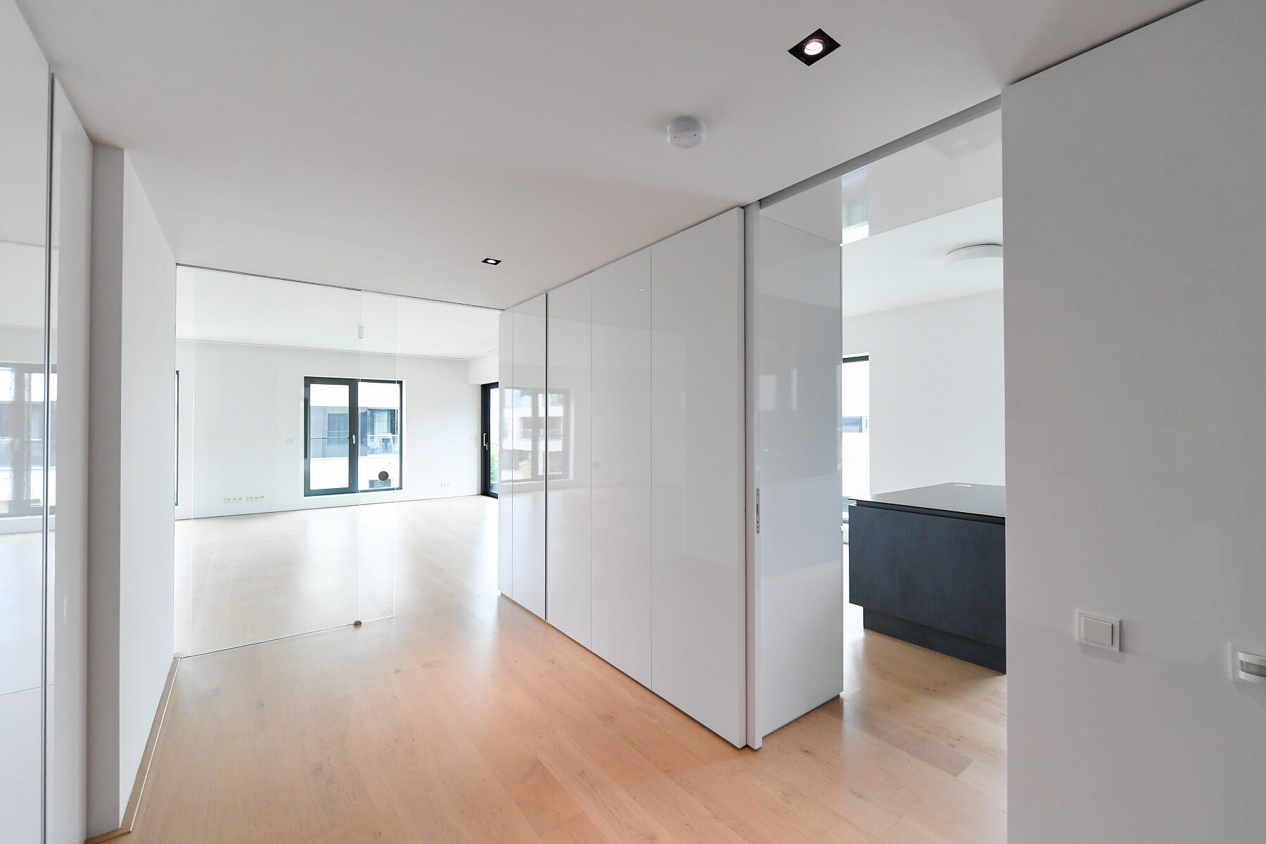 Interiér bytu tvoří prostorný obývací pokoj s plně vybavenou kuchyní a jídelnou, 3 ložnice, 2 koupelny, šatna, technická místnost, toaleta pro hosty a vstupní hala.