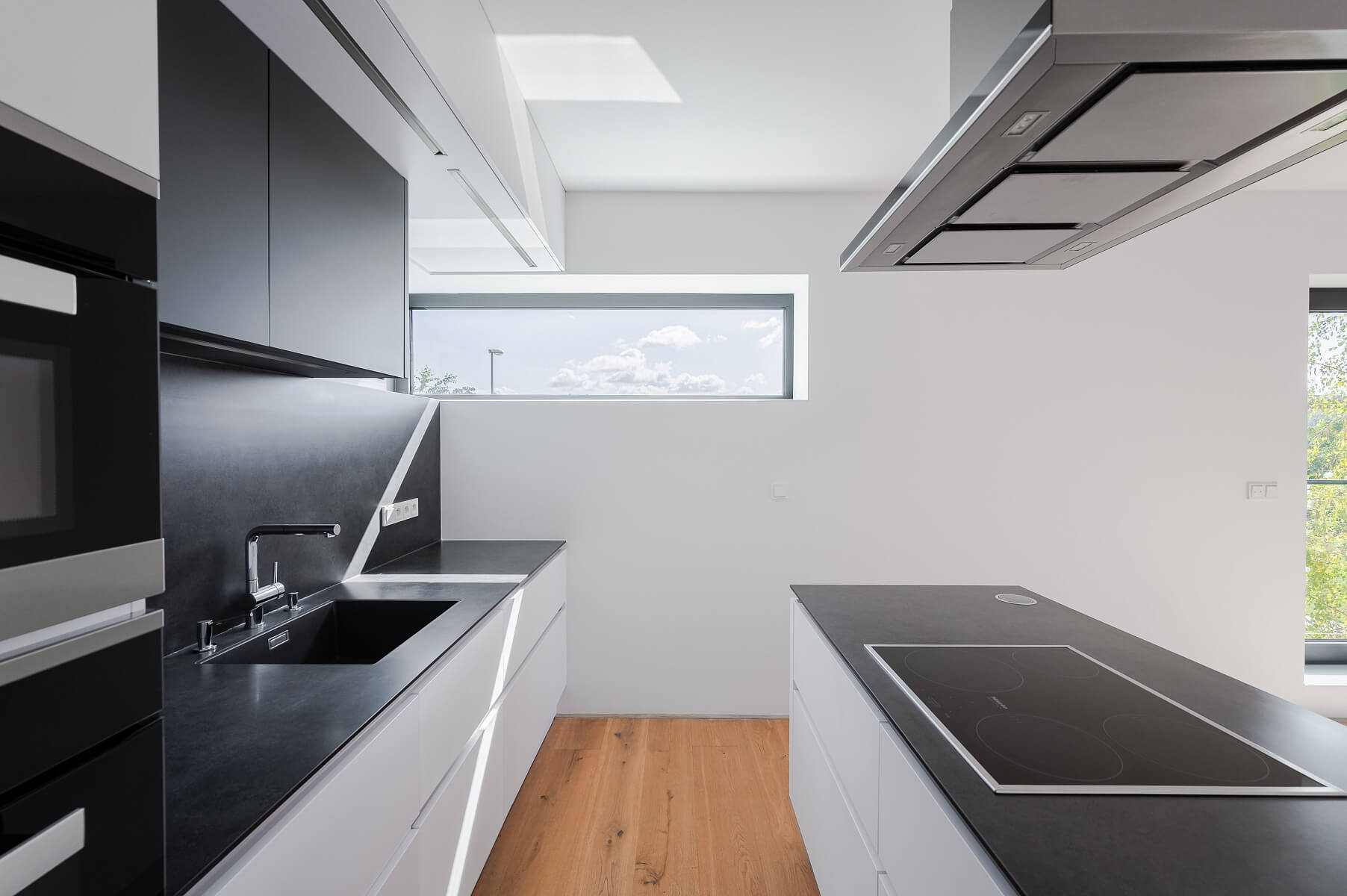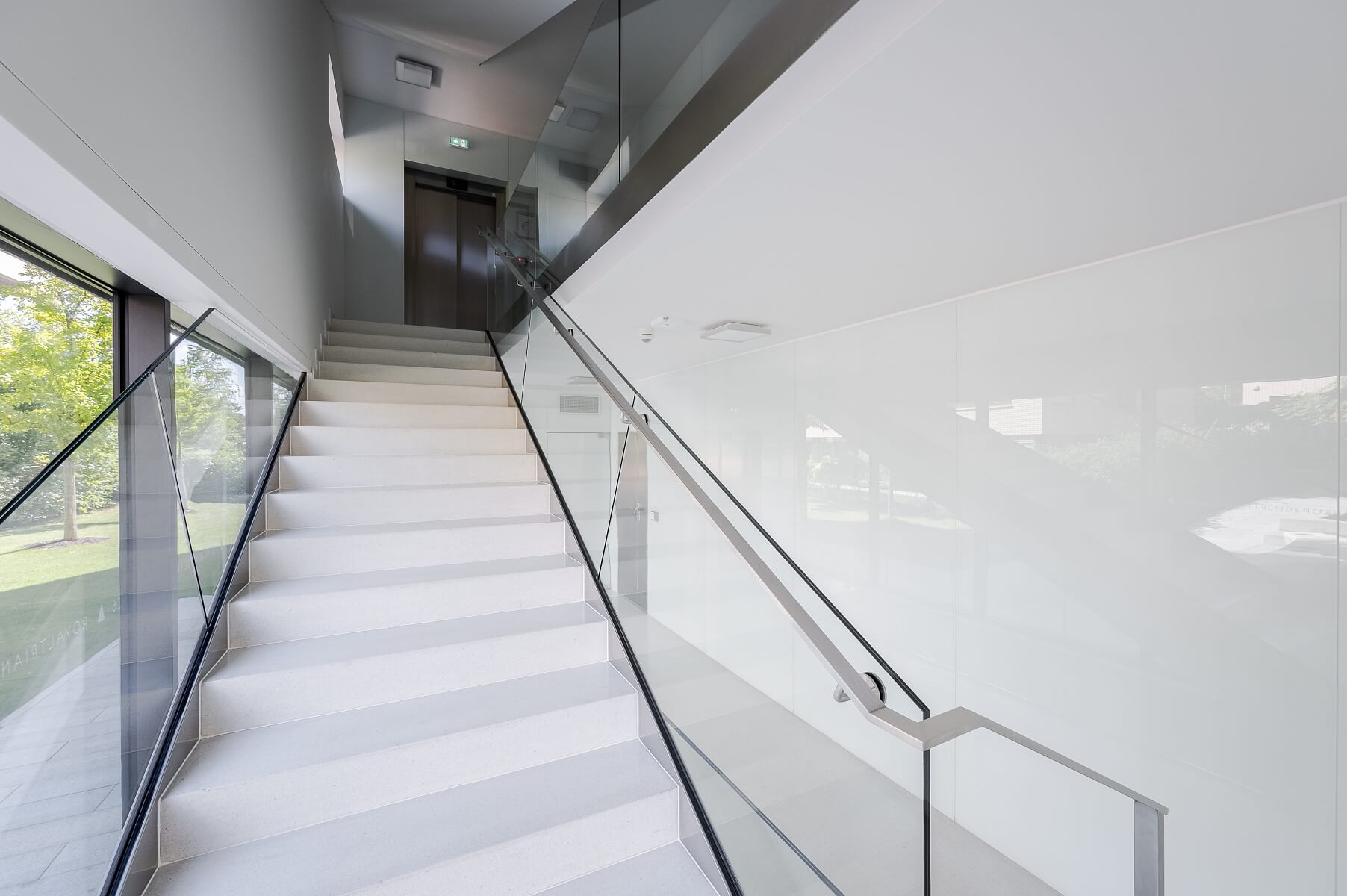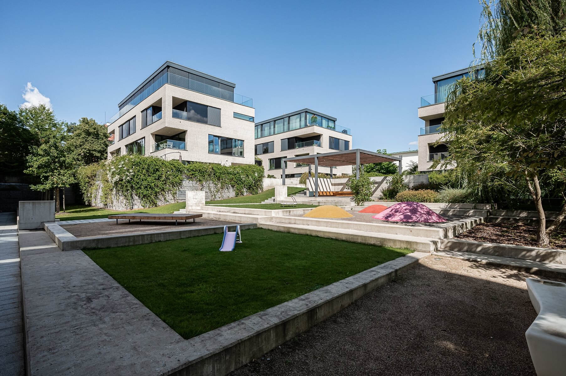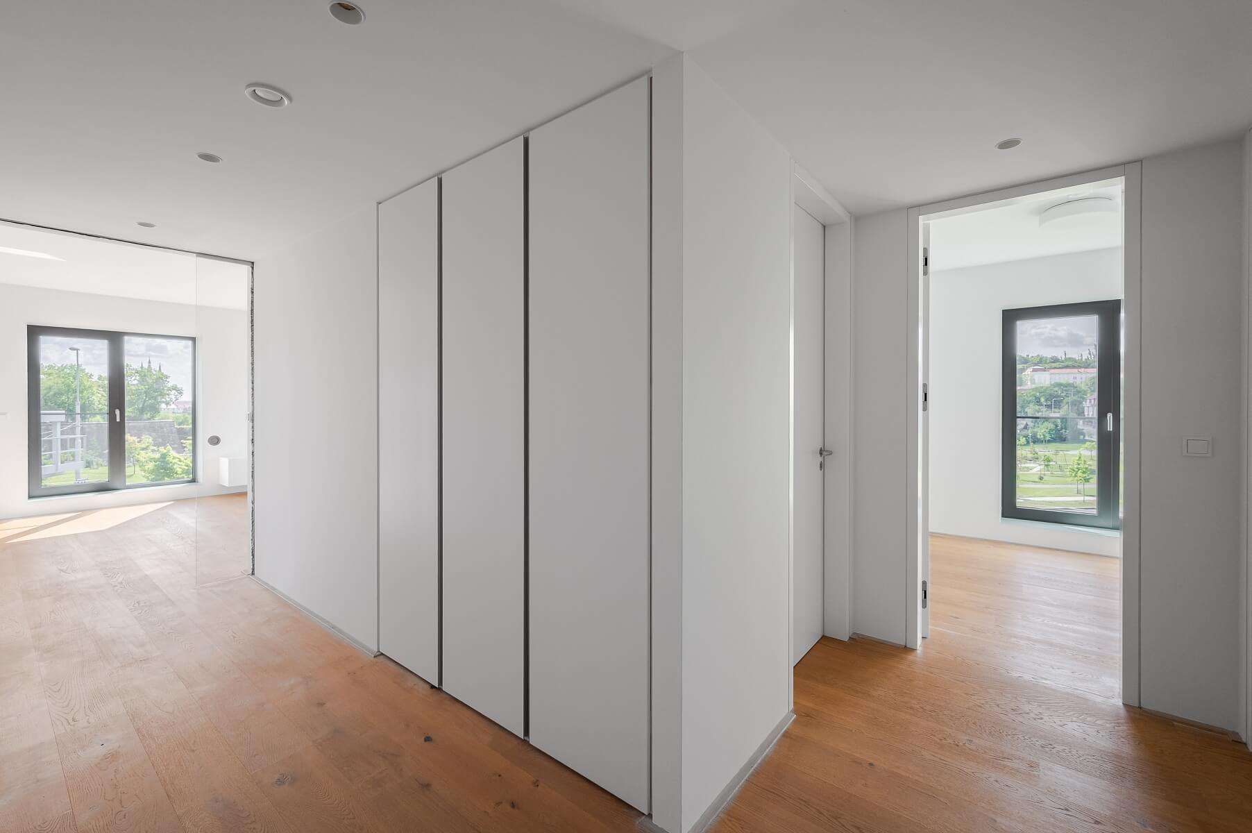 Špičkové materiály, dubové podlahy, dlažba, tropické dřevo na terase, podlahové vytápění, vestavěné skříně, kapilární systém chlazení stropů a větrání s rekuperací tepla, chytré ovládání domácnosti Loxone, hliníková okna s izolačním trojsklem, kuchyňské spotřebiče Miele, videotelefon, alarm, výtah, kamerový systém. Dvě parkovací stání v podzemních garážích zahrnuta v ceně nájmu.