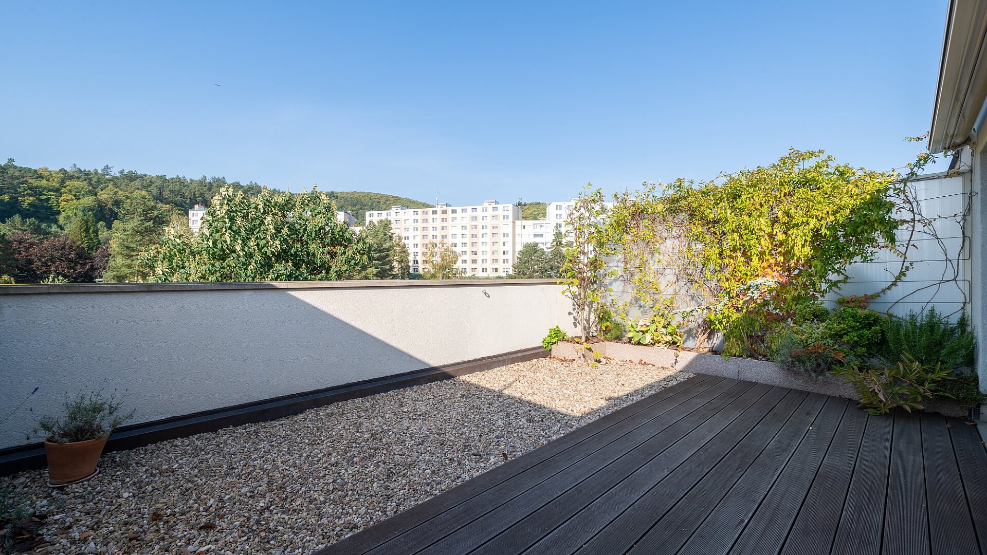 Nabízíme k pronájmu částečně zařízený klimatizovaný mezonetový byt se 2 terasami, 2 balkóny a krásnými výhledy do zeleně ve 2. patře bytového domu v klidně části brněnské čtvrti Jundrov. Budova stojí v pěším dosahu rozlehlé obory Holedná, v lokalitě s dobrou dostupností do centra hromadnou dopravou. Místo nabízí veškerou občanskou vybavenost a služby.
