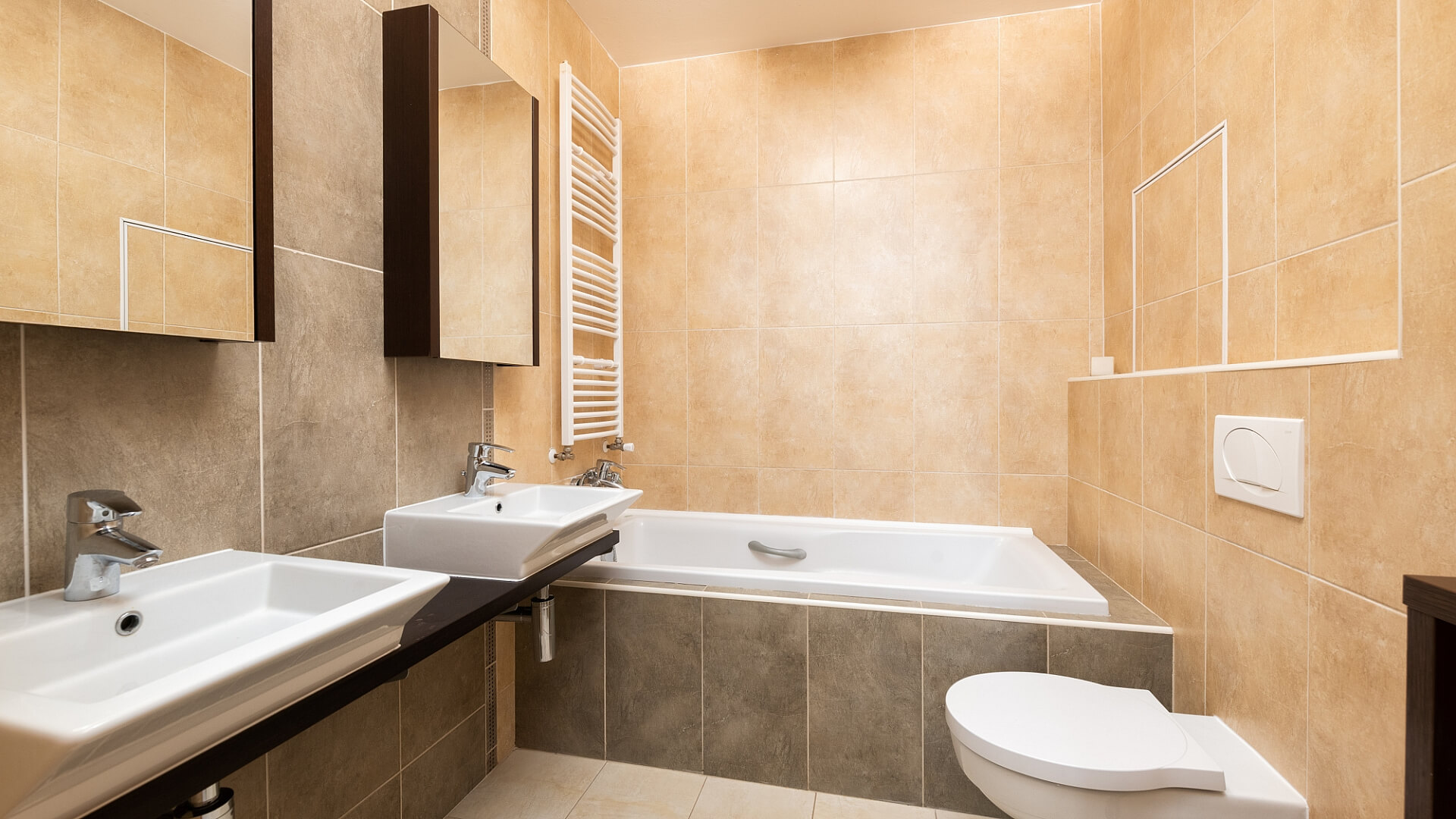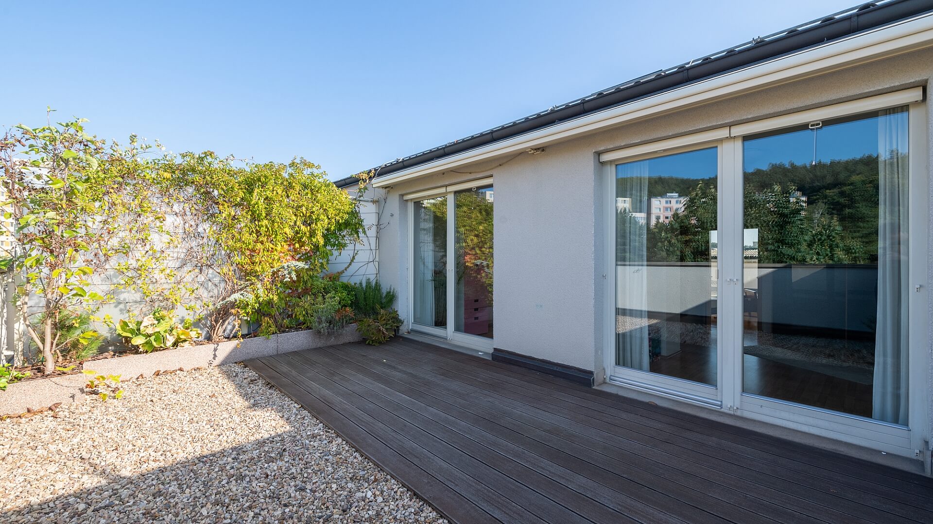 Ve spodní úrovni bytu se nachází obývací pokoj s plně vybavenou kuchyní, jídelnou a přístupem ke dvěma balkónům, koupelna s vanou a toaletou, ložnice, komora a vstupní chodba. V horním patře se nachází dvě ložnice s přístupem na terasu, terasa přístupná z chodby a koupelna se sprchovým koutem a toaletou.
