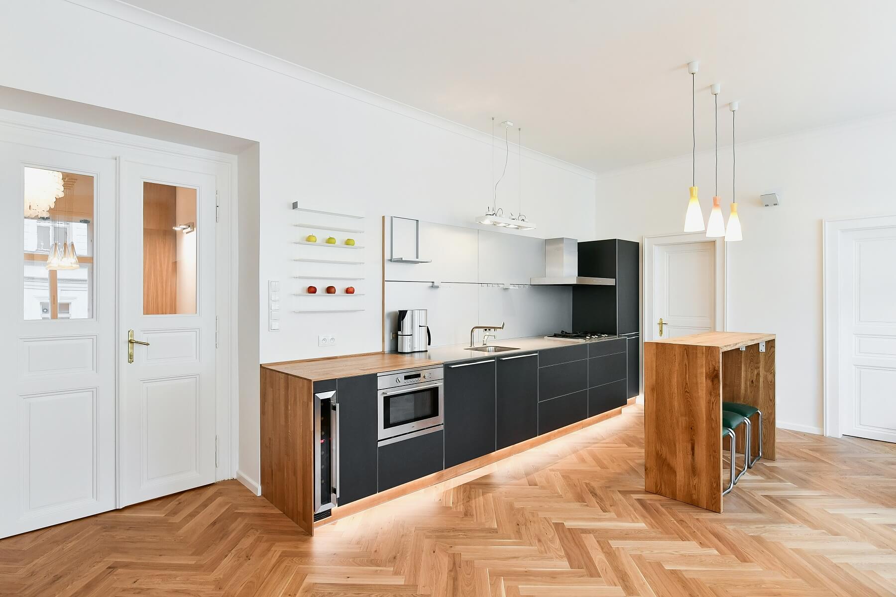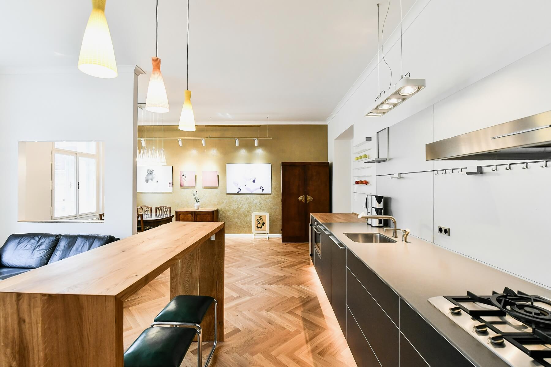 Designový nábytek a vybavení, masivní dřevěné podlahy, velkoformátová dlažba, bezpečnostní vstupní dveře, vestavěné skříně, pračka / sušička, luxusní německá kuchyň zn. Bulthaup, myčka, lednice na víno, přídavný kohoutek s vroucí vodou zn. Quooker, v koupelně sanita zn. Grohe a Villeroy&Boch, TV.