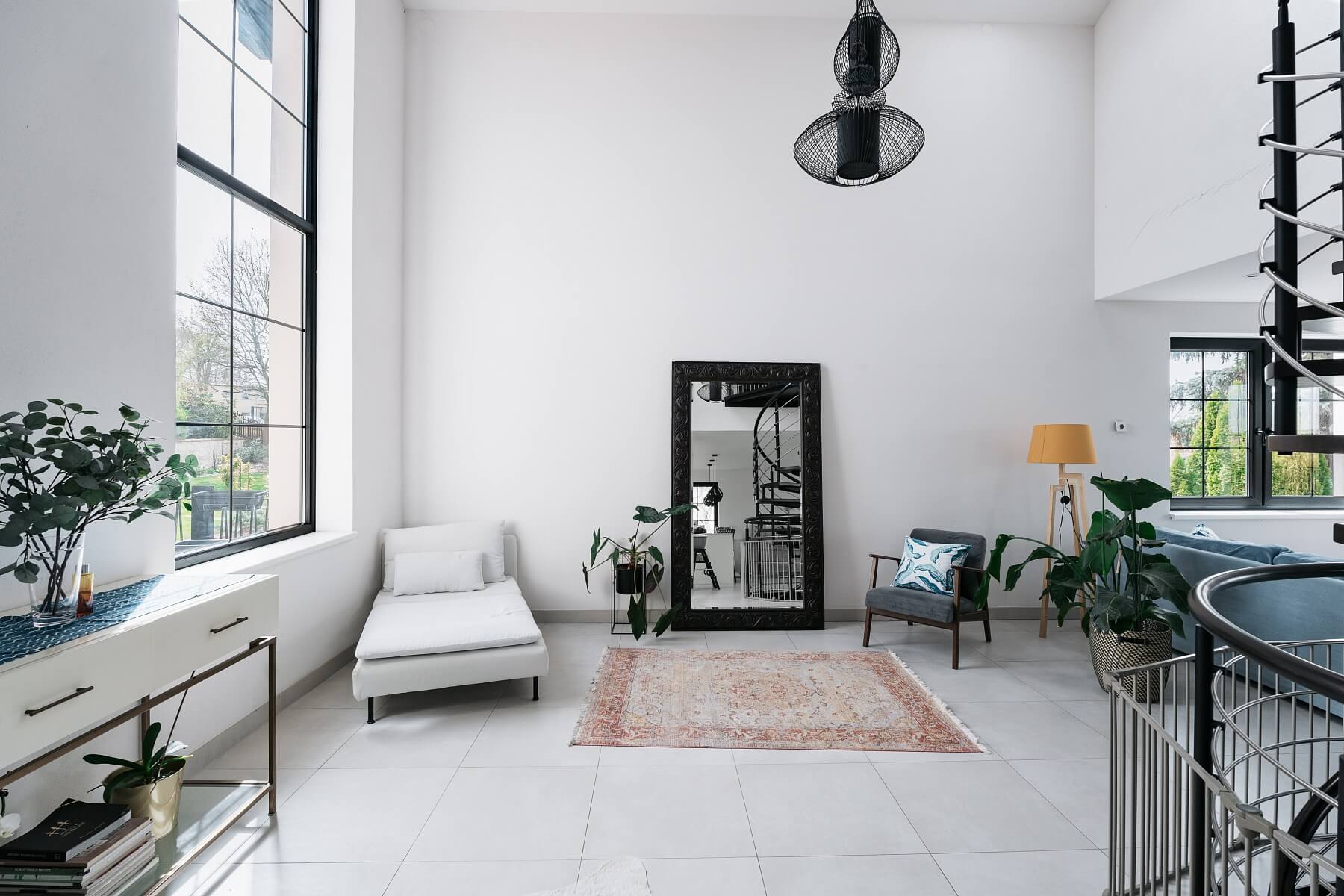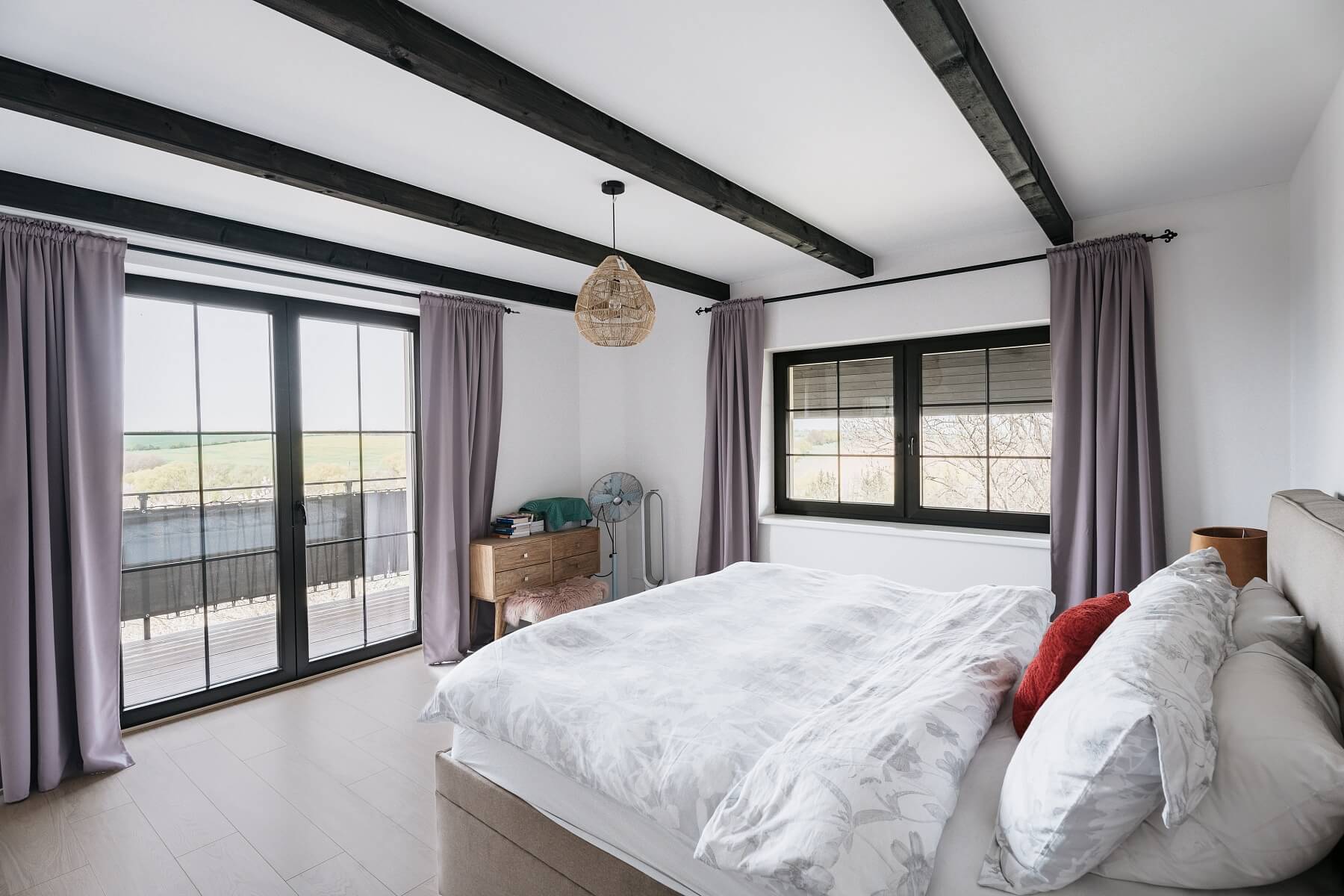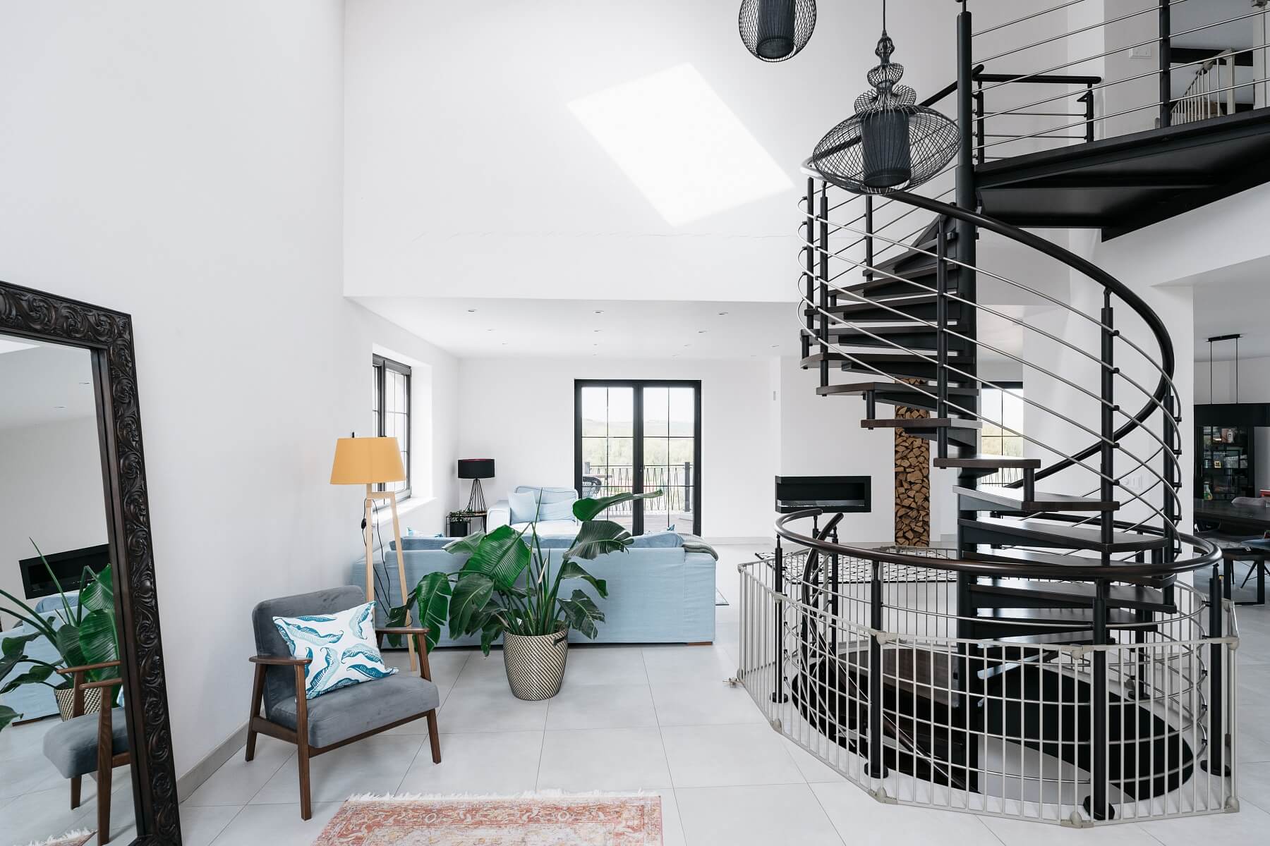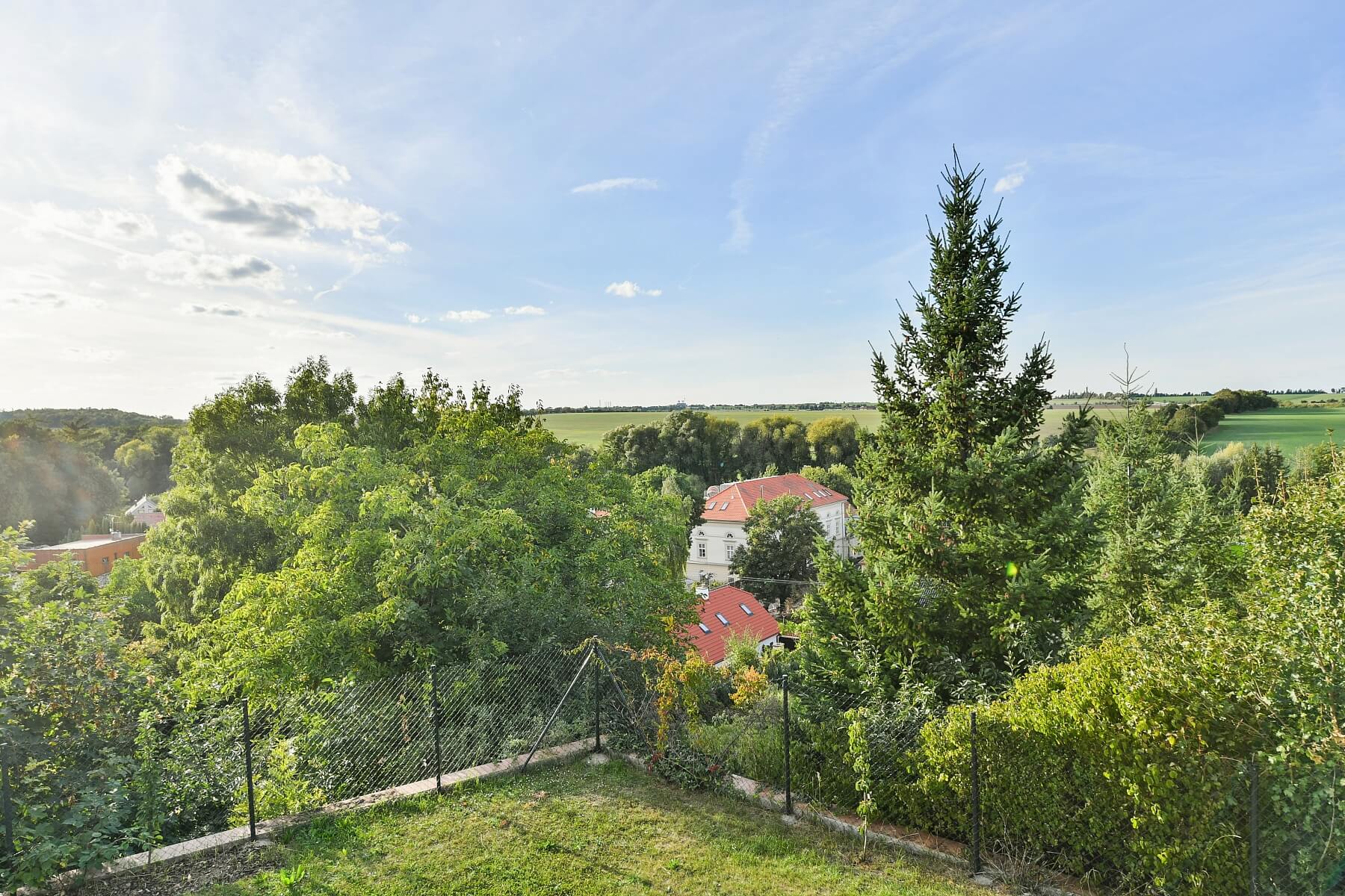 Ve vstupním podlaží je umístěn velký obytný prostor s klenutým stropem, plně vybavenou kuchyní, jídelnou a vstupem na západně orientovanou terasu, odkud je výhled skrz velká francouzská okna až k Českému středohoří. V patře je hlavní ložnice s en-suite koupelnou a západně orientovaným balkonem, druhá ložnice a šatna. V suterénu, který je v úrovni zahrady, je ložnice pro hosty s vlastní koupelnou, společenská místnost, sklep (s teplotou vhodnou na úschovu vína), technická místnost a vstup do garáže s vyhřívanou podlahou a elektricky ovládaným vstupem. Je zde také prádelna s pracovní linkou a dřezem. Pod střechou je velký úložný prostor.