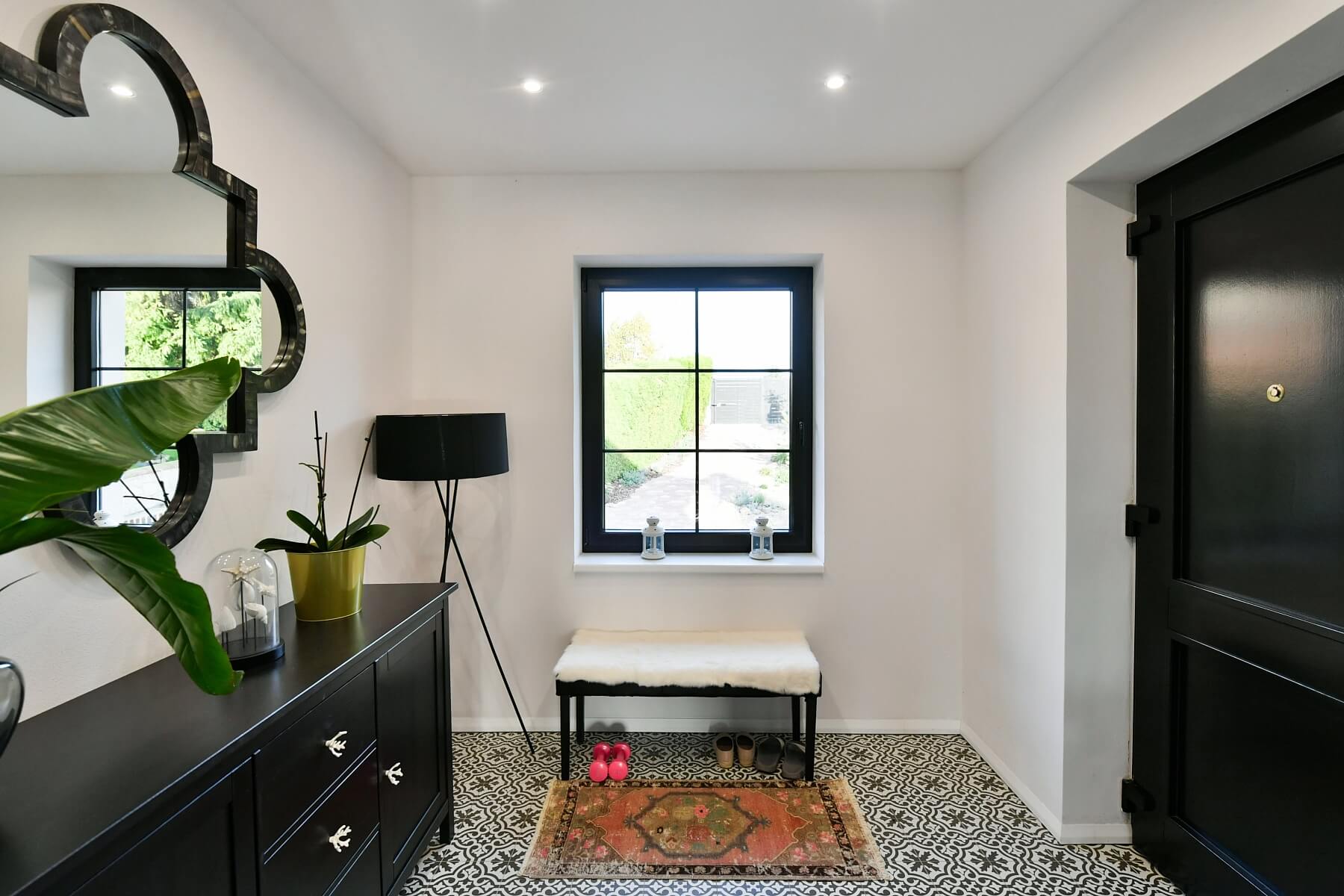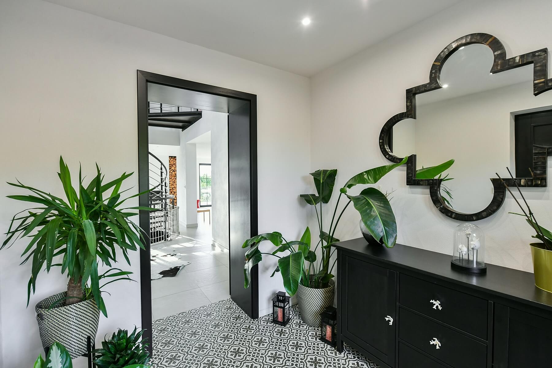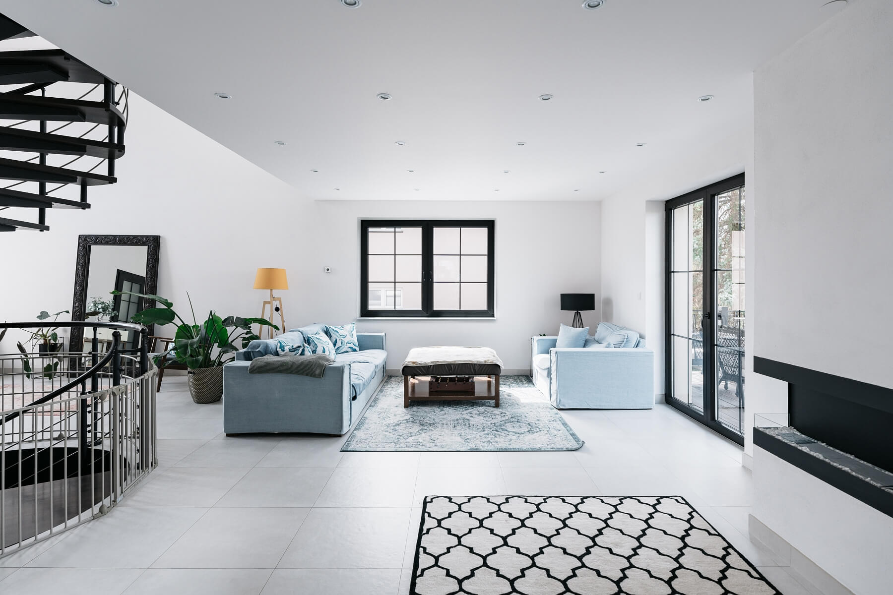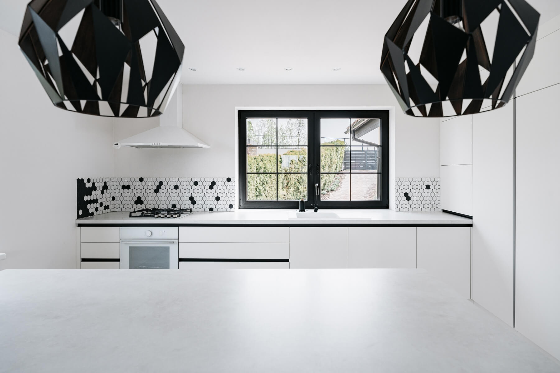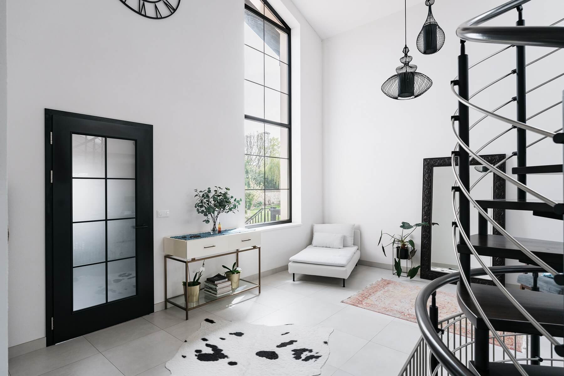 Ve vstupním podlaží je umístěn velký obytný prostor s klenutým stropem, plně vybavenou kuchyní, jídelnou a vstupem na západně orientovanou terasu, odkud je výhled skrz velká francouzská okna až k Českému středohoří. V patře je hlavní ložnice s en-suite koupelnou a západně orientovaným balkonem, druhá ložnice a šatna. V suterénu, který je v úrovni zahrady, je ložnice pro hosty s vlastní koupelnou, společenská místnost, sklep (s teplotou vhodnou na úschovu vína), technická místnost a vstup do garáže s vyhřívanou podlahou a elektricky ovládaným vstupem. Je zde také prádelna s pracovní linkou a dřezem. Pod střechou je velký úložný prostor.